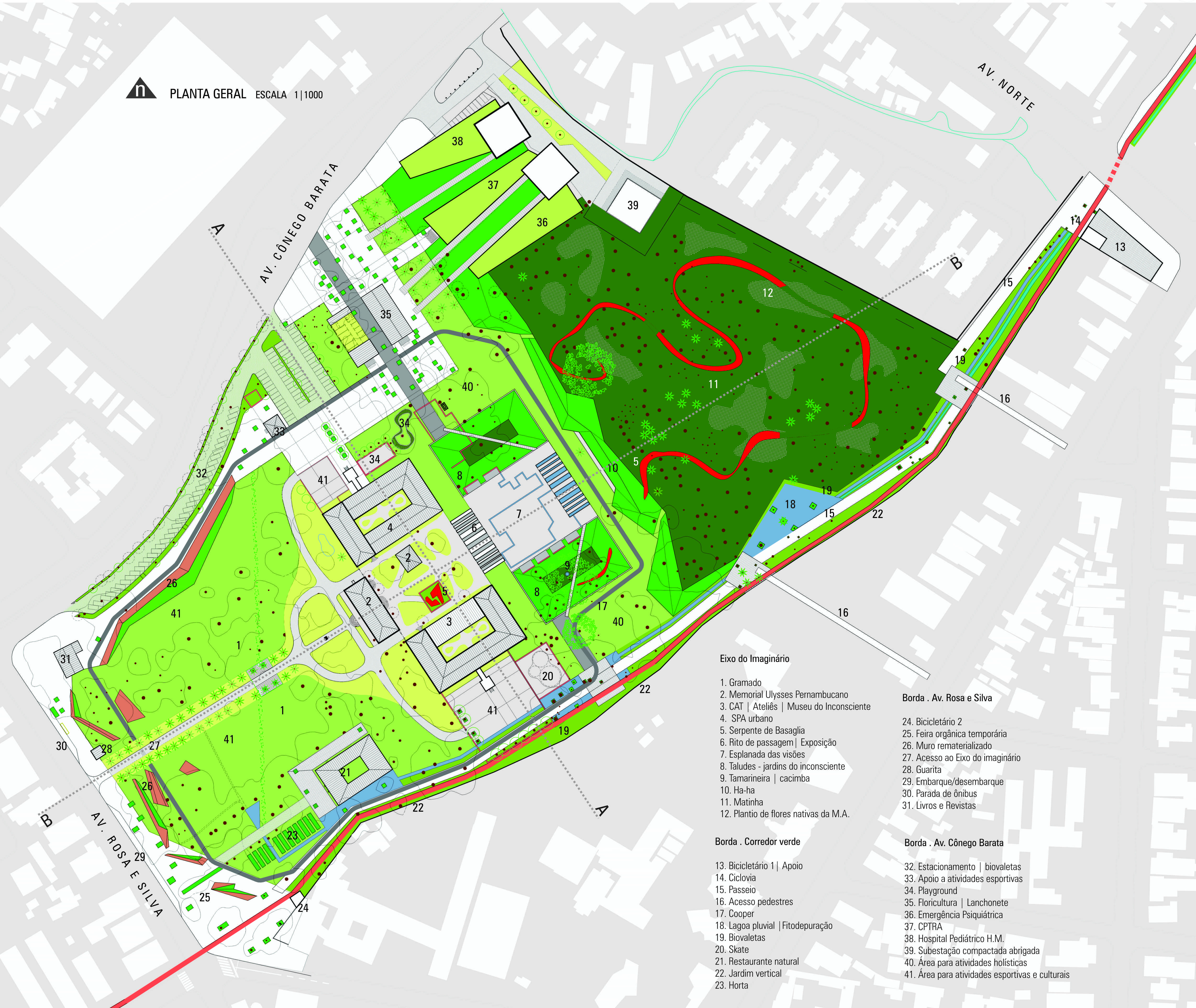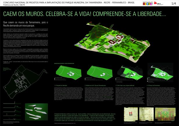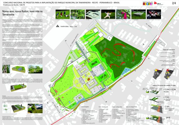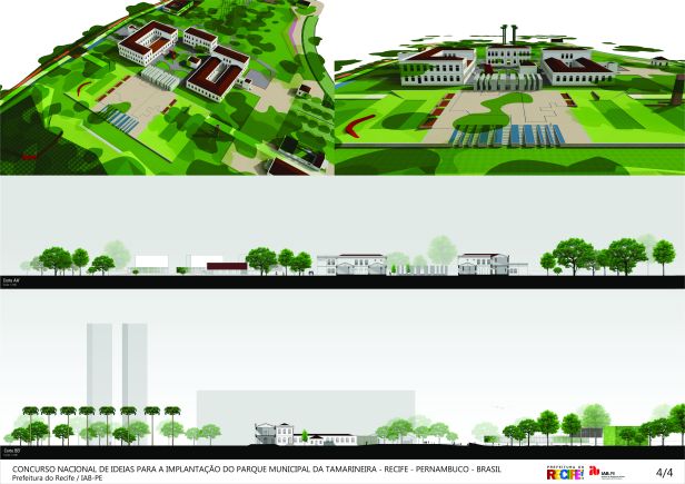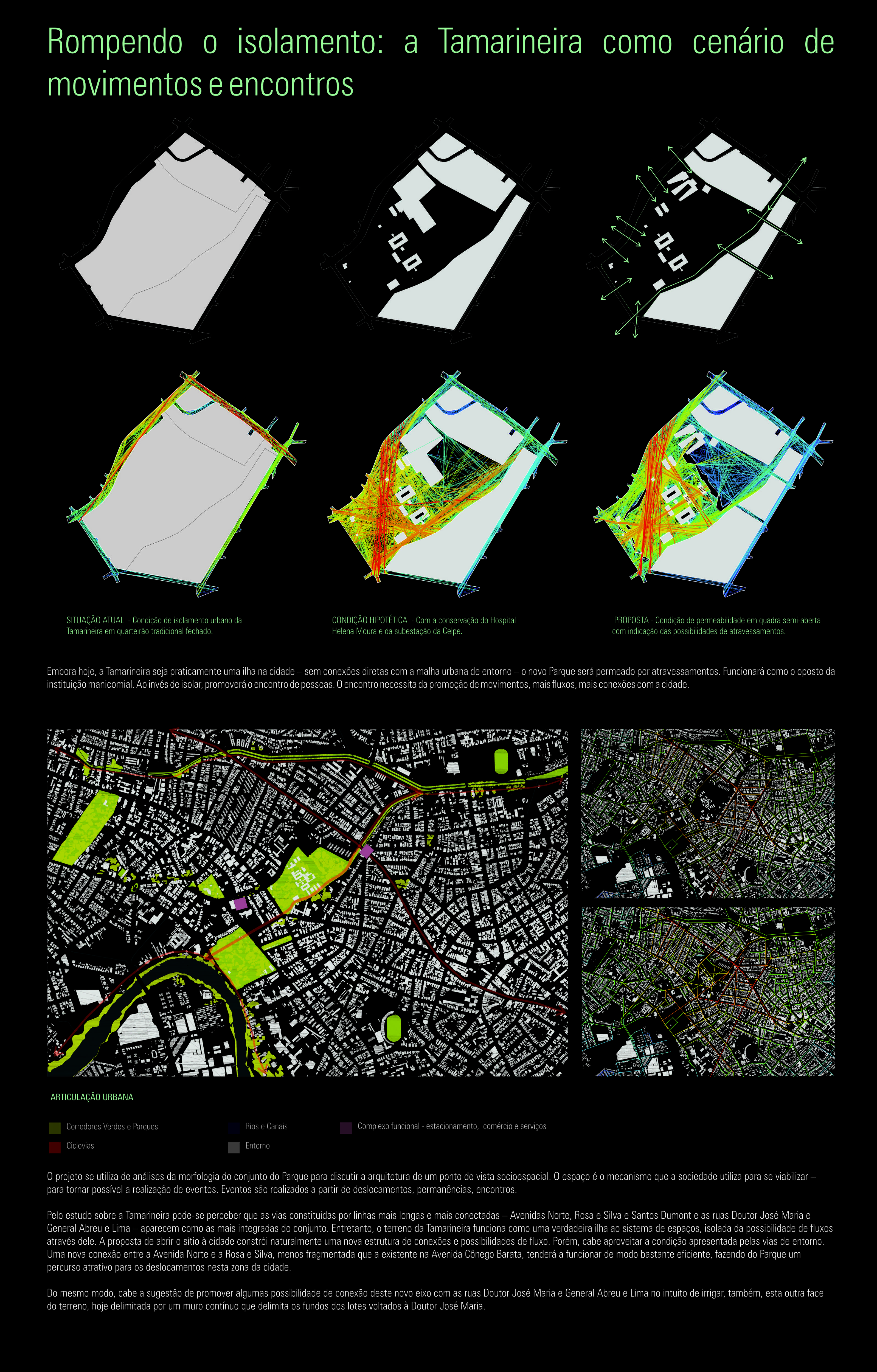 (a) a abertura de visadas, a liberação do terreno para o uso público, a constituição de conexões com a malha urbana – ideia é ter o novo Parque da Tamarineira como um elemento programaticamente diverso, contribuindo para a capacidade de circulação de pedestres e ciclistas através da cidade com um qualidade ambiental referencial;