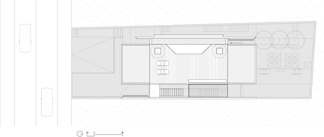 O local onde está projetada essa residência não se notabiliza por qualidades urbanísticas especiais; a fachada principal é quase que inteiramente fechada; a relação com a área externa é primordialmente através dos fundos da edificação e sua vista para a Serra. O espaço de convivência familiar no pavimento térreo foi desenhando como um amplo espaço fluído que se volta para a vista da reserva de mata atlântica. No primeiro pavimento, o dormitório do casal também se beneficia dessa paisagem; o painel em pele metálica desse espaço pode se fechar completamente, proporcionando privacidade a esse ambiente, assim como pode ter alguns dos seus módulos abertos para liberar visual em direção a vigorosa paisagem da Cantareira.