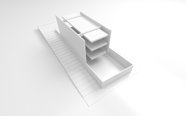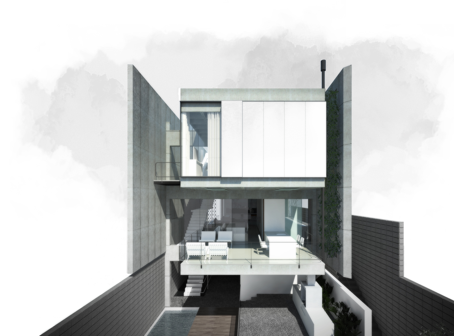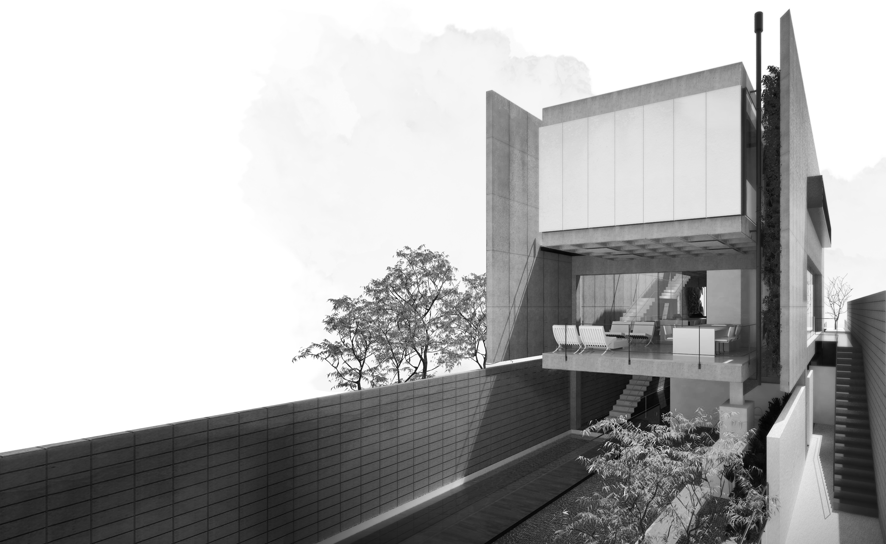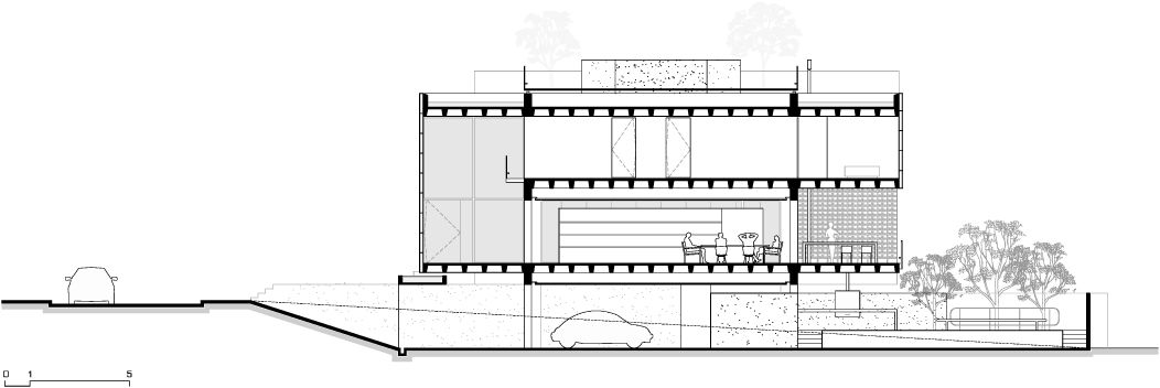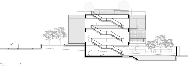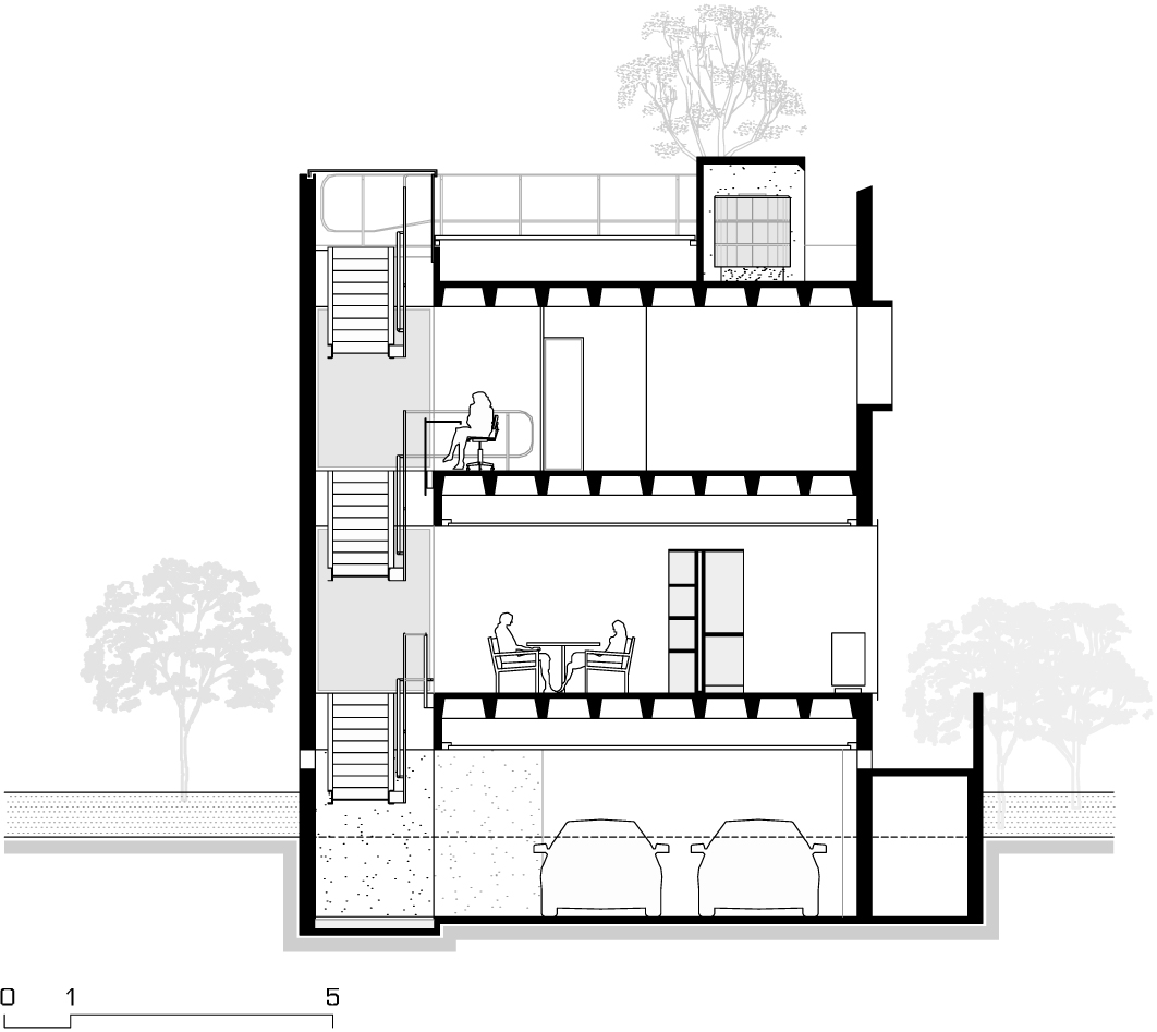 A inexistência de recuo no alinhamento leste do lote acaba por gerar uma grande superfície da residência sem possibilidade de aberturas laterais para o exterior. Decidiu-se concentrar as escadas de circulação vertical junto a esse alinhamento, rompendo completamente o volume edificado de cima abaixo, do nível da cobertura ao nível do semi-enterrado. Essa solução cria um fosso que conduz luz zenital até os pavimentos mais inferiores da casa. A escada acaba servindo ainda como um rebatedor de luz para os forros de todos os pavimentos, ajudando a propagar a iluminação natural para o interior da casa.