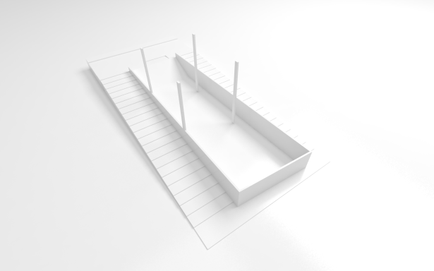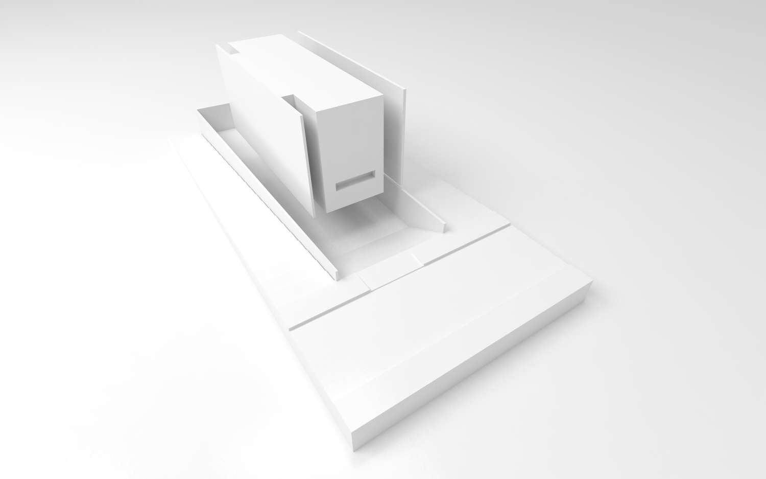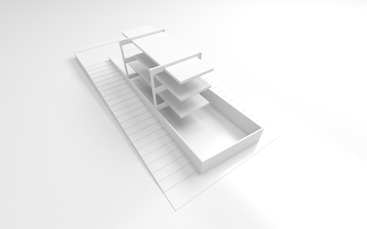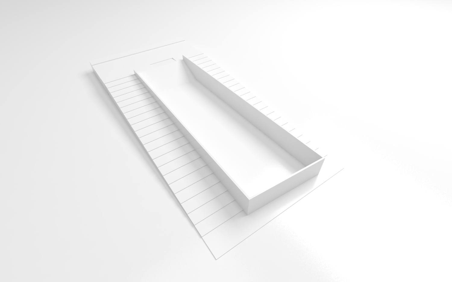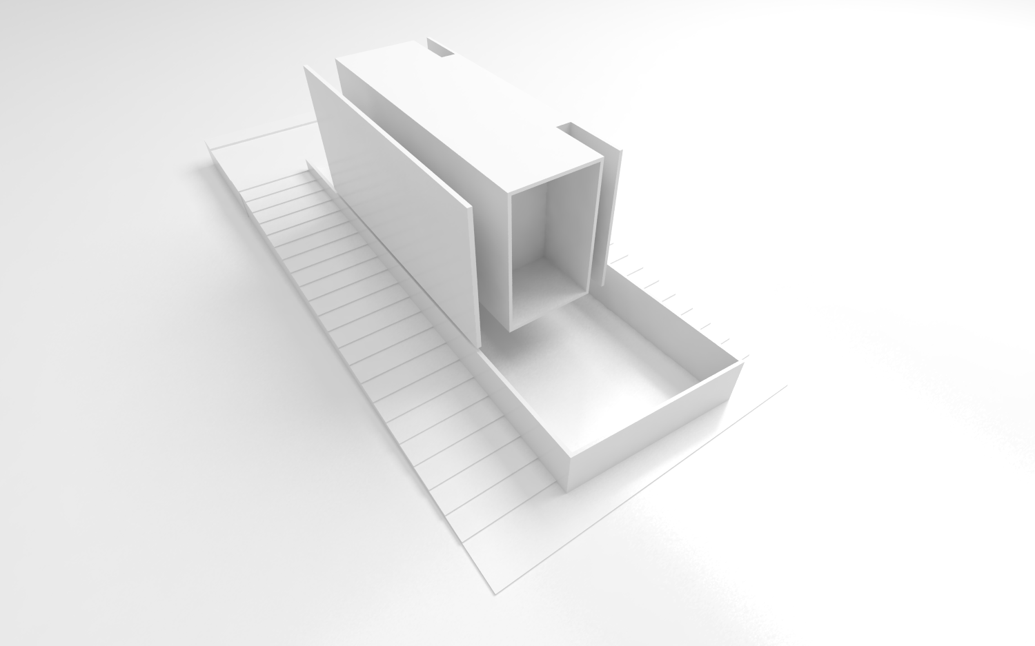 A inexistência de recuo no alinhamento leste do lote acaba por gerar uma grande superfície da residência sem possibilidade de aberturas laterais para o exterior. Decidiu-se concentrar as escadas de circulação vertical junto a esse alinhamento, rompendo completamente o volume edificado de cima abaixo, do nível da cobertura ao nível do semi-enterrado. Essa solução cria um fosso que conduz luz zenital até os pavimentos mais inferiores da casa. A escada acaba servindo ainda como um rebatedor de luz para os forros de todos os pavimentos, ajudando a propagar a iluminação natural para o interior da casa.