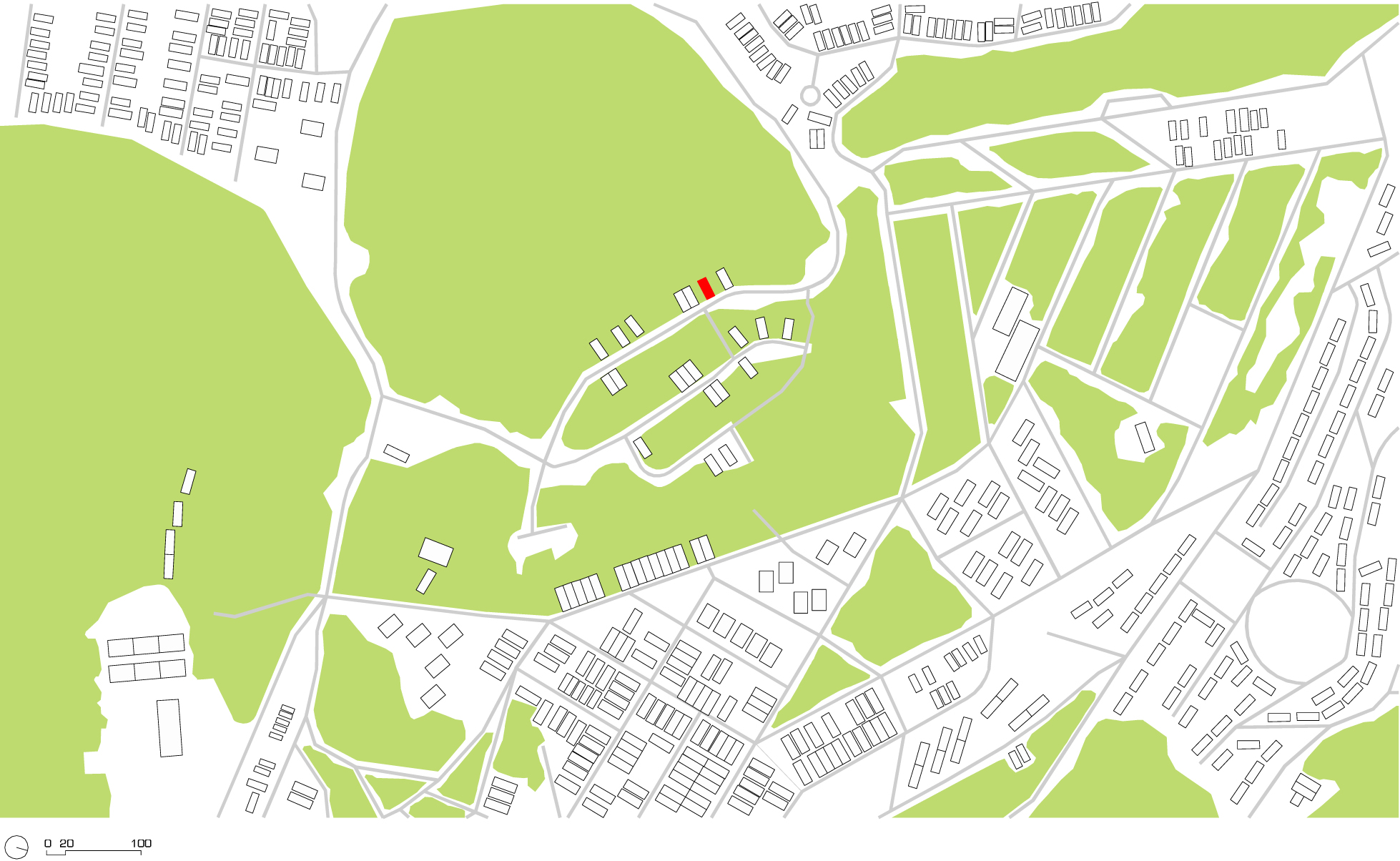 O volume da residência “encosta” em uma das laterais do lote e respeita recuo de 1,5m na outra lateral. Nesse loteamento, as casas são edificadas, na sua maioria, liberando a face lateral leste para aproveitar a melhor condição de insolação e abertura de janelas. Optou-se, na implantação na casa projetada, por espelhar essa ocupação recorrente, o que proporcionaria como benefício um afastamento de3 mda edificação vizinha lateral.