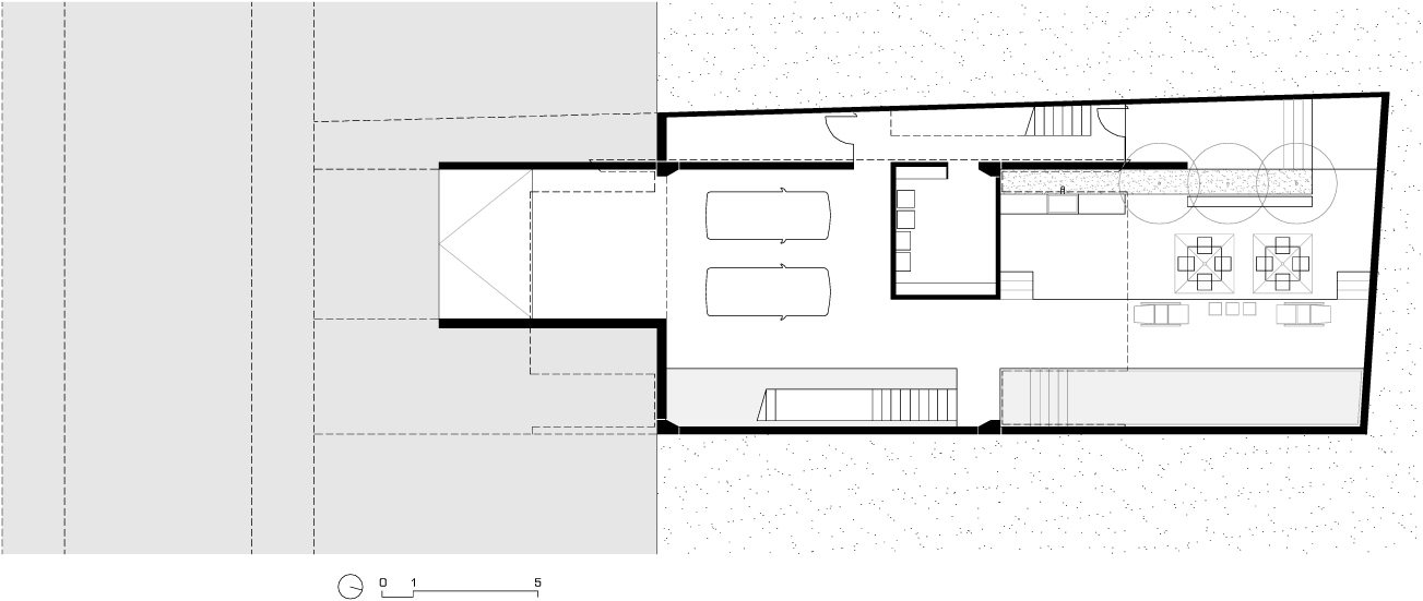 Os pavimentos do semi-enterrado e da cobertura funcionam como um sistema de áreas de recreação, à maneira de quintais. No pavimento semi-enterrado temos um quintal a sombra, meia sombra e sol, enclausurado pelos muros de divisa. Já o pavimento da cobertura compõe um quintal a pleno sol, com ligações visuais para a Serra da Cantareira. Nesses dois pavimentos encontramos arvoretas de frutas tropicais, compondo pequenos pomares.