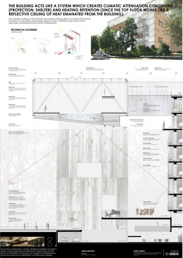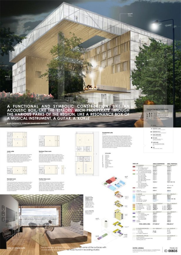 A proposta é inventiva em seu conceito arquitetônico, bem elaborada, atende ao programa e às regras do concurso e tem uma das apresentações mais completas. Apresenta um nível profissional elevado,a julgar pela bela e certeira solução arquitetônica. A composição arquitetônica, a materialidade natural e a qualidade do detalhamento se destacam, de forma equilibrada. A estratégia de projeto é clara e o conceito é baseado essencialmente nas condições locais, características do terreno e o tema musical. De forma agradável, a solução induz até mesmo os que simplesmente passam pelo local a participarem dos eventos a serem organizados no pátio elevado, destacando a importância da comunidade local para o novo hotel. No entanto, a visibilidade dos músicos e artistas em relação ao público precisa ser mais desenvolvida.