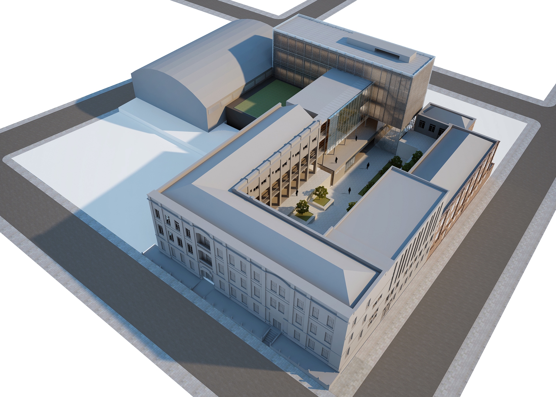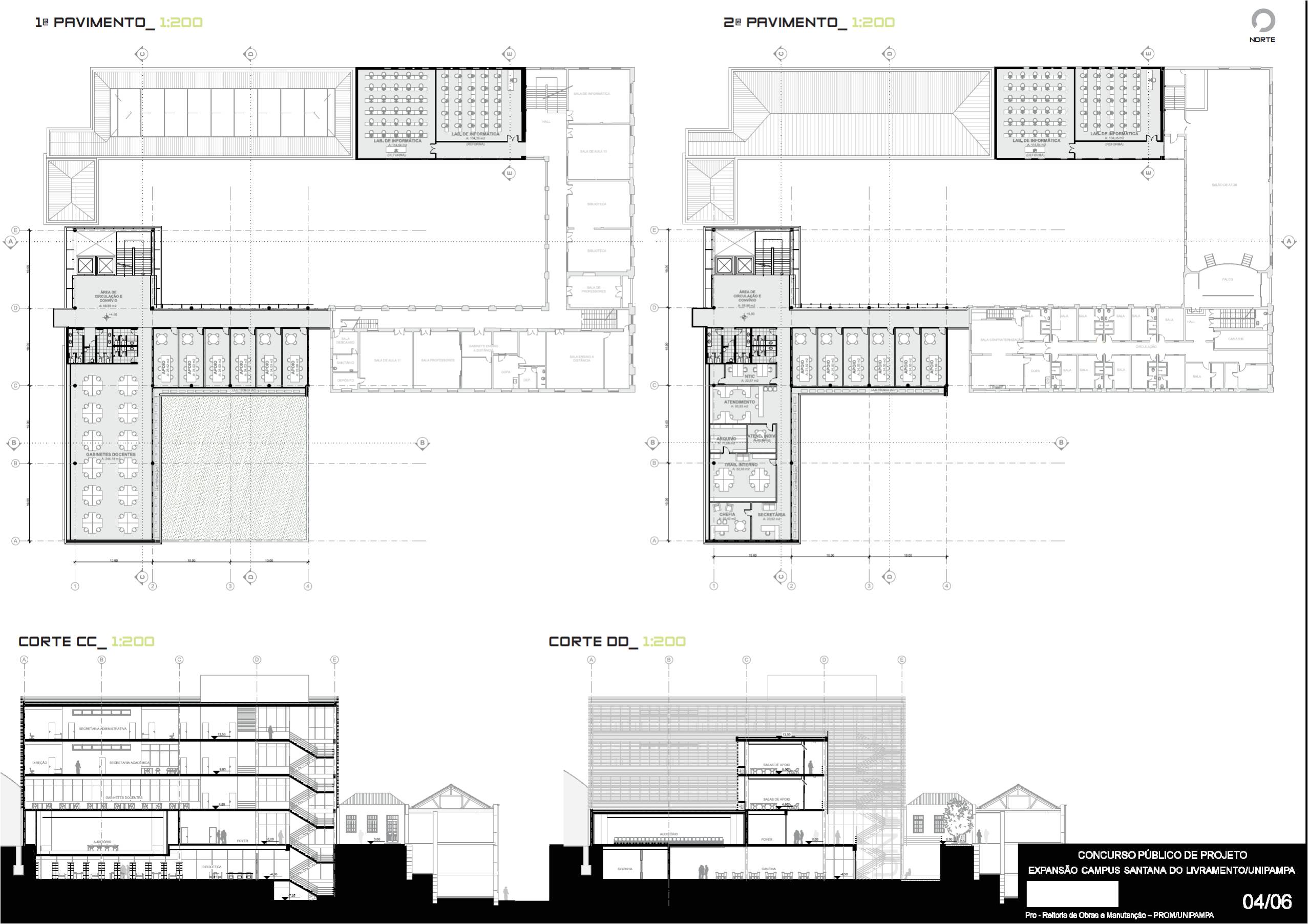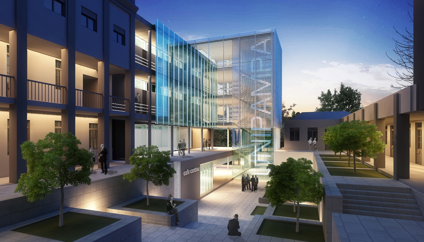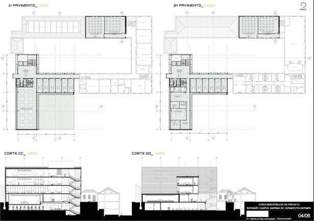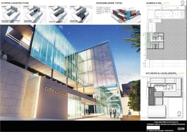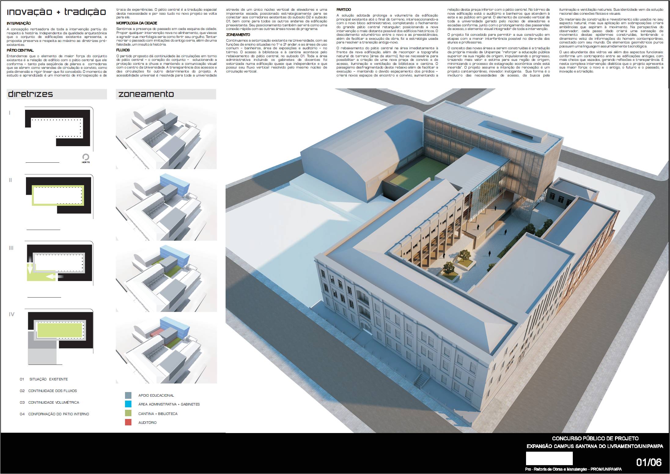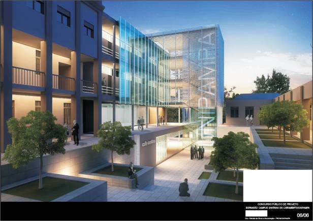 A concepção norteadora de toda a intervenção partiu do respeito à história e para tanto a proposta visa preservar e respeitar ao máximo as diretrizes da pré-existência. Compreendemos que o elemento de força maior do conjunto existente é a relação do edifício com o pátio central que ele conforma. Portanto, tudo no novo projeto se volta para ele. A solução adotada na proposta é prolongar a volumetria da edificação principal existente até o final do terreno, interseccionando-a com o novo bloco administrativo, completando o fechamento do grande pátio central retangular. Para resolver a transição entre novo e antigo, é usada a estratégia de descolamento entre as volumetrias. Com isso, dá-se continuidade às circulações em torno deste pátio mantendo a comunicação visual com o centro do conjunto. A acessibilidade universal é resolvida para toda a universidade através de um único núcleo vertical de escada e elevadores, posicionados estrategicamente para se conectar aos corredores existentes do subsolo 02 e subsolo 01, bem como para todos os outros andares da edificação pré-existente e da nova intervenção. Mantivemos a setorização existente da Universidade, com as funções de ensino situadas no 1º e 2º andares, e as áreas de uso comum – banheiros, área de exposições e auditório – no térreo. O rebaixamento do pátio central na área imediatamente à frente da nova edificação fez-se necessária para possibilitar a criação de uma nova praça de convívio e de acesso, iluminação e ventilação da biblioteca e cantina. O paisagismo deste rebaixo além de facilitar a execução, mantendo o devido espaçamento dos prédios antigos, criará novos espaços de encontro e convívio da universidade. Toda a área administrativa e os gabinetes de docentes foram setorizadas numa única edificação quase que independente e que possui seu fluxo vertical resolvido pelo mesmo núcleo de circulação vertical. Materiais e revestimentos são usados no seu estado quase que bruto, assumindo a contemporaneidade da intervenção. O uso abundante do vidro gera um contraponto entre as edificações antigas, com mais cheios que vazados, gerando reflexões e transparências na proposta. É nesta complexa intervenção dialética que o projeto apresenta sua maior força: o novo e o antigo, o futuro e o passado, a inovação e a tradição.