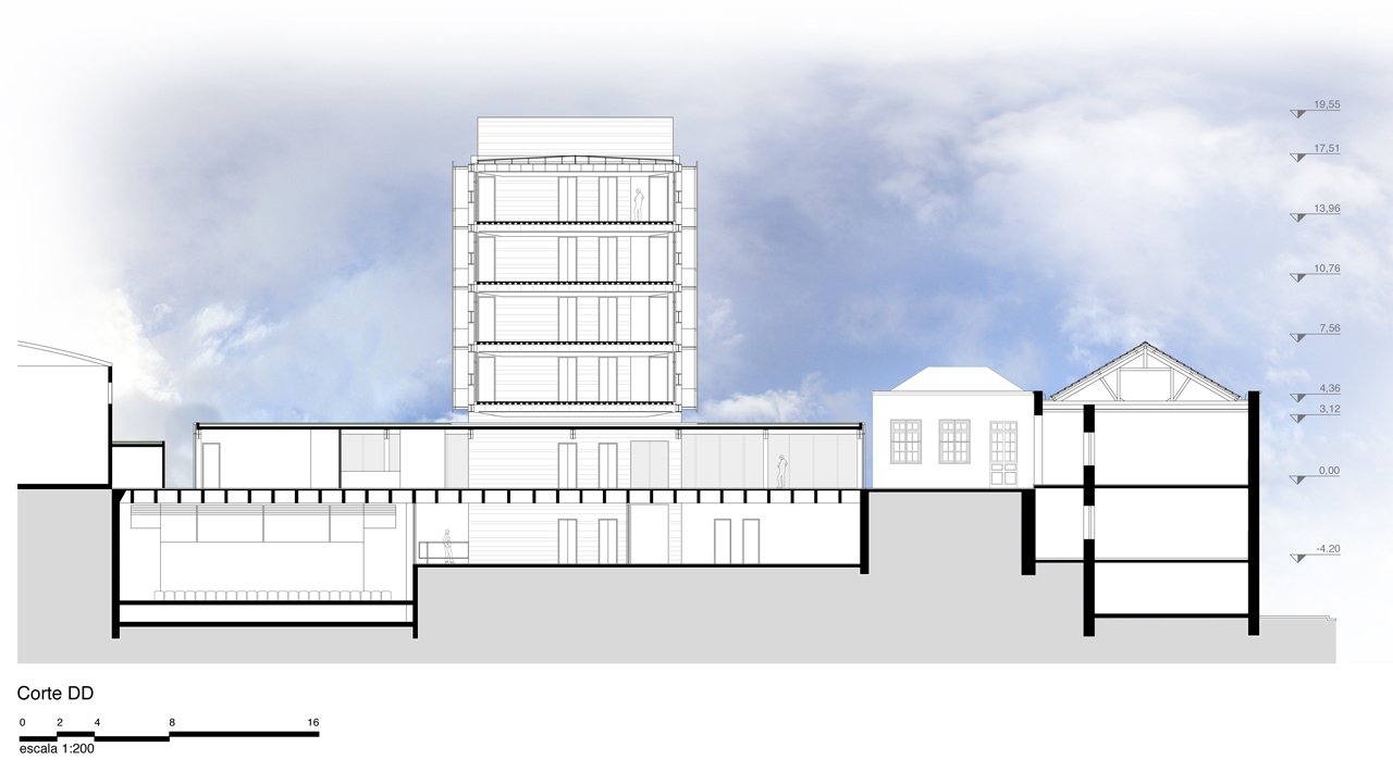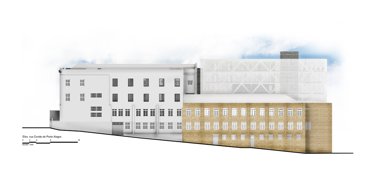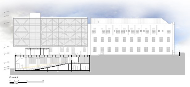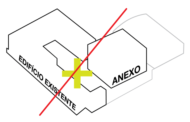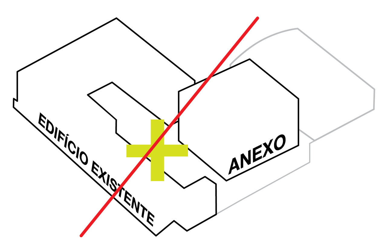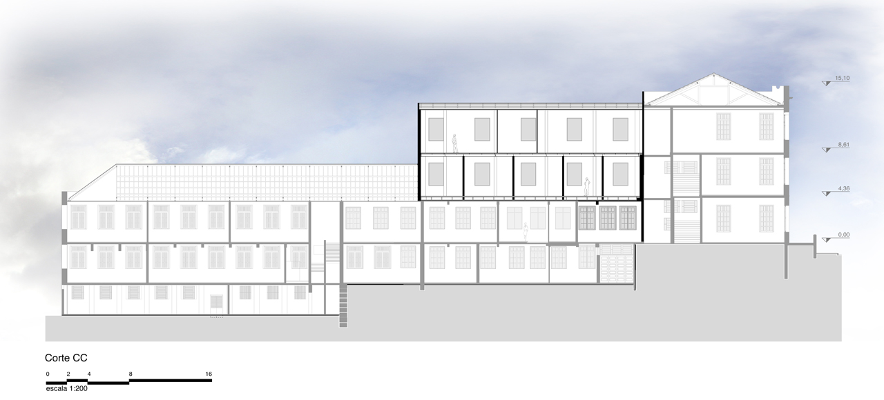 A alteração da edificação existente ocorre pela adição em sua forma tipológica, num continuo do existente e num desdobramento da cota de seu pátio.