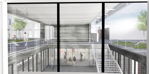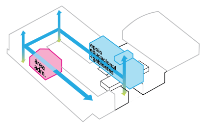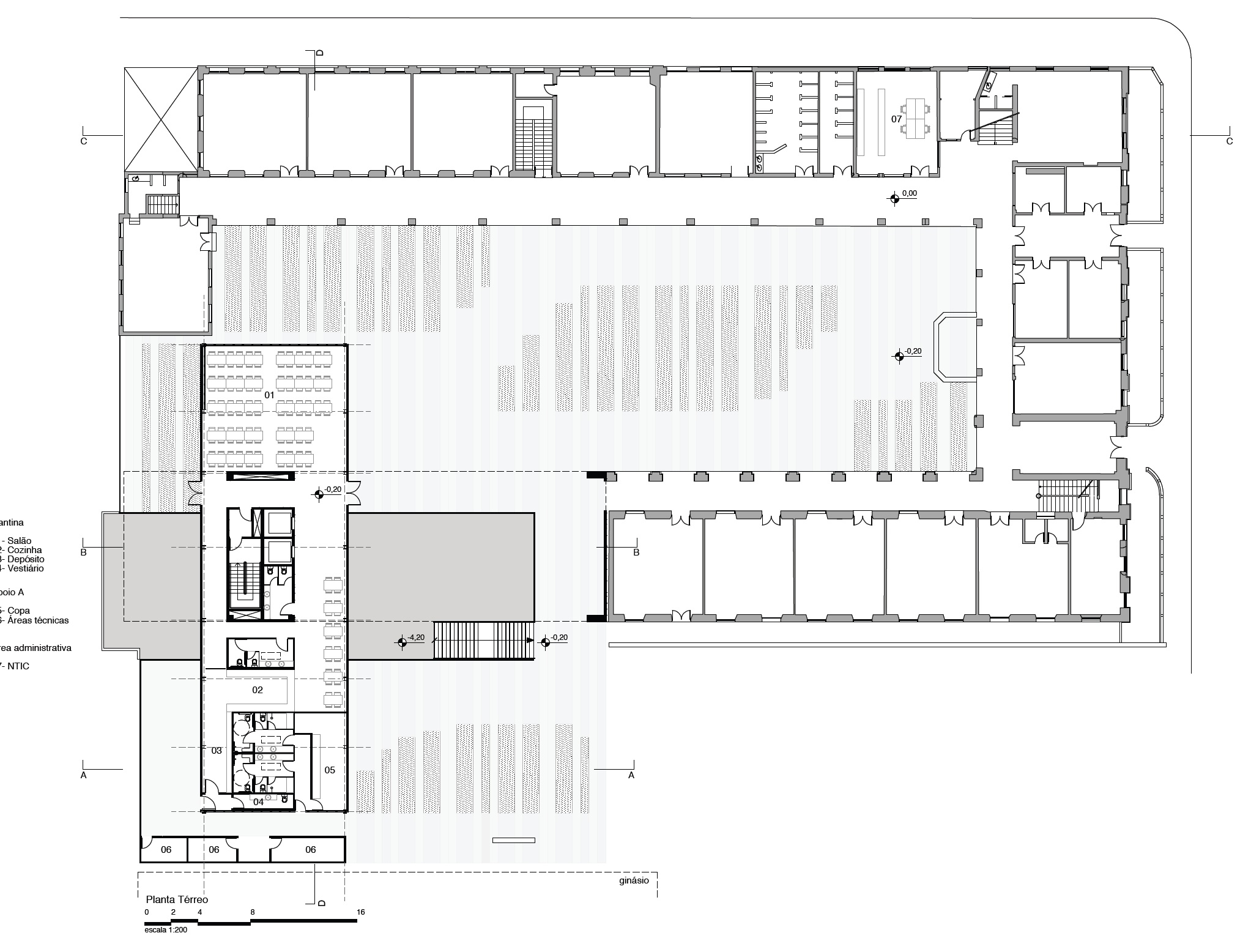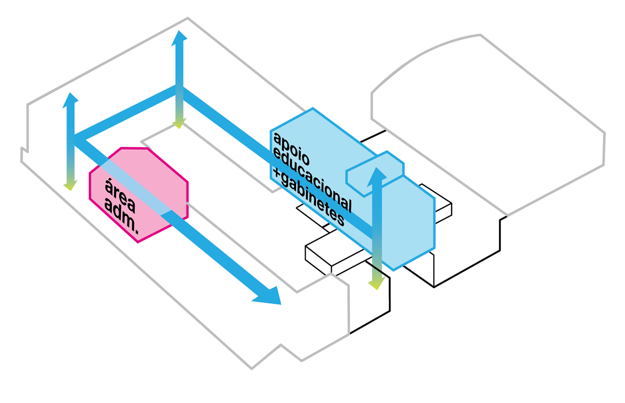 A cantina, local de encontro entre docentes e alunos, é a função programática que ocupa o térreo e configura a transição entre o aditivo educacional, a biblioteca e o auditório. Os dois últimos, por sua vez, encontram-se abaixo do nível do pátio, possibilitando uma independência construtiva assim como maior clareza funcional. O Auditório conecta-se, também, com a edificação de 1908 em sua cota mais inferior, viabilizando um acesso secundário para ocasiões especiais. A biblioteca, oposta ao auditório, abre-se para o pátio inferior e recebe iluminação indireta através de sheds sob bancos dispostos no pátio principal. A área administrativa está inteiramente no antigo ginásio Maristinha, perto de seu acesso existente. Utilizou-se o pé direito maior para a integração da área administrativa na edificação existente com uma reformulação da fachada.