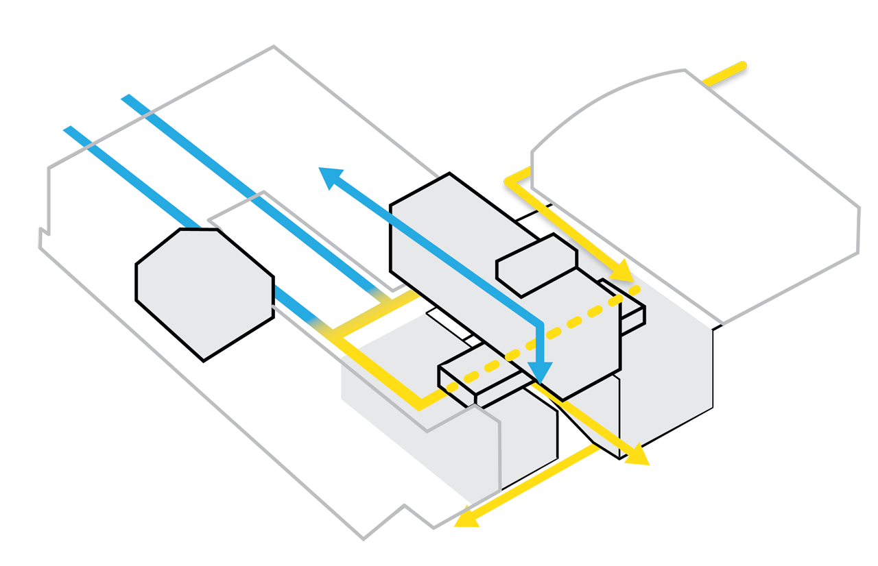 A edificação para Cantina foi resolvida estruturalmente em aço, visando diminuir o peso sobre a estrutura do piso térreo e permitir uma construção rápida e em qualquer tempo, sobre o piso em grelha de concreto armado. Os pilares de aço partem das vigas da grelha por meio de conectores articulados, e conectam-se rigidamente a uma grelha de vigas de aço seção “I” da cobertura da edificação – o que elimina a necessidade de panos de contraventamento em “X”. Sobre as vigas da cobertura serão colocadas lajes “steel deck”, com rigidez suficiente para não exigir escoramentos durante a concretagem, e com inércia e resistência atendendo aos pesos do telhado verde especificado pela arquitetura.