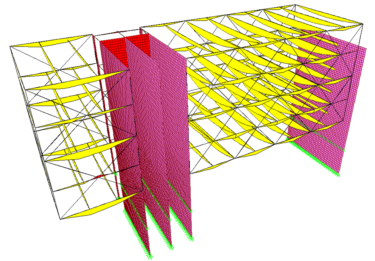A partir de paredes estruturais de um núcleo central, em concreto armado, e de pilares conectados por uma parede de concreto armado junto ao edifício existente – contendo ali as perfurações necessárias à passagem do edifício existente para o edifício novo – as duas fachadas longitudinais em módulos triangulares da edificação, em composição de perfis CVS 400×125 em aço MR250, partem para resolver o vão e balanço da volumetria. As treliças, estando alinhadas à espessura das paredes de concreto – com dimensões maiores na direção das treliças – têm ali também a estabilização lateral nessa direção, para o efeito do vento. Pelo desenho triangular as barras diagonais estarão sujeitas principalmente à tração ou compressão, que são esforços econômicos; os montantes, por receberem os carregamentos das vigas dos pavimentos não somente nos nós, terão, além dos esforços normais, momento fletor, que foram assimilados pela dimensão citada.