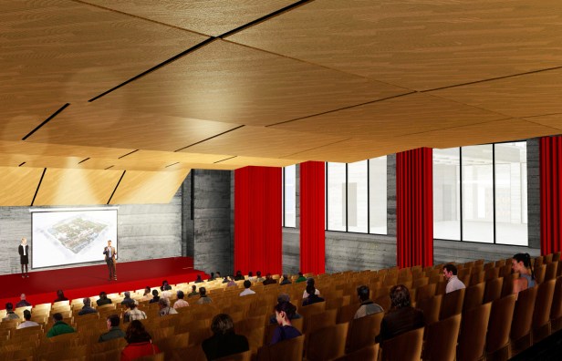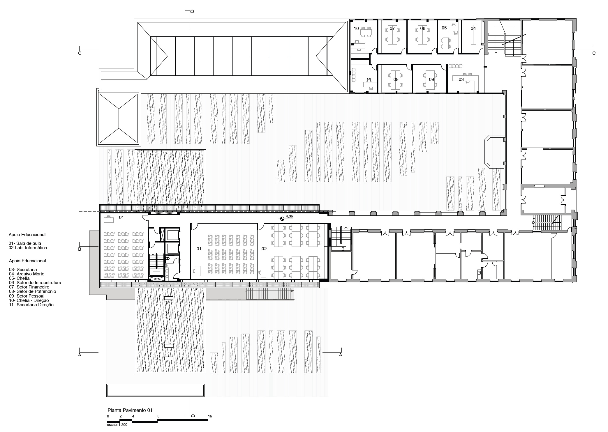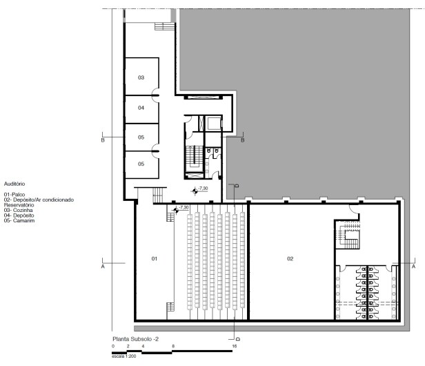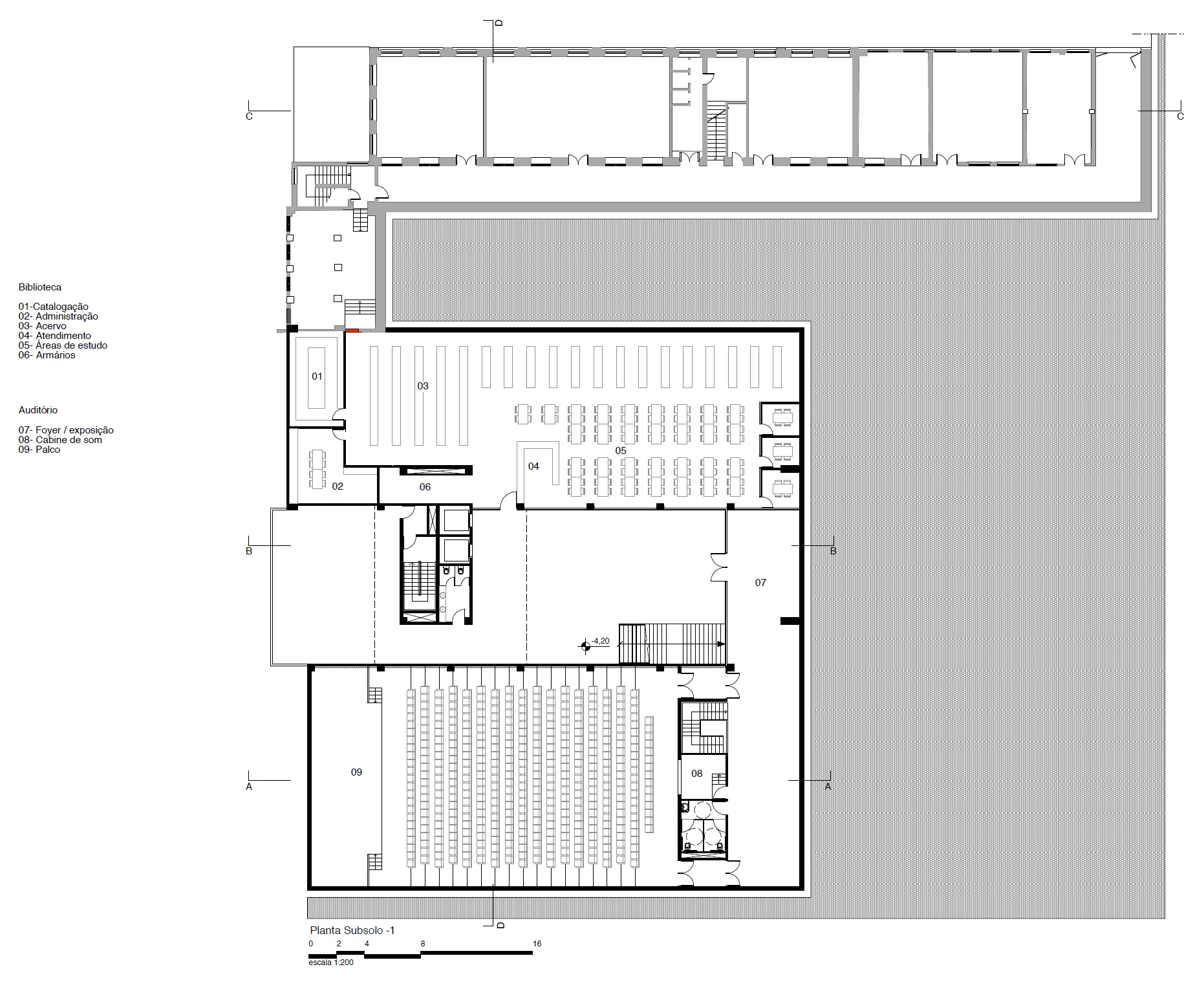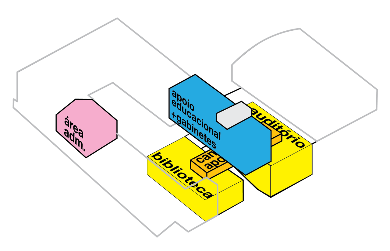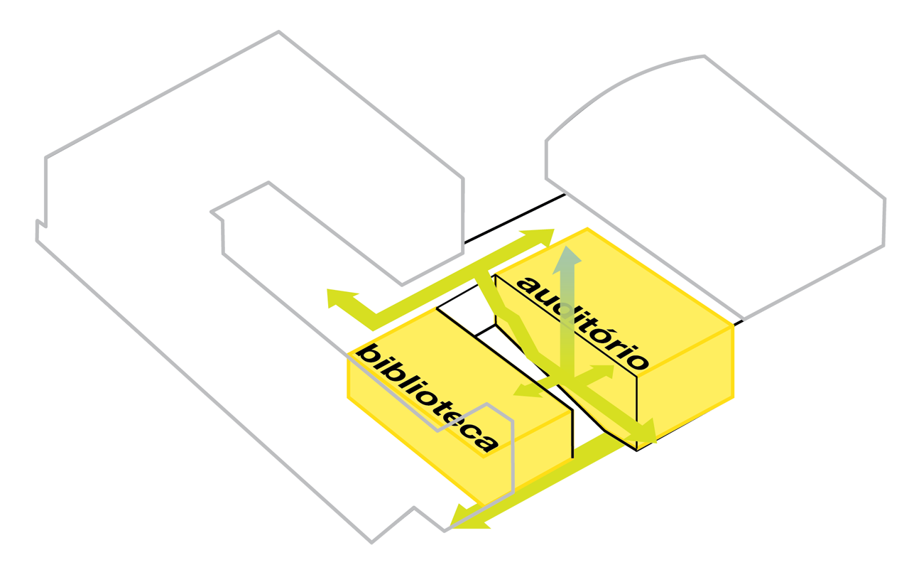 O térreo desdobra-se em sua cota inferior, possibilitando a conexão física entre auditório e biblioteca, um foyer aberto contíguo visualmente à cantina.