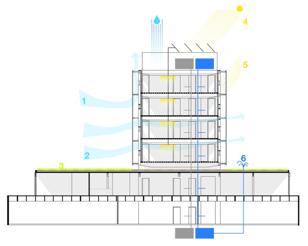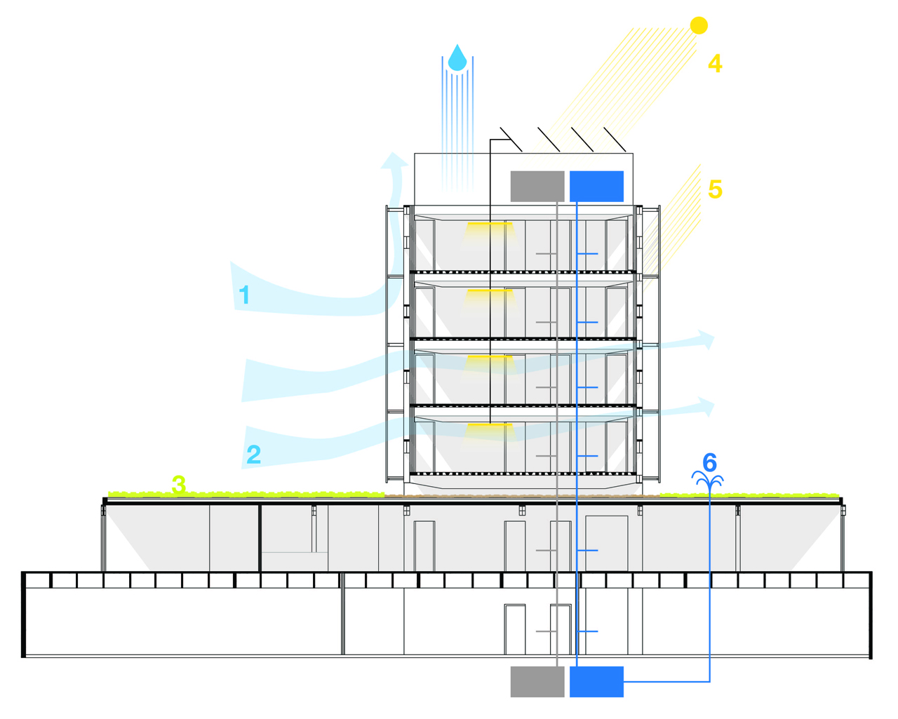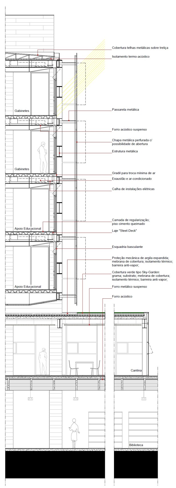 Dentro das características do projeto proposto se integram soluções direcionadas para melhoria do desempenho ambiental da edificação. Entre elas, podemos mencionar a inclusão de fragmentos de vegetação lineares, responsáveis pela renovação do ar e melhoria da sensação visual dos usuários, juntamente com a melhoria da inércia térmica dos ambientes abaixo dessa camada vegetal. Também integrante da proposta são as solução ativas de redução de consumo energético, através da utilização de painéis solares e da redução de consumo de água através do tratamento e reutilização das águas cinzas. Os materiais usados na construção também seguem observação de suas características de procedência quanto a matéria prima, produção e transporte para o local. Materiais e soluções construtivas que foram pensadas para reduzir custo da obra e agilidade no tempo de execução. Sistema de construção que possibilita a utilização de ventilação cruzada através do forro, mantendo liberdade de composição do layout interno. Outro elemento utilizado, o sistema de filtragem solar da fachada do bloco do apoio educacional e gabinetes, vem de encontro com a clareza de montagem, facilidade de manutenção e diminuição de incidência solar, reduzindo o uso de sistemas de condicionamento mecânico do ar durante o verão e iluminação artificial, podendo ser aberto quando necessário, para aumento da absorção passiva de iluminação e irradiação solar.