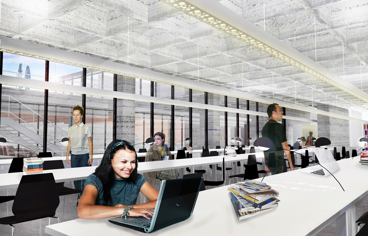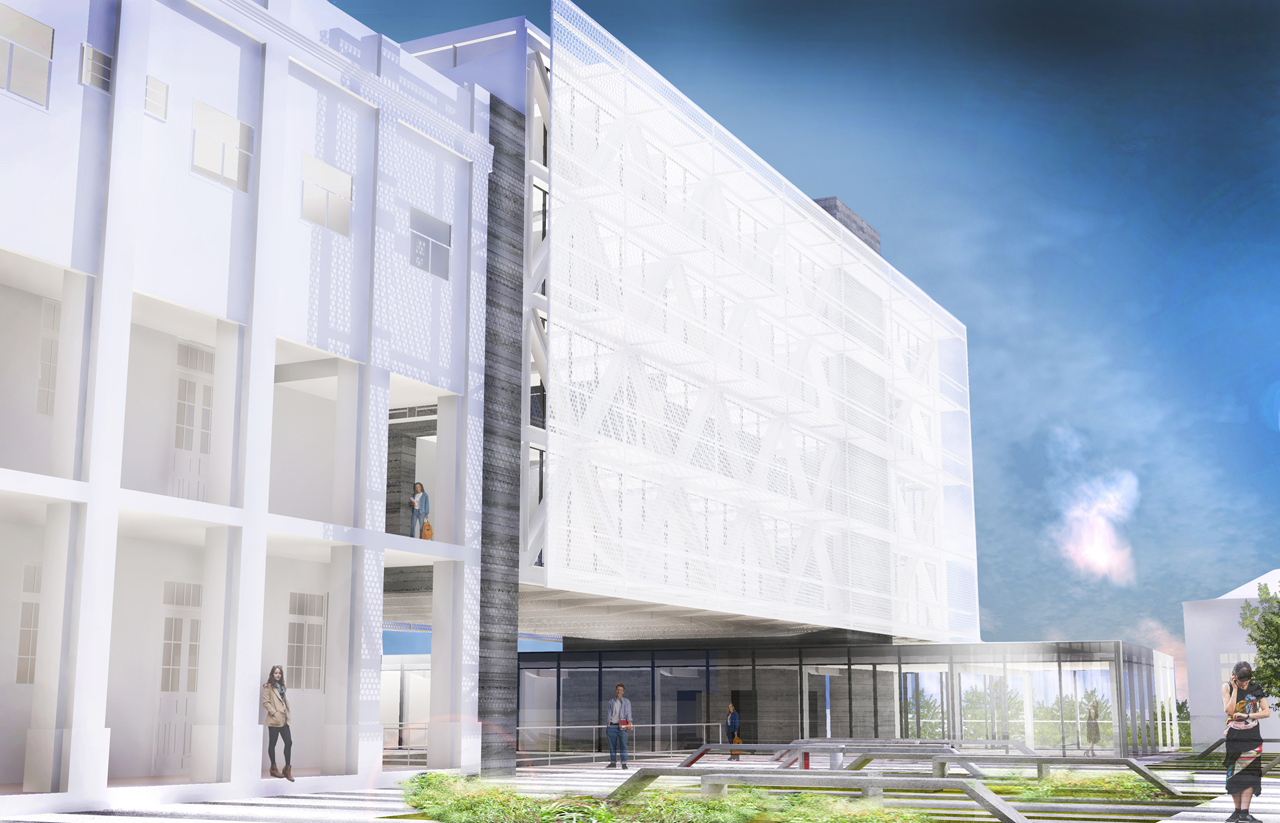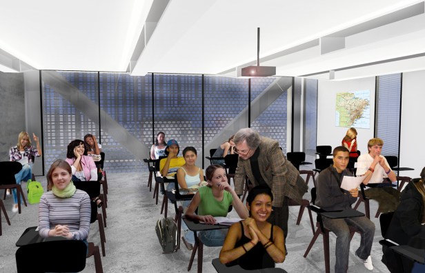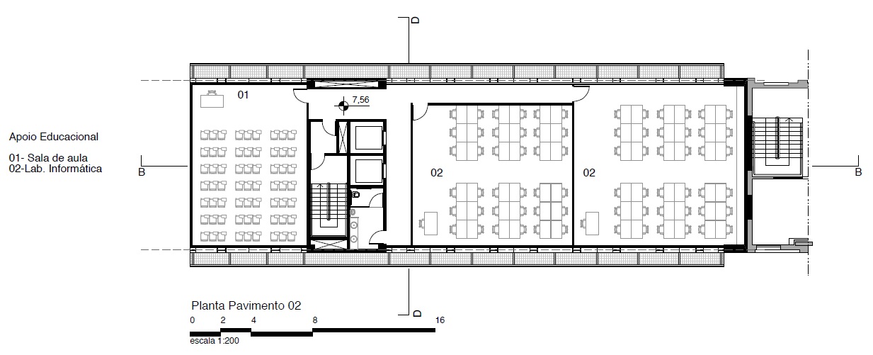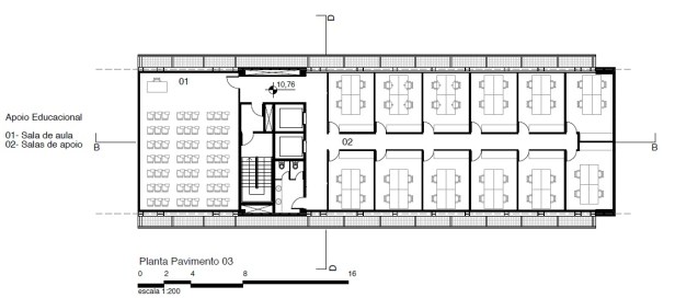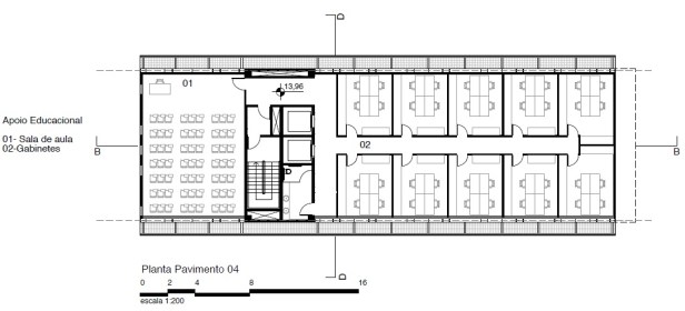 O edifício de salas de aula tem uma estrutura mista – pilares e paredes de concreto armado + vigas e lajes de aço, que é econômica e coerente com os vãos e balanço volumétrico propostos na arquitetura.