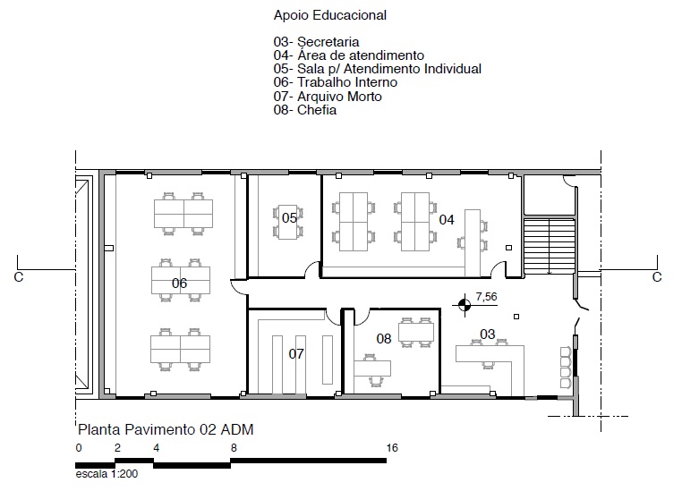 A intervenção arquitetônica no espaço interno do edifício existente irá gerar a necessidade de estruturar um piso elevado acima do nível do piso atual. Considerando a utilização original do espaço como quadra de esportes verifica-se que a sobrecarga prevista em norma é de 500 kgf/m2, uniformemente distribuída sobre toda a área. Alterando o espaço para uma área administrativa podemos considerar uma sobrecarga de 200 kgf/m2 por piso o que, somado, resulta em 400 kgf/m2, sobrando um total de 100 kgf/m2 para a estrutura. Assim, será possível prever a estruturação do piso elevado considerando paredes estruturais construídas diretamente sobre a laje existente + painel “wall” sobre vigas metálicas leves conectadas às cintas sobre as paredes. Os pisos deverão também ter revestimentos leves.