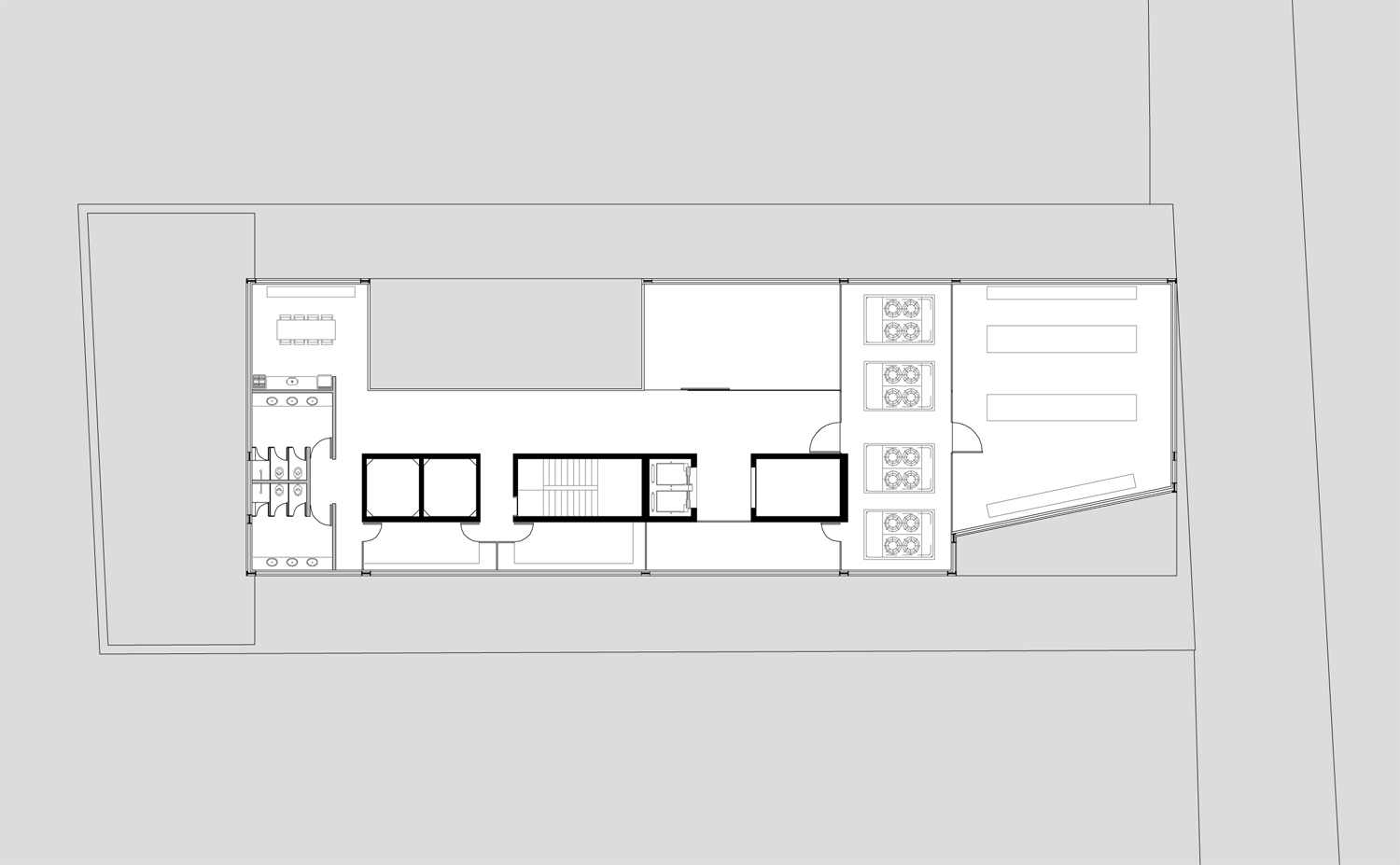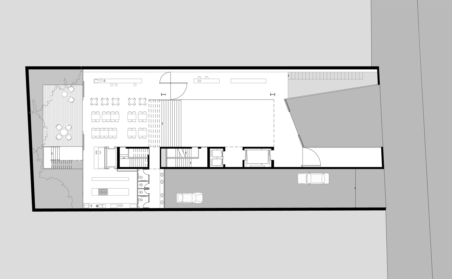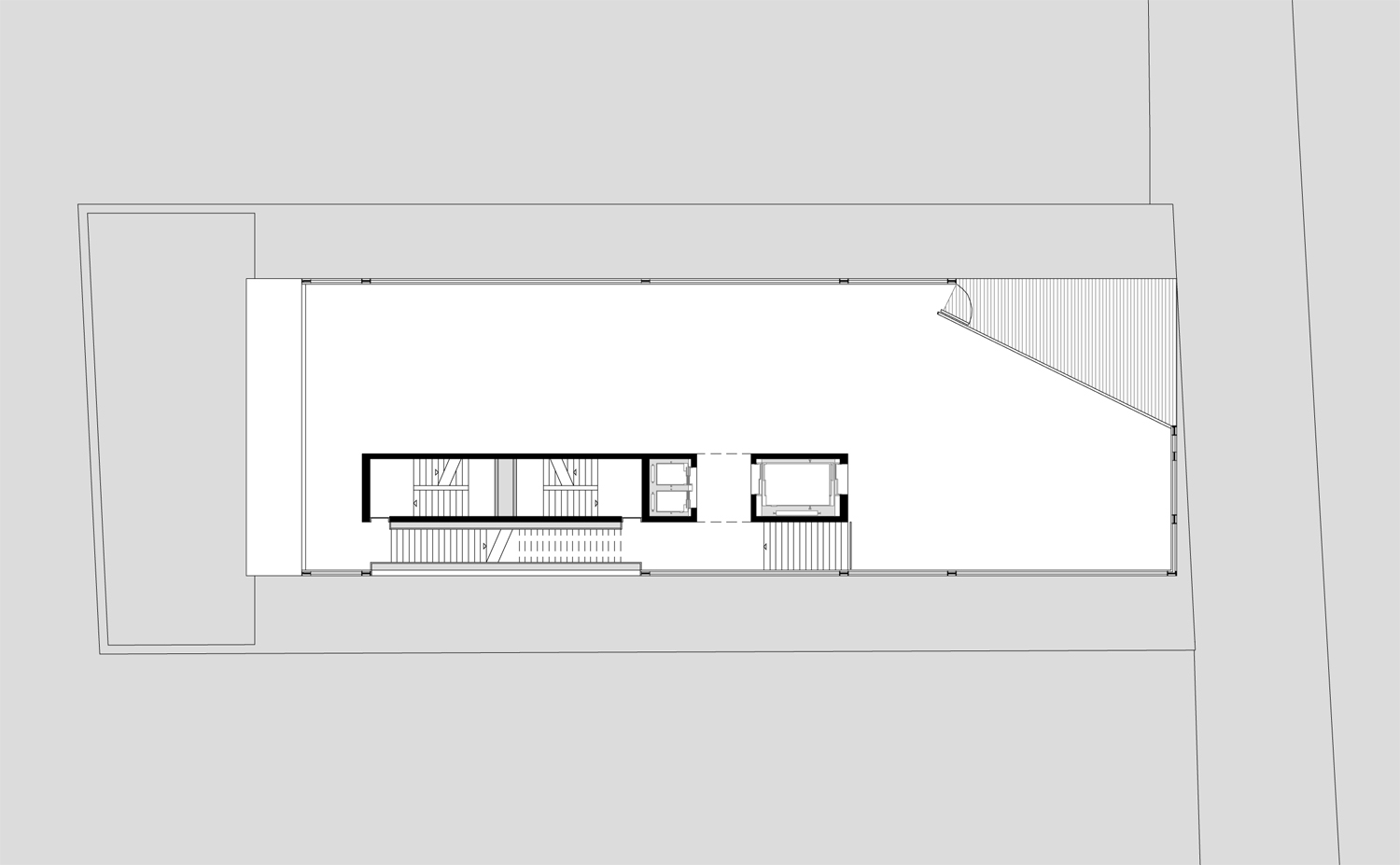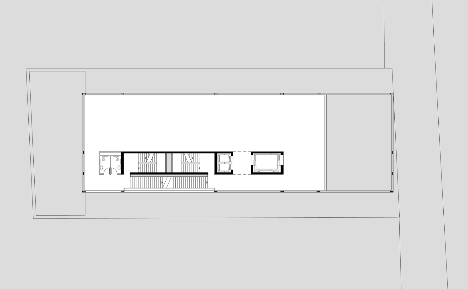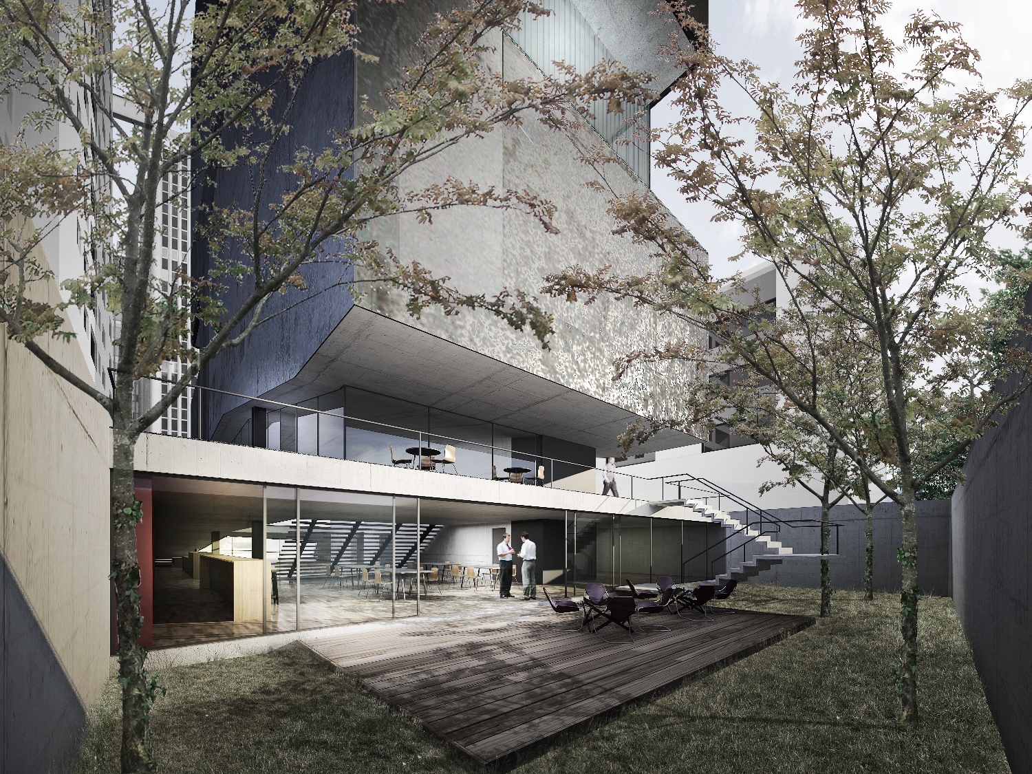 Mas a esse também se chegará por uma larga e vazada escada que vai do interior do térreo para o mezanino exterior. Por essa escada os dois caminhos se conectam. Ou por uma escada menor no jardim que ficará ao fundo do terreno. Visto de cima desde o café, ou prolongando-se depois do restaurante que ficará além da grande escada, o pequeno jardim, com suas árvores, relva, esculturas, conformará um recanto sereno, bucólico talvez, a apenas quarenta metros da feérica Avenida Paulista e da laje do edifício que se alça, convidativa, mas também altiva, junto à calçada.