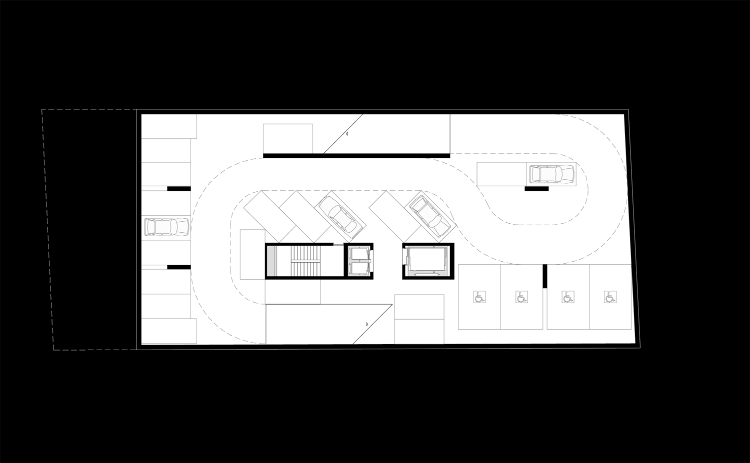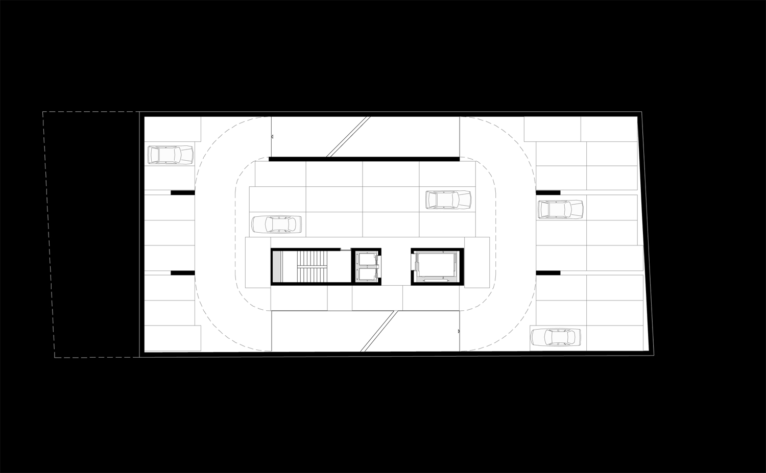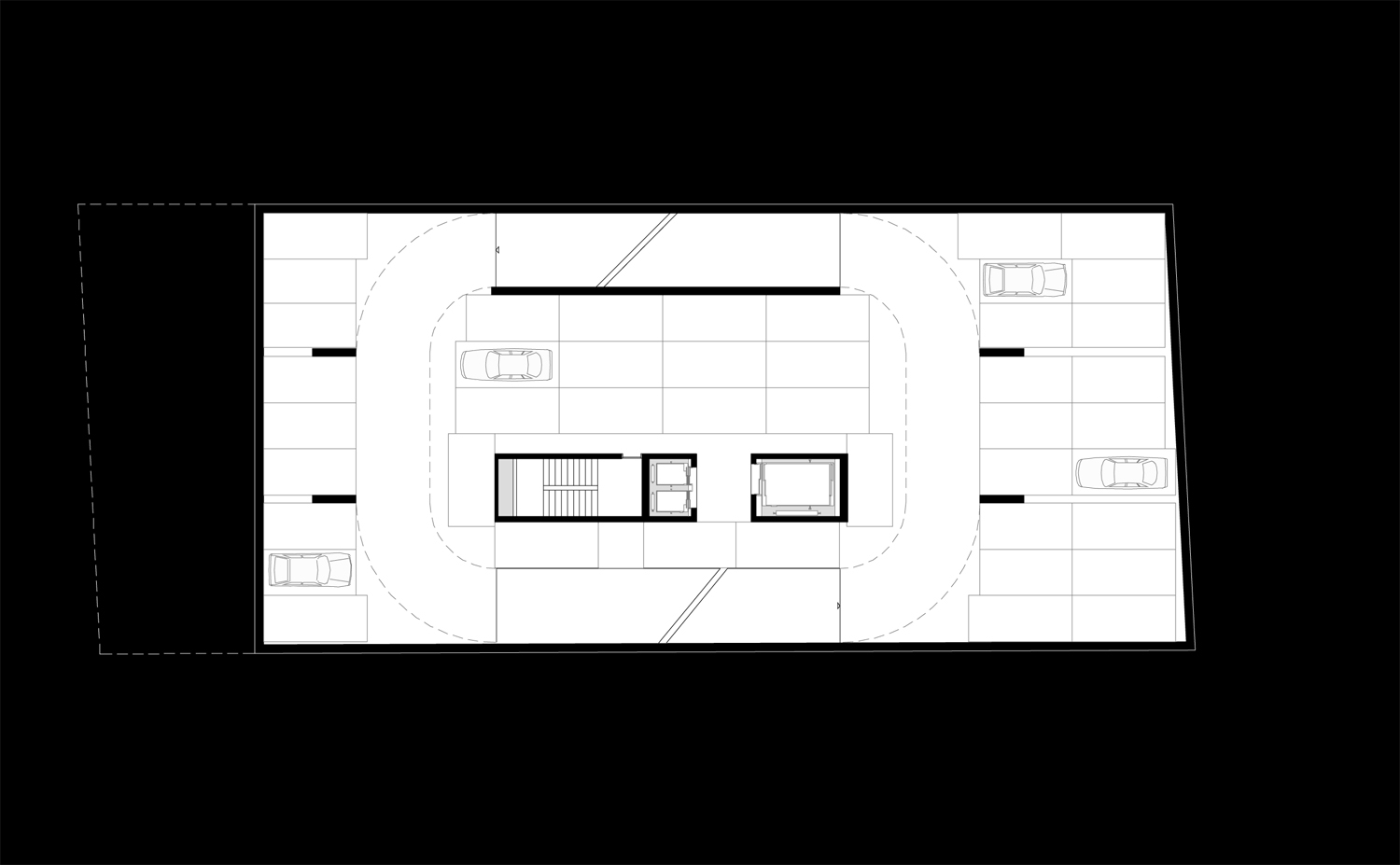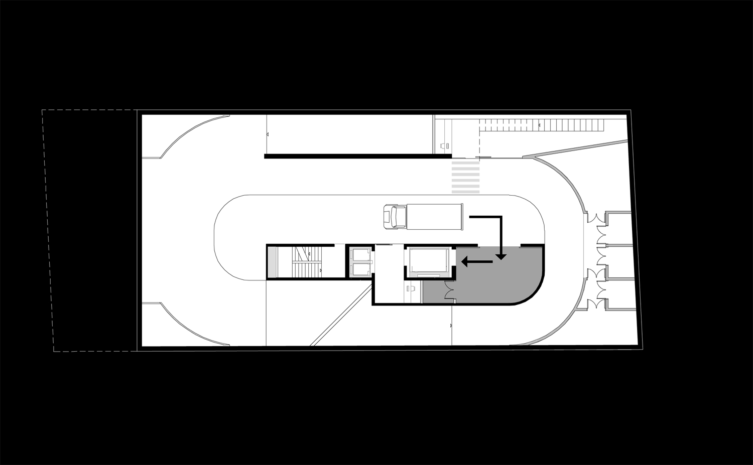 Ainda sob essa laje junto à calçada, um visitante, ou mesmo um passante curioso, poderá optar por dois caminhos. Por uma rampa de inclinação leve descerá para o térreo, para os elevadores, a livraria, o restaurante. Ou subirá para o café no terraço do mezanino, na outra opção de caminho para quem entra. Por duas rampas de asfalto que sobem pelas laterais do prédio, será possível contorná-lo por dois passeios, observando, quem sabe, a movimentação abaixo, até que ao fim do trajeto se chegue ao café.