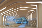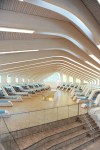 Cada nervura é definida por um pórtico de madeira laminada e colada, no qual são instalados isolantes acústicos, dutos de ar-condicionado, painéis de vidro utilizados como fechamentos para as luminárias e elementos de sinalização, assim como nichos de leitura e estantes para os livros.