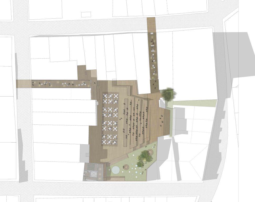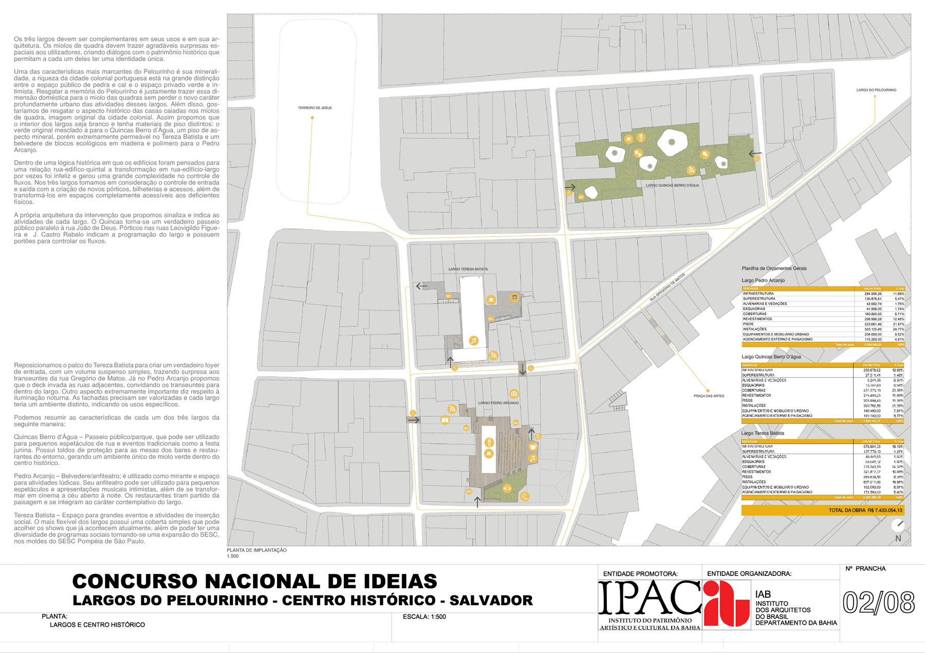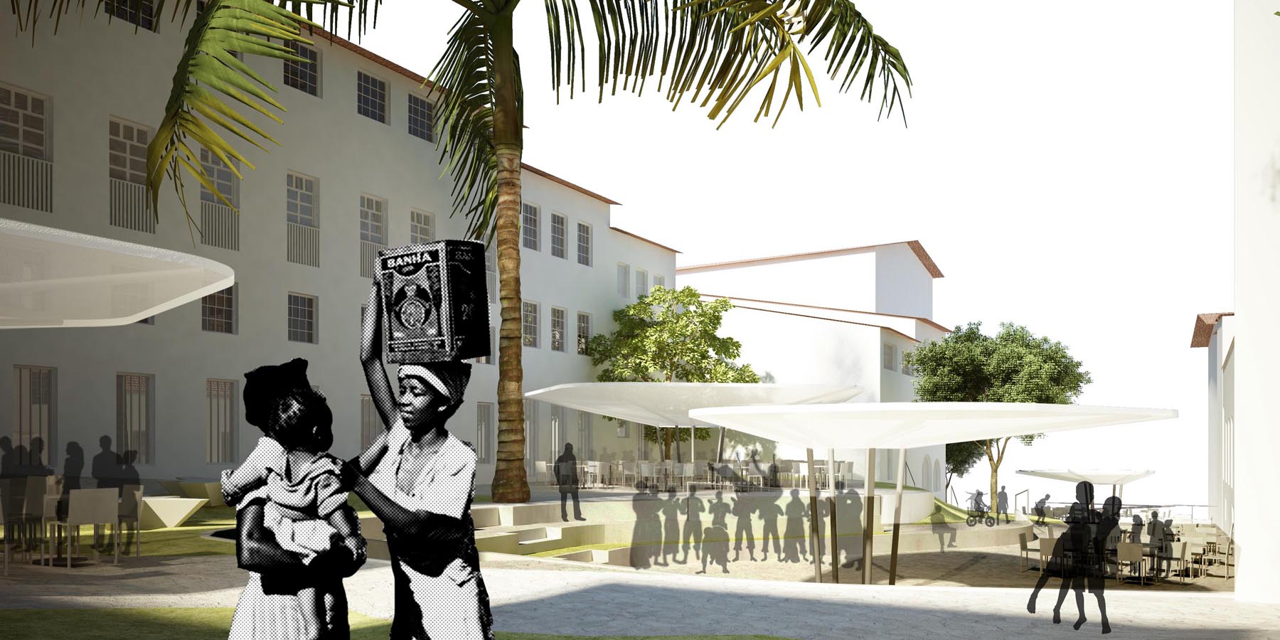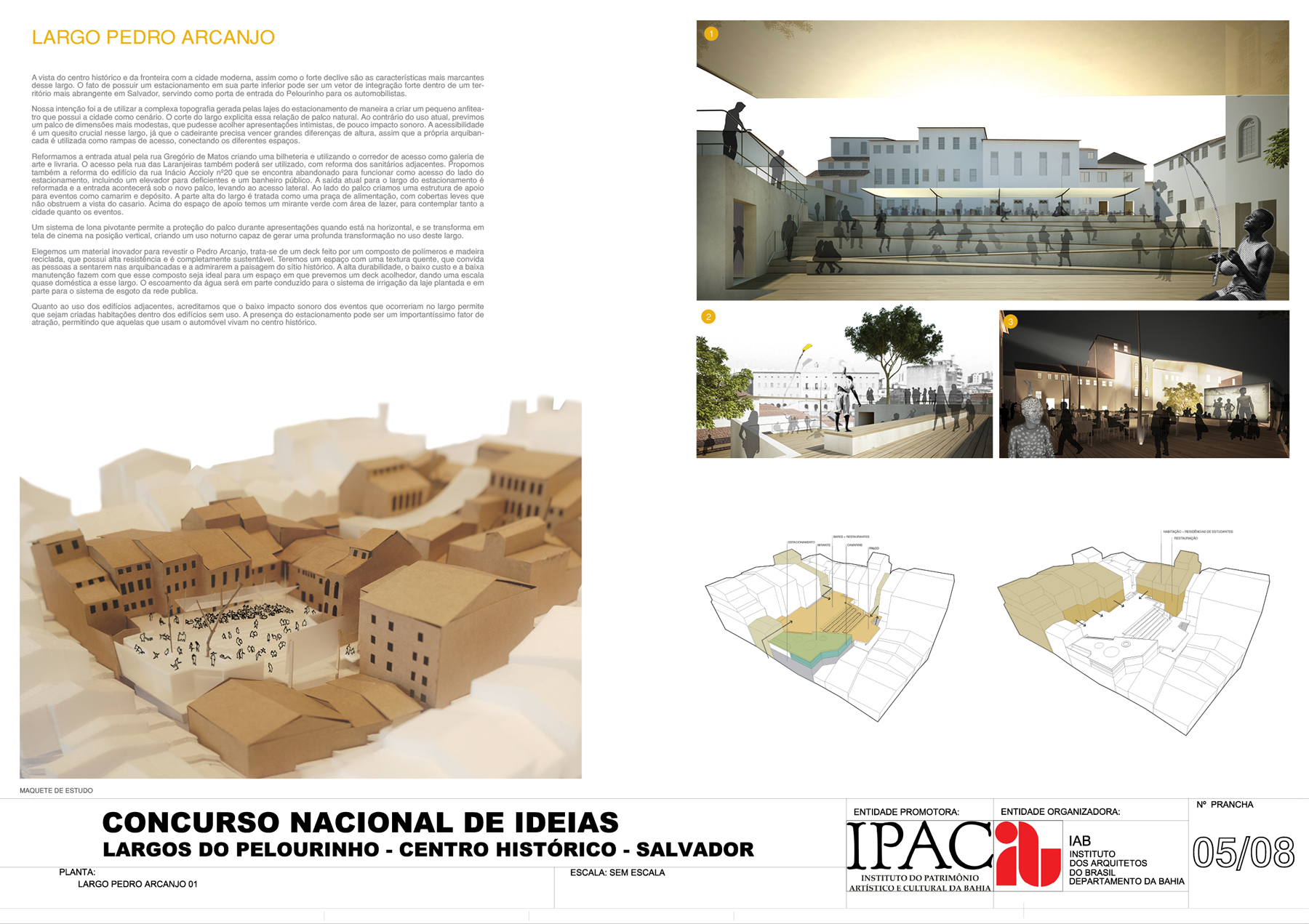 Acreditamos que o projeto de reabilitação dos largos do Pelourinho deva ser abordado através de uma perspectiva de transformação que leve em consideração os fatores responsáveis pelo ressurgimento e nova decadência do sítio histórico, tentando aliar escalas territoriais e usos aparentemente contraditórios numa proposta em permanente construção. A idéia de ‘cidade-sorvete’, citada por Lina Bo Bardi em seus estudos sobre o CHS, está bem manifestada no uso atual dos largos, onde todos são palcos para espetáculos e espaços de bares e restaurantes. Não restringir o uso dos largos a esses usos é nossa primeira intenção. A criação dos largos implicou numa transformação irreversível do patrimônio, espaços que antes eram quintais se tornaram praças, gerando uma espacialidade inovadora, indo de encontro às políticas de engessamento de sítios históricos. Devemos tirar partido desse primeiro gesto inovador e reinterpretar o contraste da cidade colonial, onde mineralidade e cal representavam o espaço público, o verde e a penumbra os espaços privados. Acreditamos que os largos devam ser repintados de branco, e propomos materiais distintos que sublinhem a identidade de cada um deles. Pedro Arcanjo se torna um belvedere entre a cidade histórica e a cidade moderna, com um deck usado como anfiteatro, mirante e cinema a céu aberto. Tereza Batista segue com sua vocação para grandes eventos, com um palco suspenso e um discreto toldo branco dialogando com as fachadas. A flexibilidade de seu layout permite que abrigue diversas atividades, tornando-se o largo da inclusão social e de feiras de artesanato e culinária. Quincas é o retorno ao verde, parque e passeio público, teatro de rua e roda de capoeira, crianças brincando e idosos descansando.
