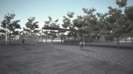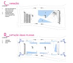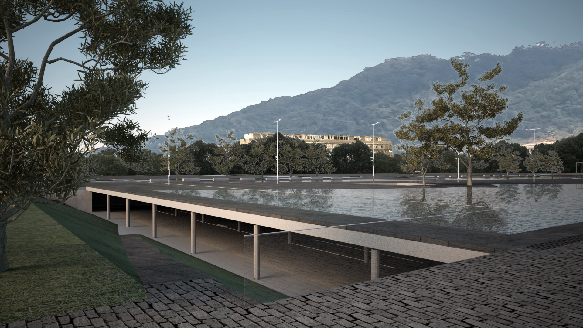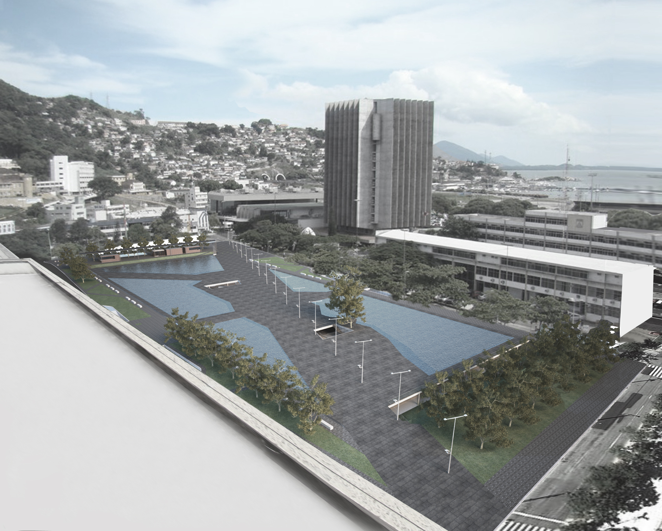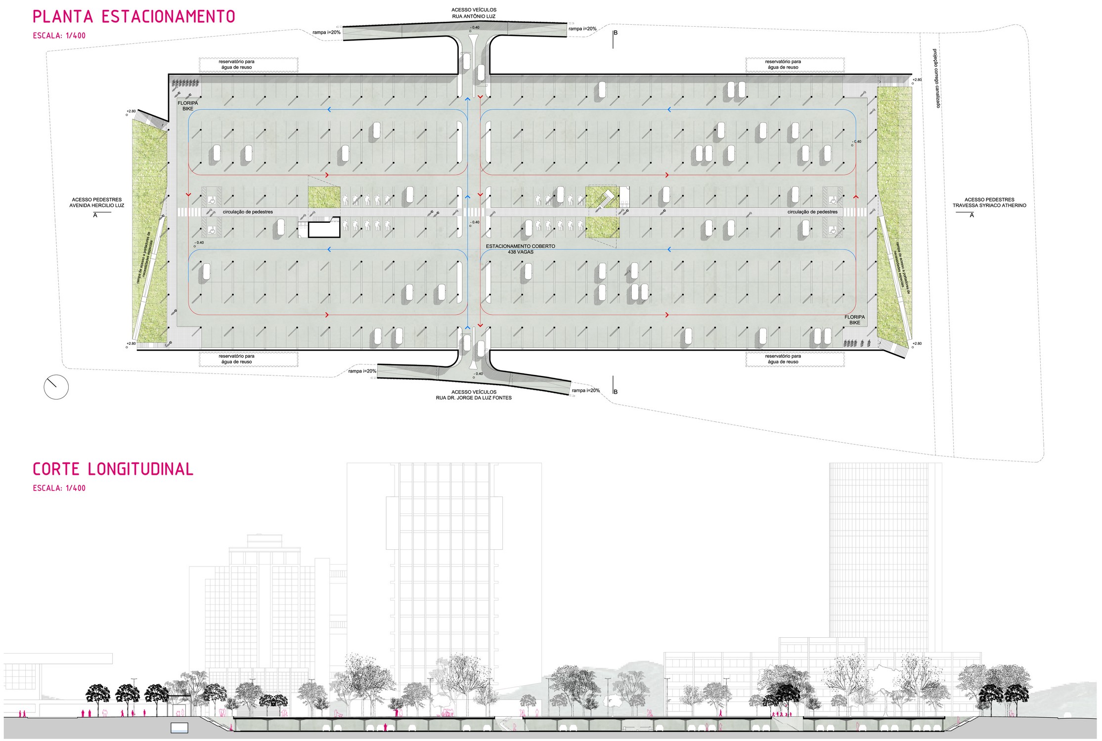 A setorização proposta localiza o estacionamento subterrâneo na porção central da quadra. Sua cobertura se transforma numa grande arena,onde planos de água,com variáveis configurações espaciais, qualificam e delimitam a superfície conforme os usos desejados. Lateralmente, a arborização constitui espaços com características e escalas distintas. Junto à Av. Hercílio Luz, uma área ajardinada de caráter mais contemplativo marca a transição entre a cidade e a praça. No extremo oposto, junto à Travessa Syriaco Atherino, a sombra das árvores se soma a uma leve estrutura pergolada,que organiza os programas solicitados, para criar um espaço mais resguardado e acolhedor.