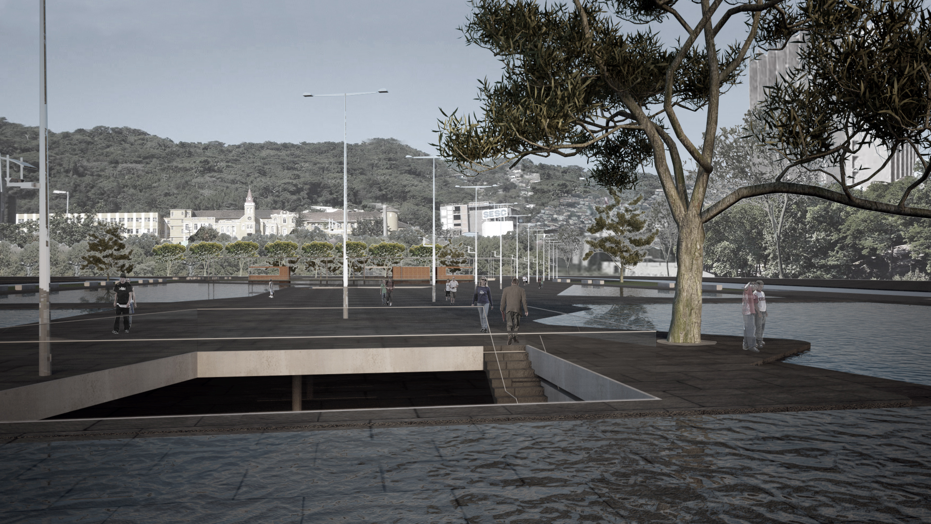 Considerada sem seu conjunto, as áreas inundáveis propostas adquirem uma função simbólica e presta uma homenagem à memória do lugar. Os limites estabelecidos para essas águas possibilitam recriar de maneira figurada a antiga “prainha” e resgatar a presença do mar que há até pouco tempo ocupava esse território.