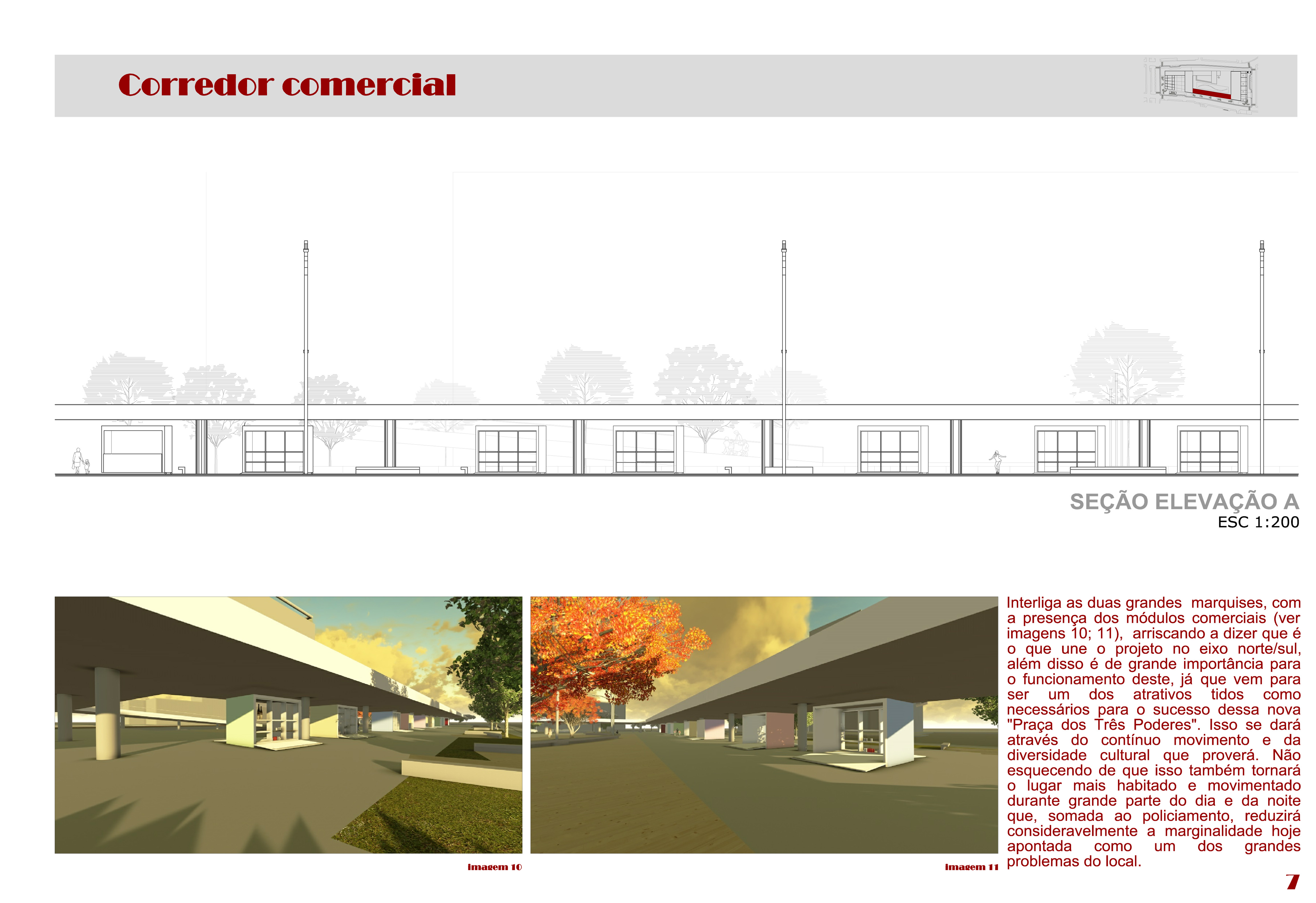 Corredor comercial: Interliga as duas grandes  marquises, com a presença dos módulos comerciais (ver imagens 10; 11),  arriscando a dizer que é o que une o projeto no eixo norte/sul, além disso é de grande importância para o funcionamento deste, já que vem para ser um dos atrativos tidos como necessários para o sucesso dessa nova “Praça dos Três Poderes”. Isso se dará através do contínuo movimento e da diversidade cultural que proverá. Não esquecendo de que isso também tornará o lugar mais habitado e movimentado durante grande parte do dia e da noite que, somada ao policiamento, reduzirá consideravelmente a marginalidade hoje apontada como um dos grandes problemas do local.