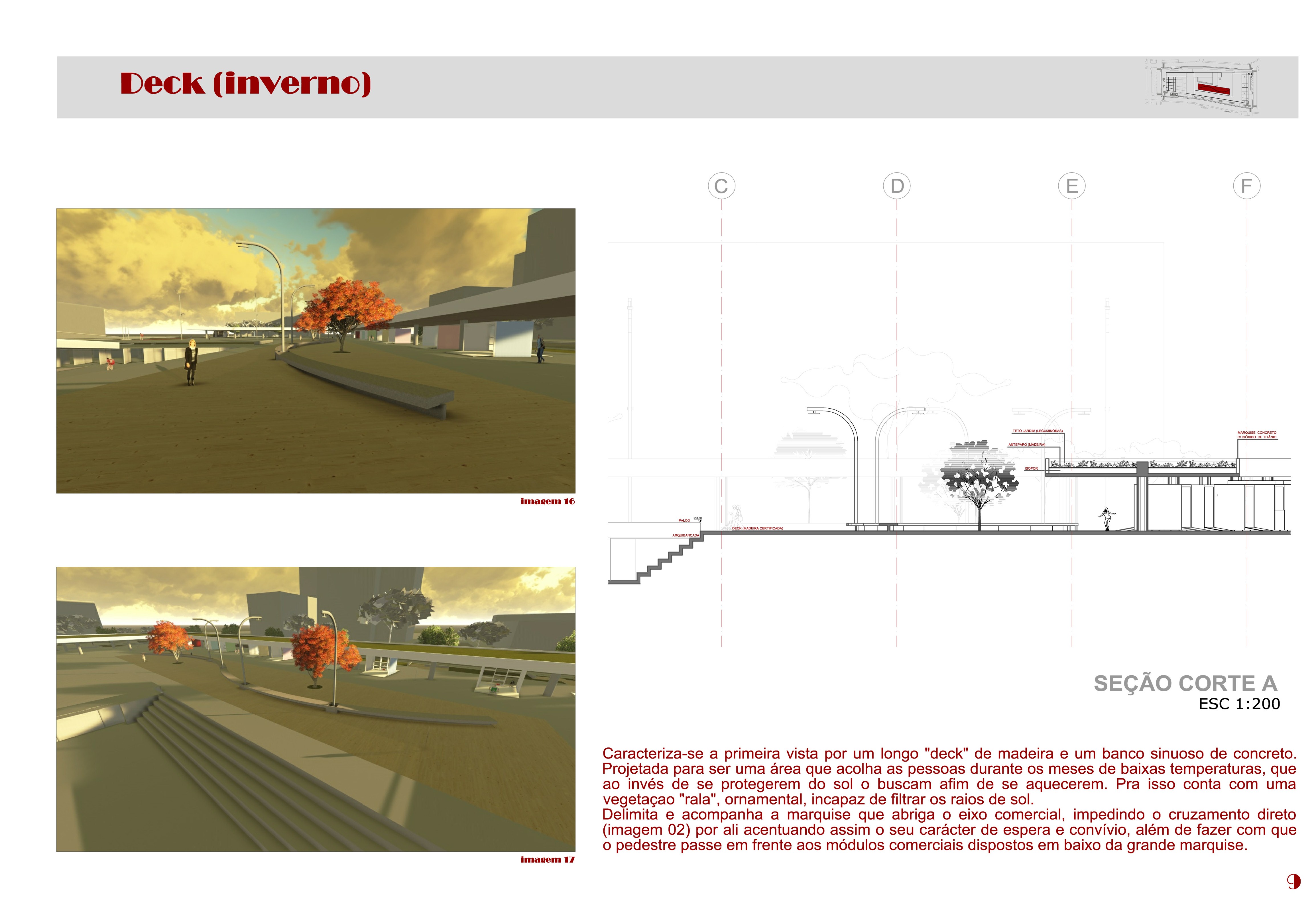 Deck (inverno): Caracteriza-se a primeira vista por um longo “deck” de madeira e um banco sinuoso de concreto. Projetada para ser uma área que acolha as pessoas durante os meses de baixas temperaturas, que ao invés de se protegerem do sol o buscam afim de se aquecerem. Pra isso conta com uma vegetaçao “rala”, ornamental, incapaz de filtrar os raios de sol.