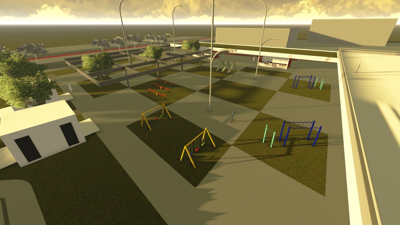 Área infantil, Lanchonetes e Posto Policial: Devido a existência dos equipamentos infantis, optamos pela implantação das lanchonetes em suas imediações, para que os responsáveis por elas possam, além de cuidar das crianças, desfrutar. Mantendo essa linha de pensamento em frente a elas está locado o posto policial.