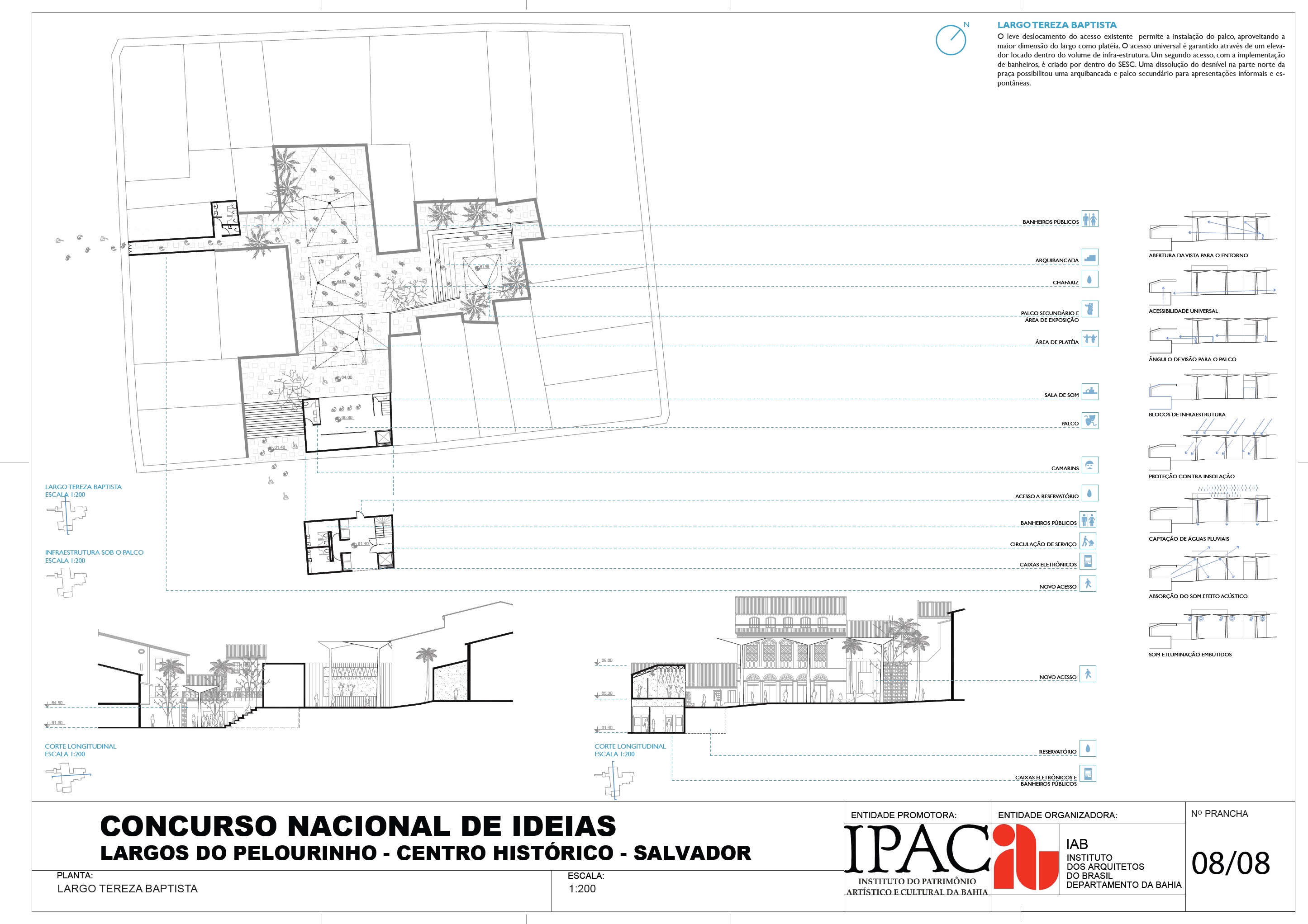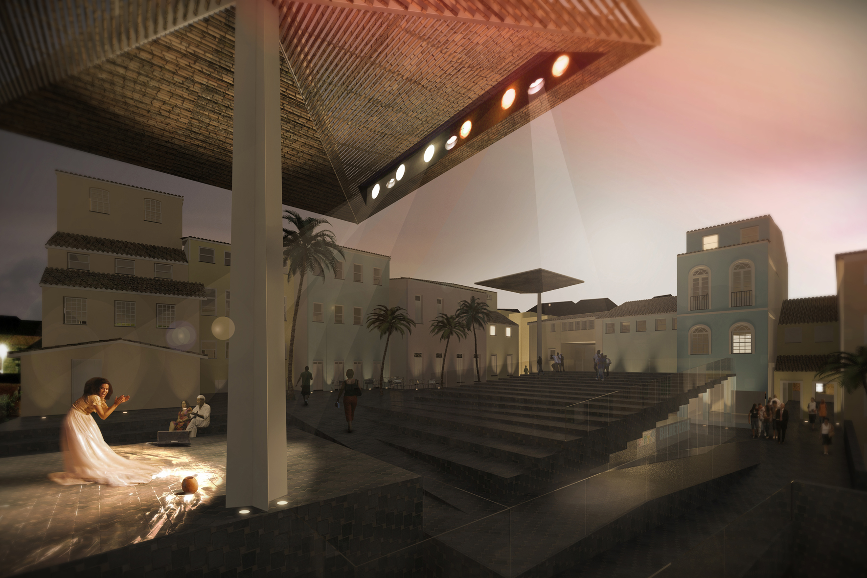 A proposta re-configura a morfologia do traçado original das vias públicas geradas inicialmente pelas quadras estanques. As novas aberturas se tornam acessos equipados com a infra-estrutura de palco, camarins, bilheteria, salas expositivas e banheiros. Esta ação permite melhor controle do acesso às quadras e resgata a configuração público/privado original do Pelourinho. A implantação da infra-estrutura no perímetro da quadra permite acesso técnico pelas vias públicas , evitando assim que artistas e funcionários transitem pelo espaço destinado ao espectador. O gabarito, as aberturas e a materialidade das novas edificações respeitam o presente patrimônio histórico da região.