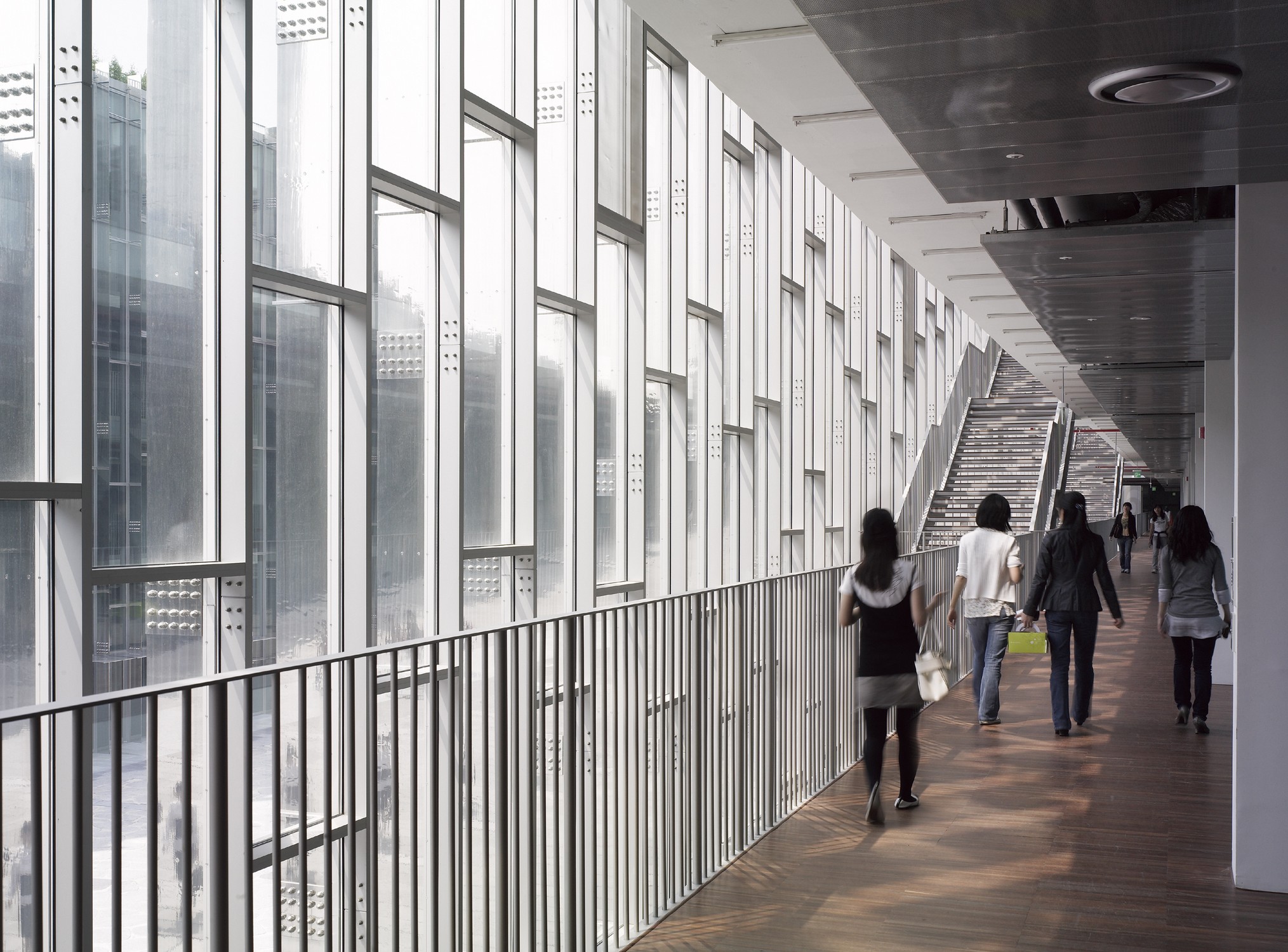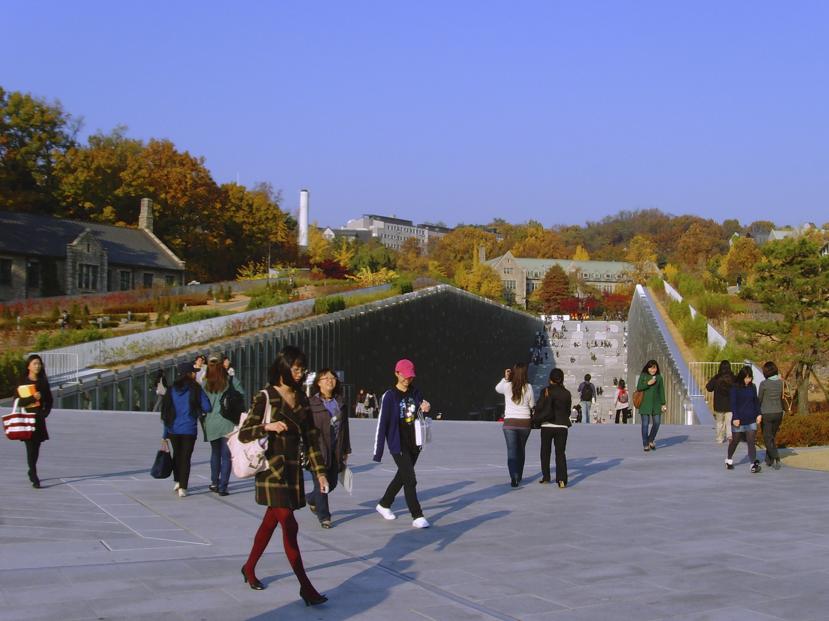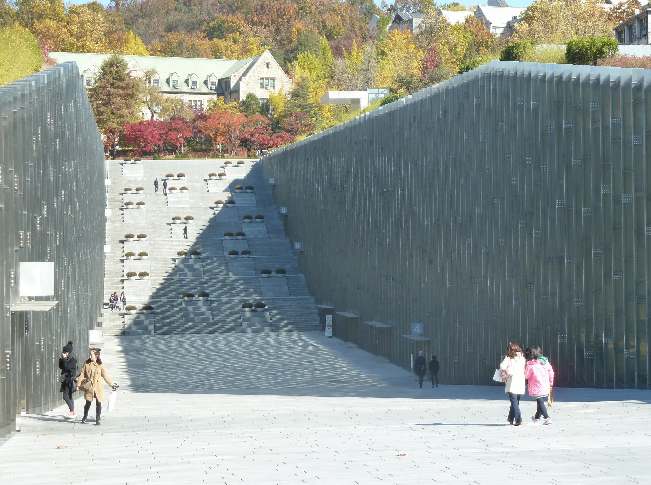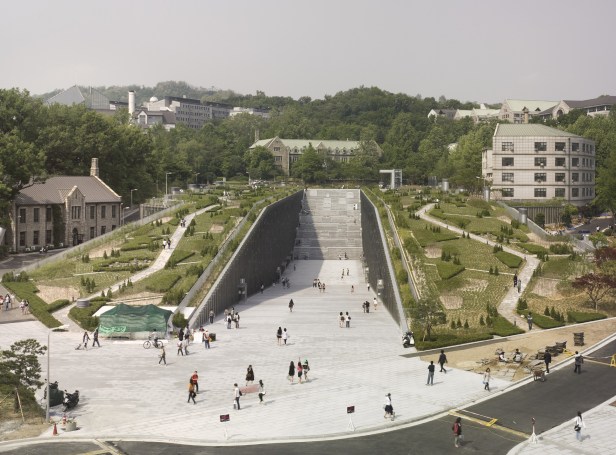 É como o Champs Elysées de Paris, ou o Campidiglio, de Roma: um pátio de entrada (a partir do qual se acessam os diversos departamentos), um espaço para a troca de ideias e a socialização, onde os estudantes se encontram depois das aulas; um lugar de descanso e um teatro ao ar livre, uma vez que a escadaria se converte facilmente em um anfiteatro, no qual os degraus passam a ser utilizados como bancos. É essa flexibilidade, tanto conceitual quanto real, que permite a integração do novo Campus de Ewha ao seu contexto, seu entorno e à paisagem circundante.