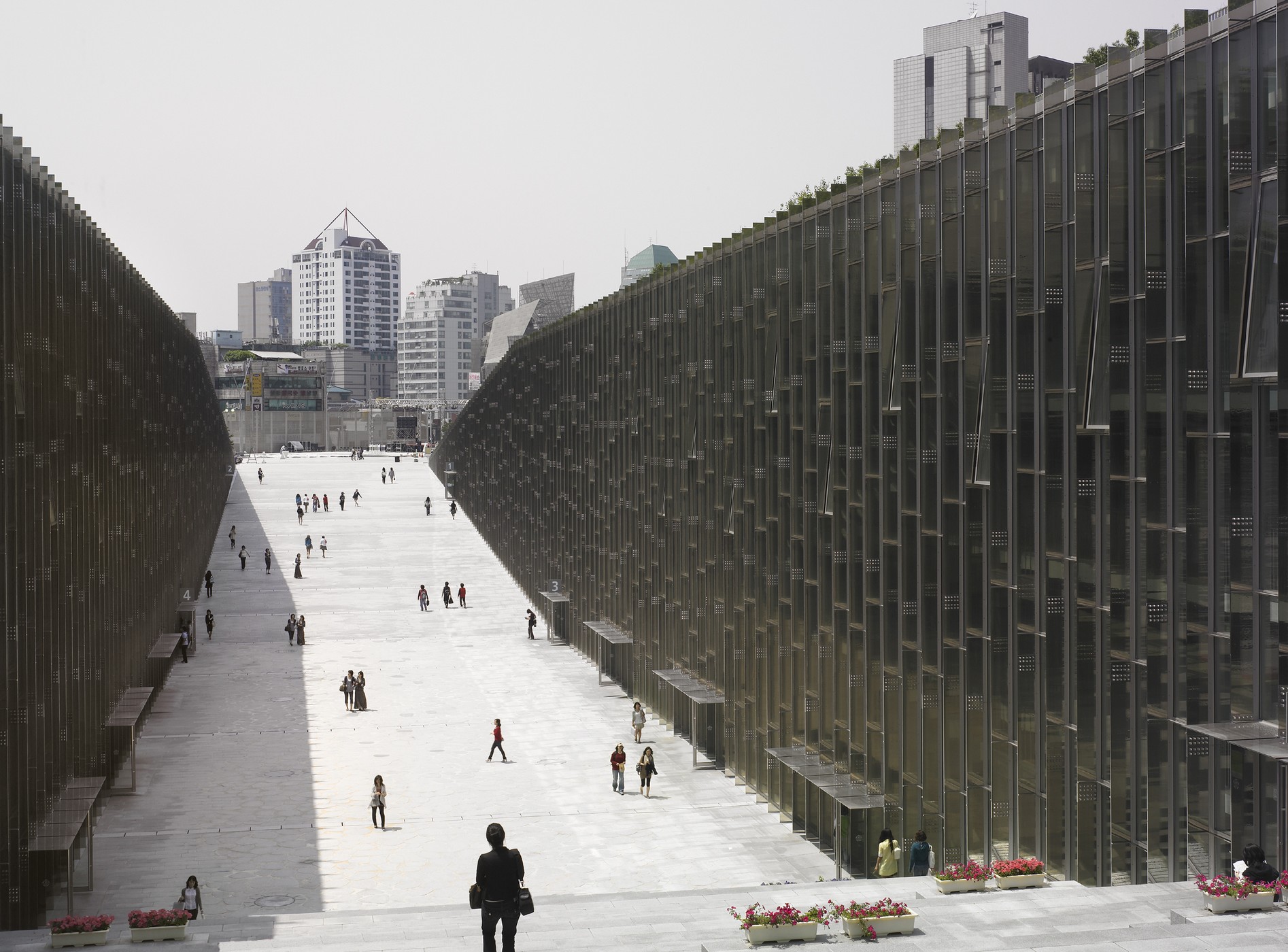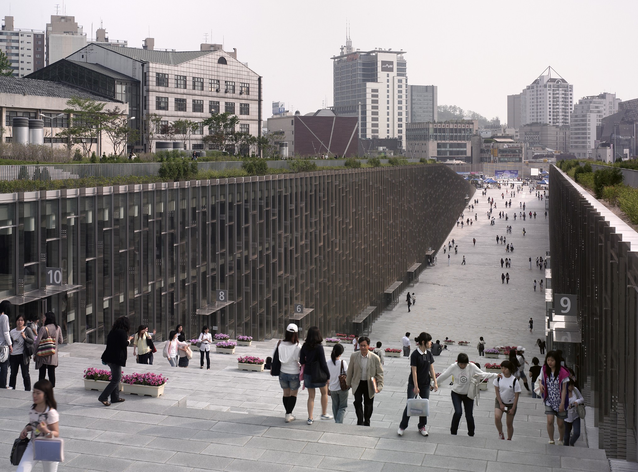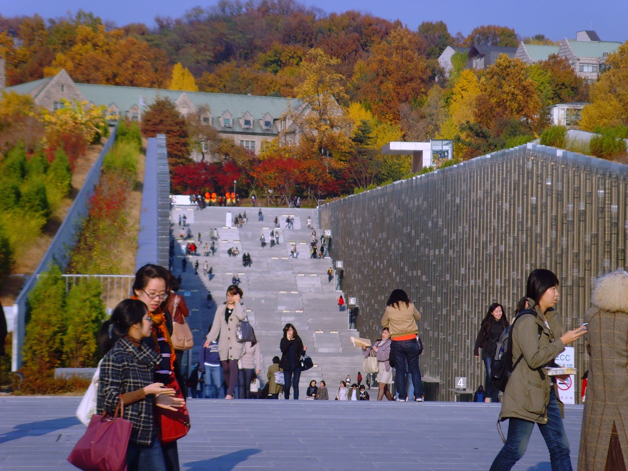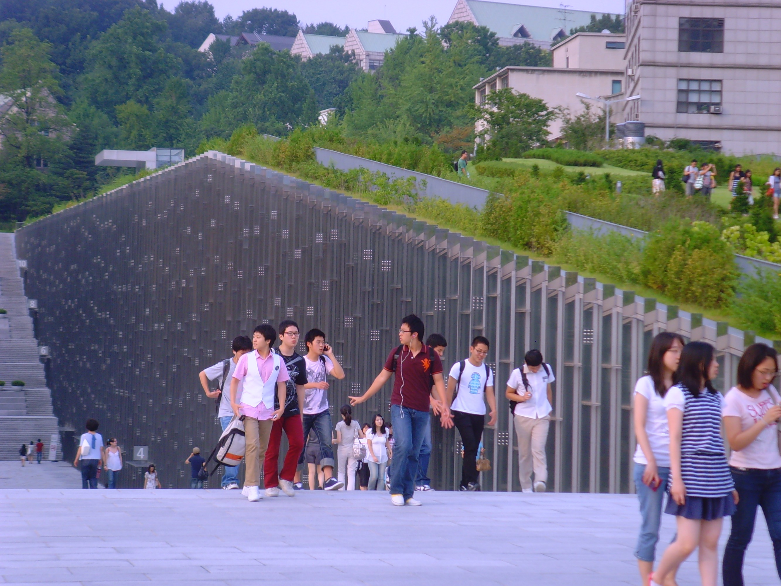 É como o Champs Elysées de Paris, ou o Campidiglio, de Roma: um pátio de entrada (a partir do qual se acessam os diversos departamentos), um espaço para a troca de ideias e a socialização, onde os estudantes se encontram depois das aulas; um lugar de descanso e um teatro ao ar livre, uma vez que a escadaria se converte facilmente em um anfiteatro, no qual os degraus passam a ser utilizados como bancos. É essa flexibilidade, tanto conceitual quanto real, que permite a integração do novo Campus de Ewha ao seu contexto, seu entorno e à paisagem circundante.