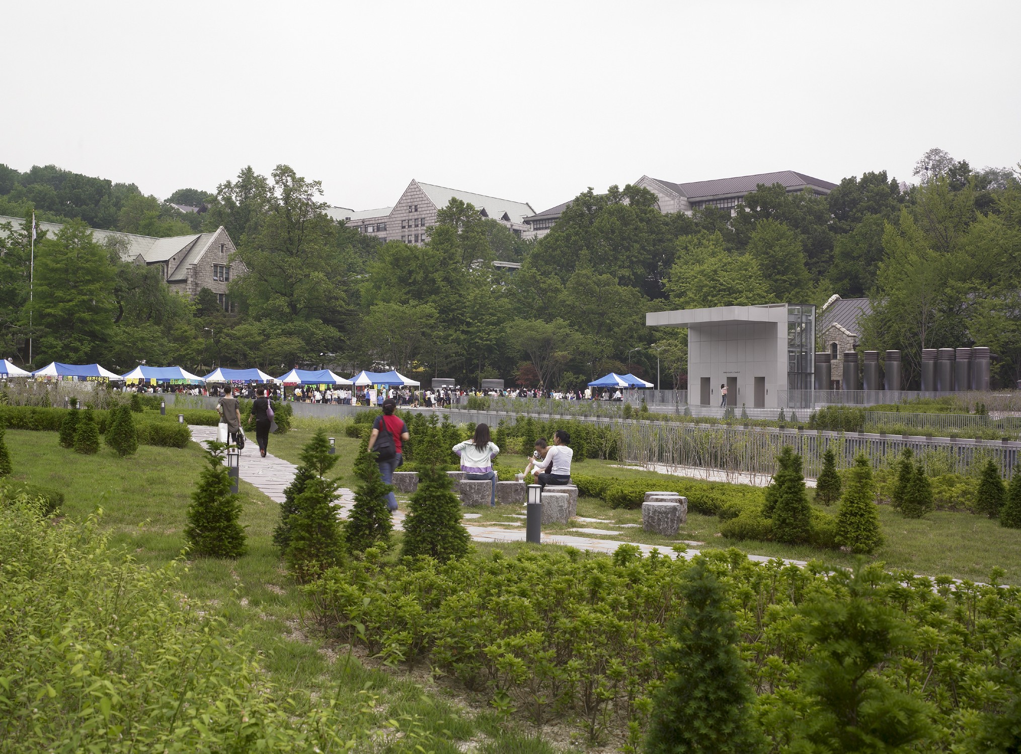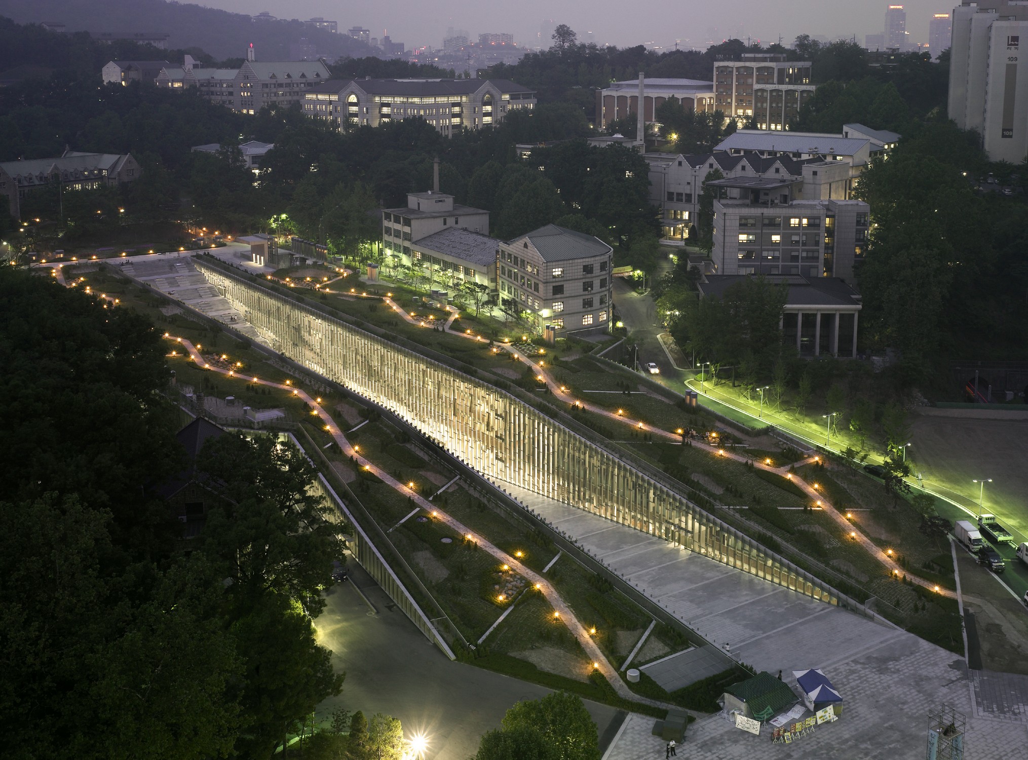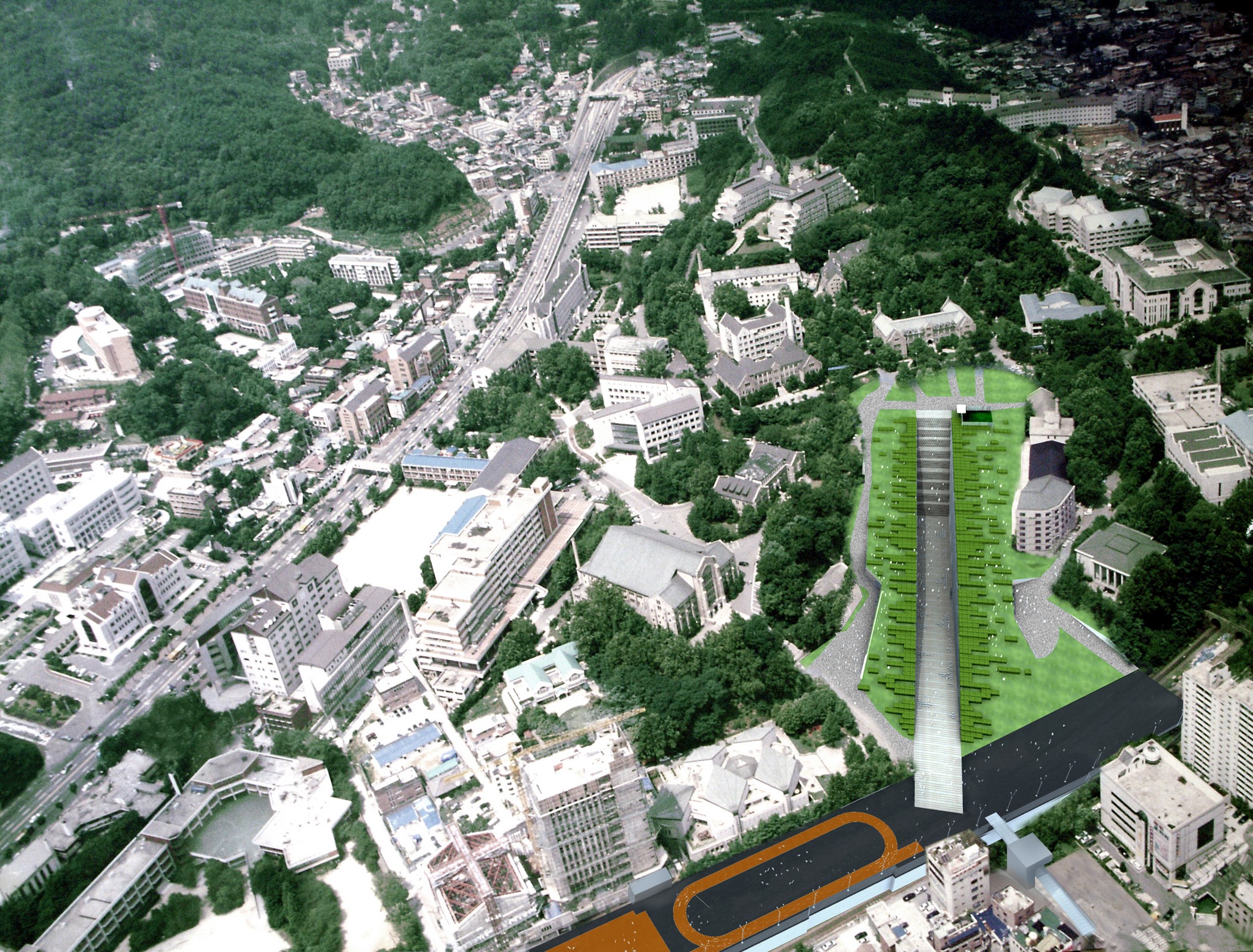 A complexidade do lugar e sua relação com o campus existente e com a cidade de Shinchon, na parte sul, exigiram uma resposta que fosse além do lote propriamente dito. A partir de um enfoque urbano, este projeto propõe uma relação entre o tecido do campus existente e da cidade circundante, em uma paisagem única. A arquitetura se apropria do território e desaparece. Ao integrar a construção ao solo, a topografia do lugar se modifica e a geografia se transforma em diversos níveis.