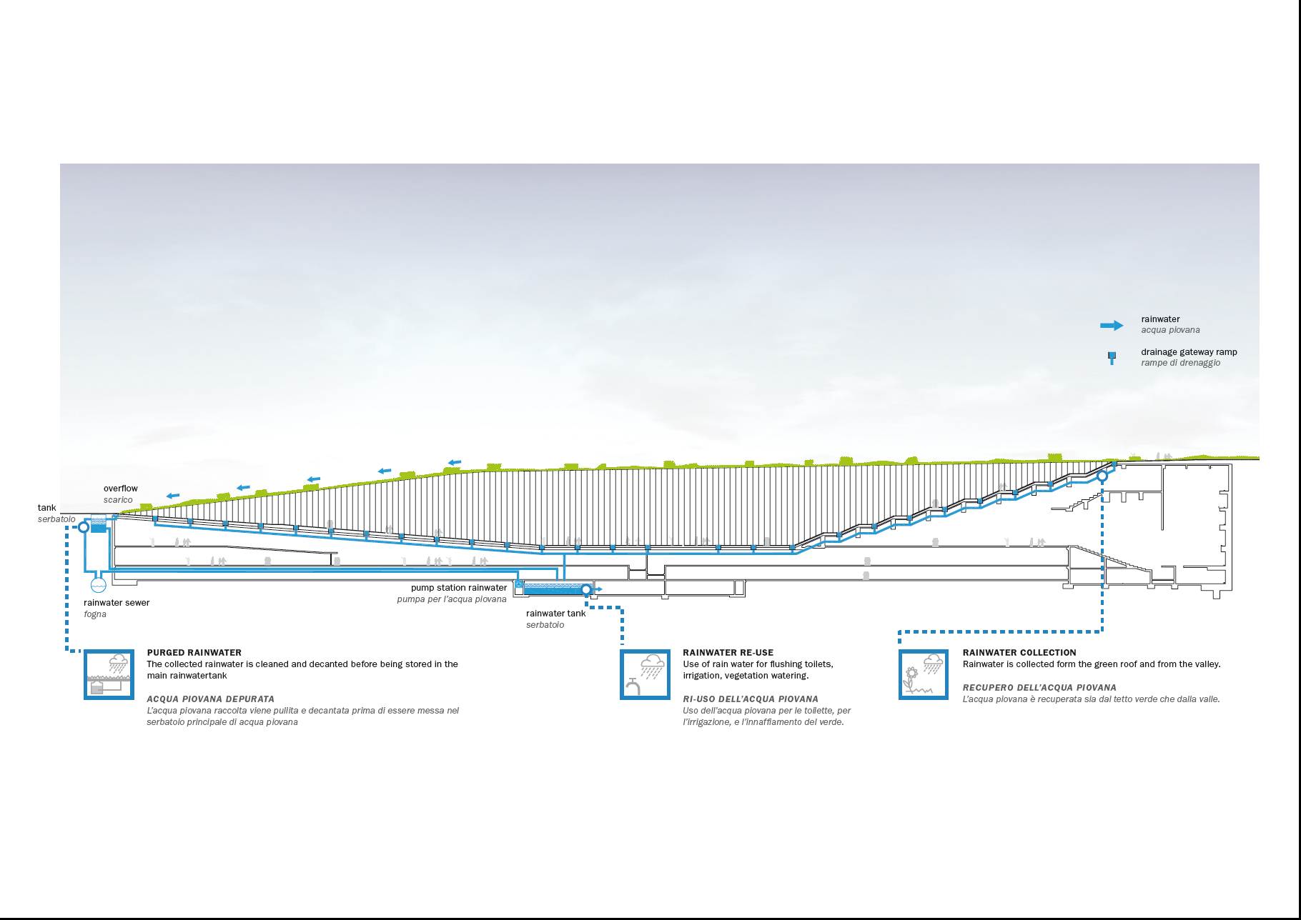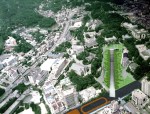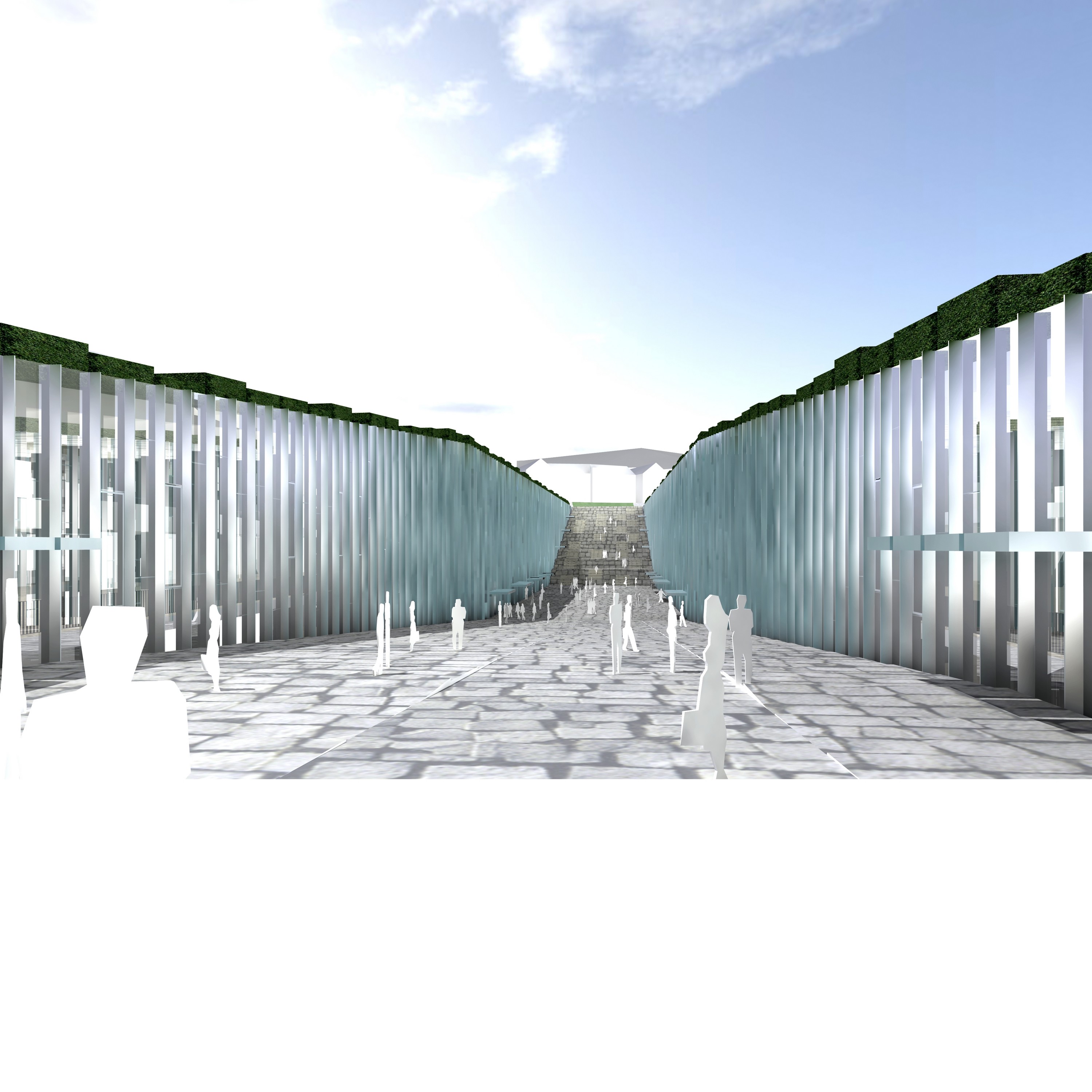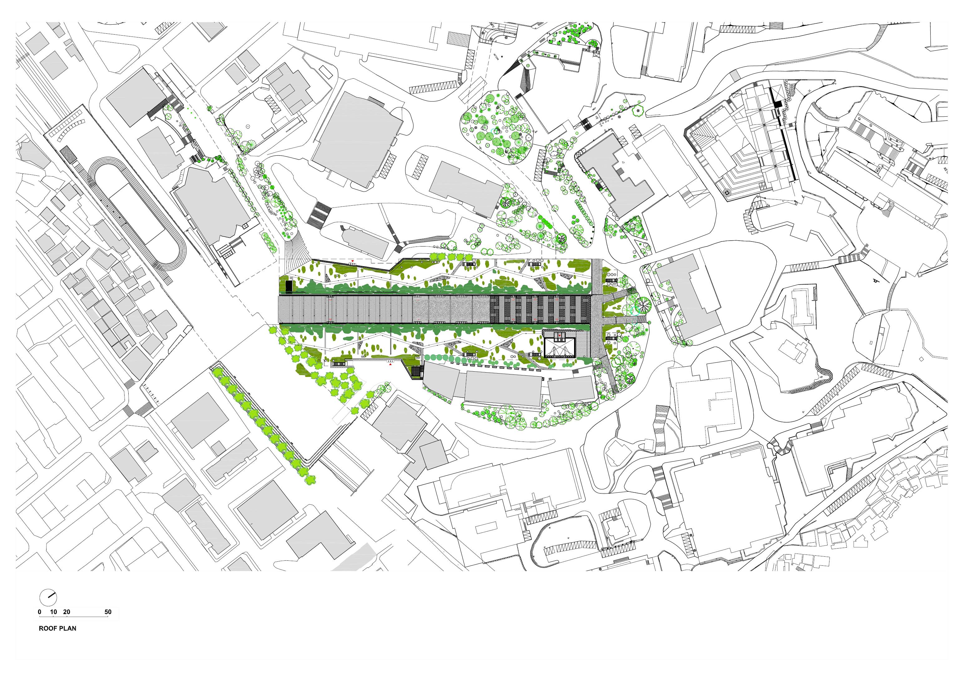 O projeto parte de uma “fissura” que se constrói na topografia, revelando o interior do Campus. Nesse vazio se estabelece um lugar híbrido, que permite a realização de uma grande variedade de atividades. Uma “avenida central”, levemente inclinada, define a circulação central, conduzindo os pedestres até a escadaria monumental, que leva os visitantes ao ponto alto do Campus.