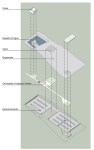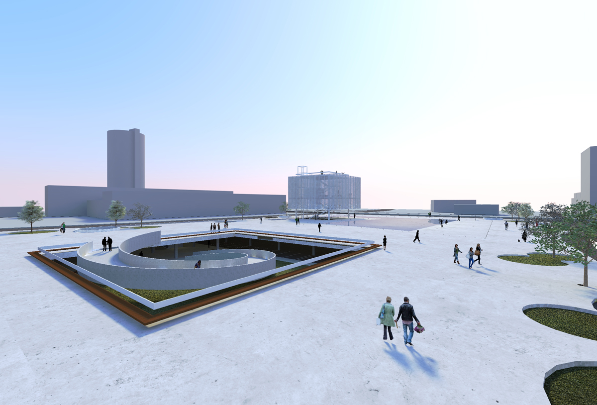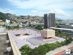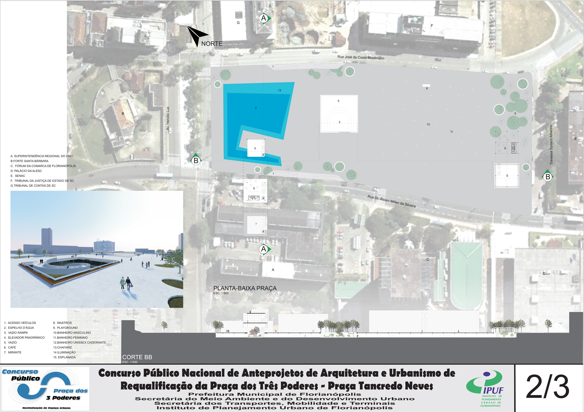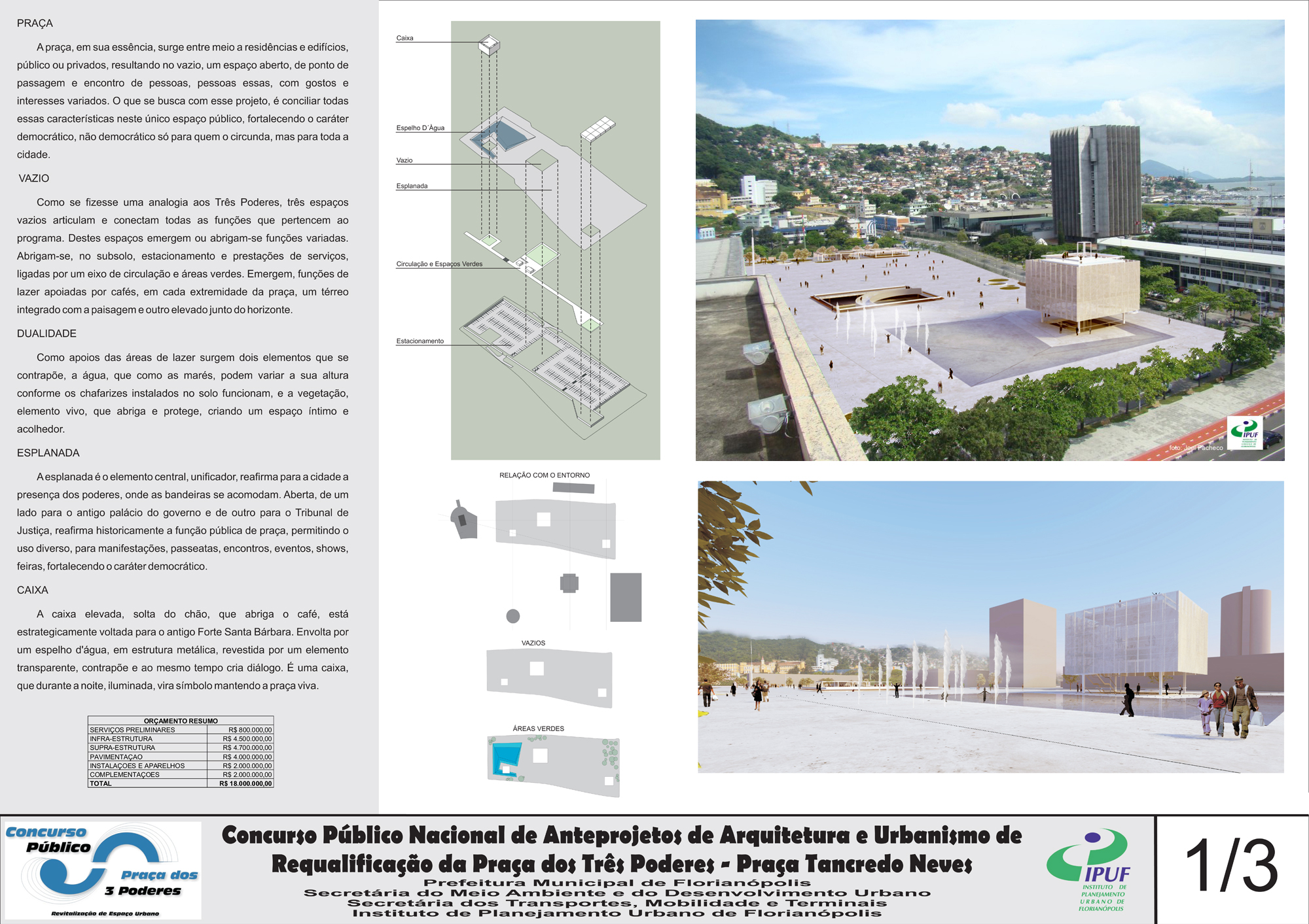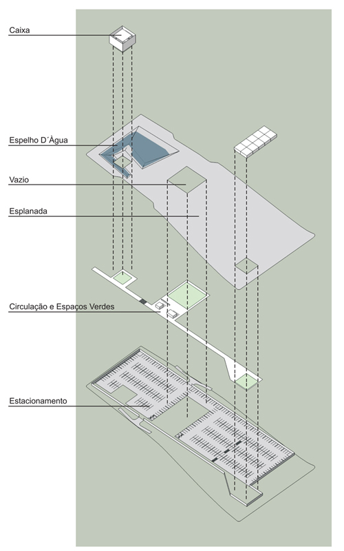 Como se fizesse uma analogia aos Três Poderes, três espaços vazios articulam e conectam todas as funções que pertencem ao programa. Destes espaços emergem ou abrigam-se funções variadas. Abrigam-se, no subsolo, estacionamento e prestações de serviços, ligadas por um eixo de circulação e áreas verdes. Emergem, funções de lazer apoiadas por cafés, em cada extremidade da praça, um térreo integrado com a paisagem e outro elevado junto do horizonte.