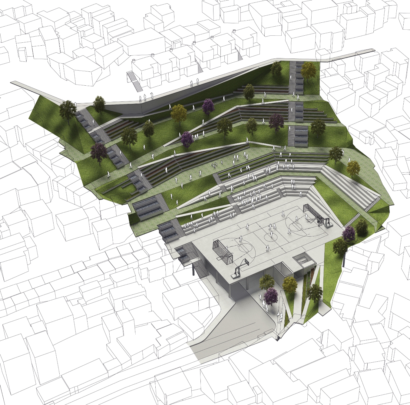 O prêmio Prata do Global Holcim Awards foi concedido para um projeto que transforma uma paisagem erodida em uma zona produtiva e um espaço publico dinâmico. Com mais de 100 mil habitantes, a favela de Paraisópolis em São Paulo é uma das maiores comunidades informais do mundo. O projeto liderado pelos arquitetos Alfredo Brillembourg e Hubert Klumpner da Urban-Think Tank, inclui espaço público com terraços e áreas para agricultura urbana, um sistema de gestão de água, um anfiteatro público, uma escola de música, uma pequena sala de concertos, instalações esportivas, espaços públicos e infraestrutura de transportes. O projeto impede uma erosão ainda maior e perigosos deslizamentos de terra nas encostas íngremes, além de fornecer infraestruturas social e cultural.