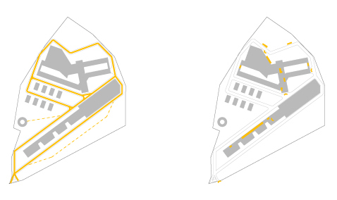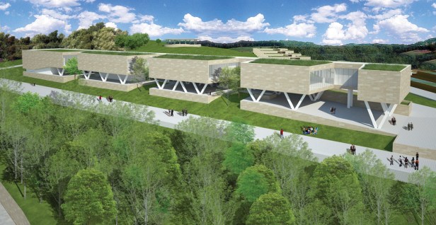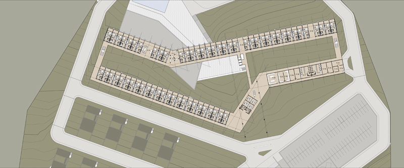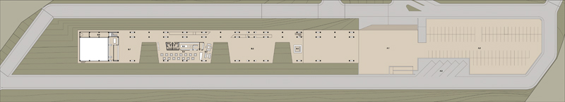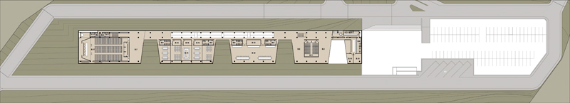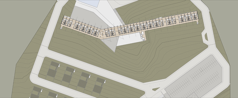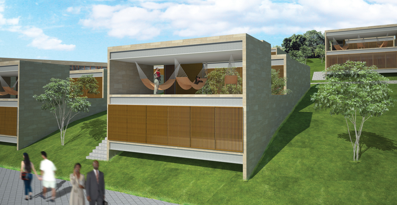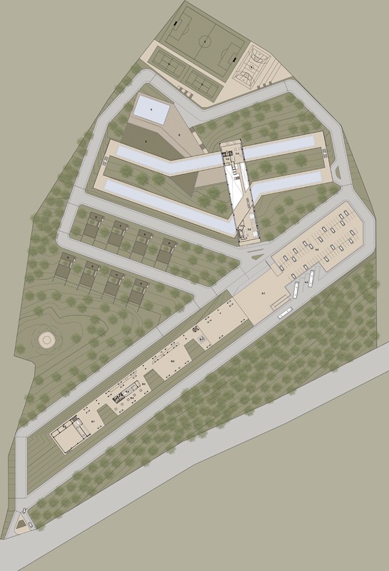 As vias internas serão em pisos permeáveis para recarregar os aquíferos e preservar a vegetação natural, bem como a praça de interação e os estacionamentos dos carros e ônibus.