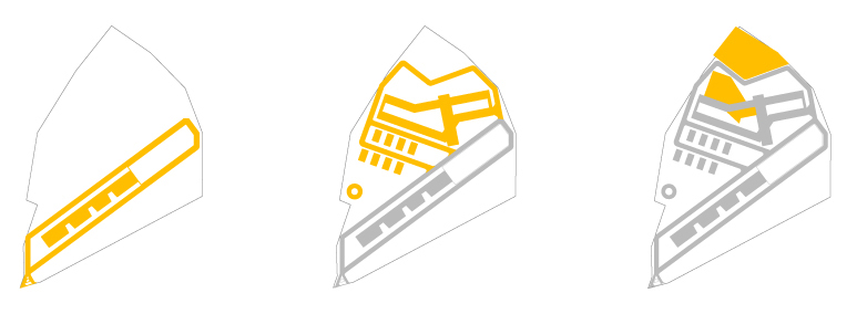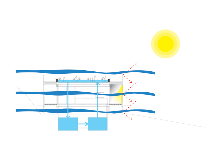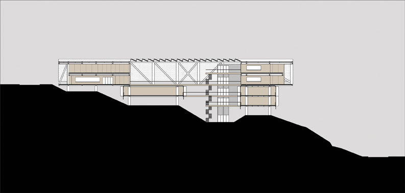 Segunda fase da construção, o Hotel, nasce do desejo de manter as visuais das cotas médias do terreno sem interferência, desta forma, a cobertura do hotel está na mesma cota das vias internas principais, cota 45. O edifício é dividido em duas lâminas que acompanham as curvas do terreno e criam um pátio interno generoso, com a declividade natural do terreno, no qual há um paisagismo com função de sombreamento e privacidade. O acesso é feito por um prisma retangular pousado perpendicularmente sobre esta cobertura, onde se encontram a recepção, restaurante, show room de sustentabilidade e espaço de eventos, dos quais a vista é privilegiada. A estrutura é composta por pilares e vigas metálicas, sobre os quais se apoiam lajes steel deck, que devido ao vão de 4 metros, não necessitam de escoras para serem montadas, agilizando e racionalizando o processo construtivo. As divisórias dos quartos são em gesso acartonado, com isolantes térmicos e acústicos. As áreas dos dormitórios são envoltas por venezianas de bambu com sistema de abertura “tipo camarão”, que conferem maior privacidade aos quartos, permitem entrada de luz e barram o raios solares, além de proporcionar a opção de ventilação natural cruzada quando combinada com a veneziana da porta de acesso ao dormitório. Os dormitórios foram projetados atendendo as normas e especificações da EMBRATUR para hotéis 5 estrelas e 5 estrelas super luxo. Na cobertura, uma lâmina d’água aumenta a inércia térmica. Esta lâmina é composta por águas provenientes das chuvas, sendo um reservatório de retardo para lançamento das águas pluviais e também das águas cinzas dos dormitórios. Para a limpeza e qualidade da água é empregado o sistema de plantas macrófitas que além de limparem as águas trazem conforto visual a cobertura, aliando assim paisagismo e sustentabilidade. Placas solares para aquecimento de água e painéis fotovoltaicos completam o sistema de cobertura do hotel.