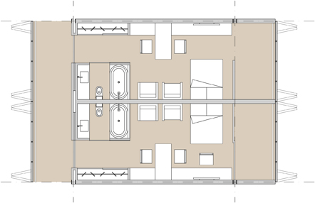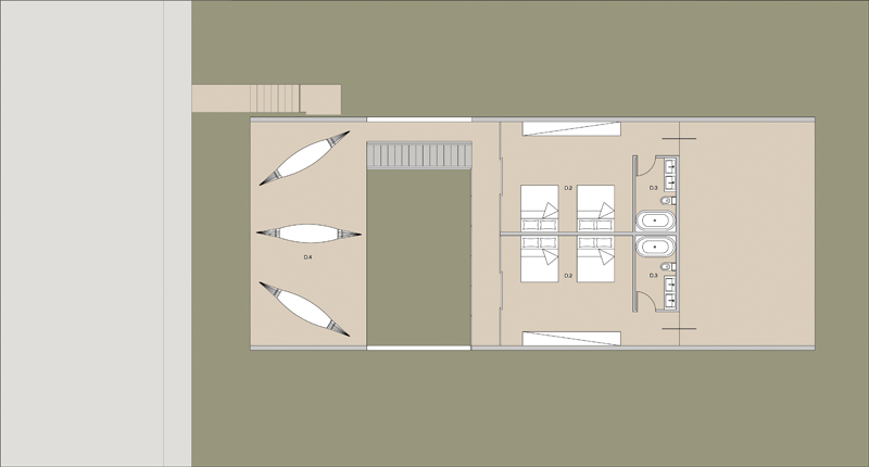 Os Bangalôs, também serão executados nesta etapa. Estes ficam próximos as áreas sociais, porém encontram-se mais reservados. De construção simples, paredes portantes, travadas por vigas metálicas, nas quais se apoiam as lajes, possuem plantas livres, permitindo grande flexibilidade de uso. O pátio interno e desalinhamento vertical entre o espaço social e intimo, permite privacidade e que as visuais não sejam interrompidas onde quer que se esteja.