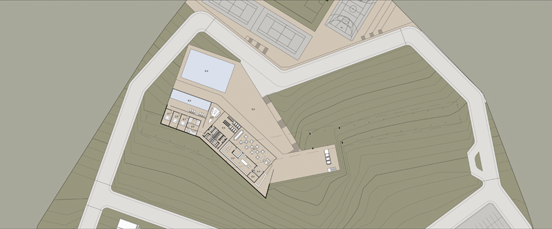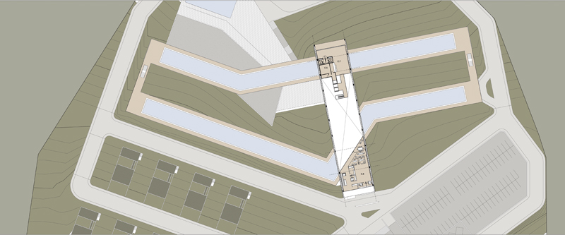 O sitio possui uma topografia bem irregular e de implantação complicada, mas o projeto procurou respeitar a geografia existente, fazendo poucos ajustes no terreno para acomodar as vias e o programa dos edifícios e tirando proveito dos desníveis naturais para integrar e segregar. Desta forma, temos os acessos do Centro de convenções e o Hotel integrados por uma praça, mas com os seus respectivos usos preservados pelos desníveis.