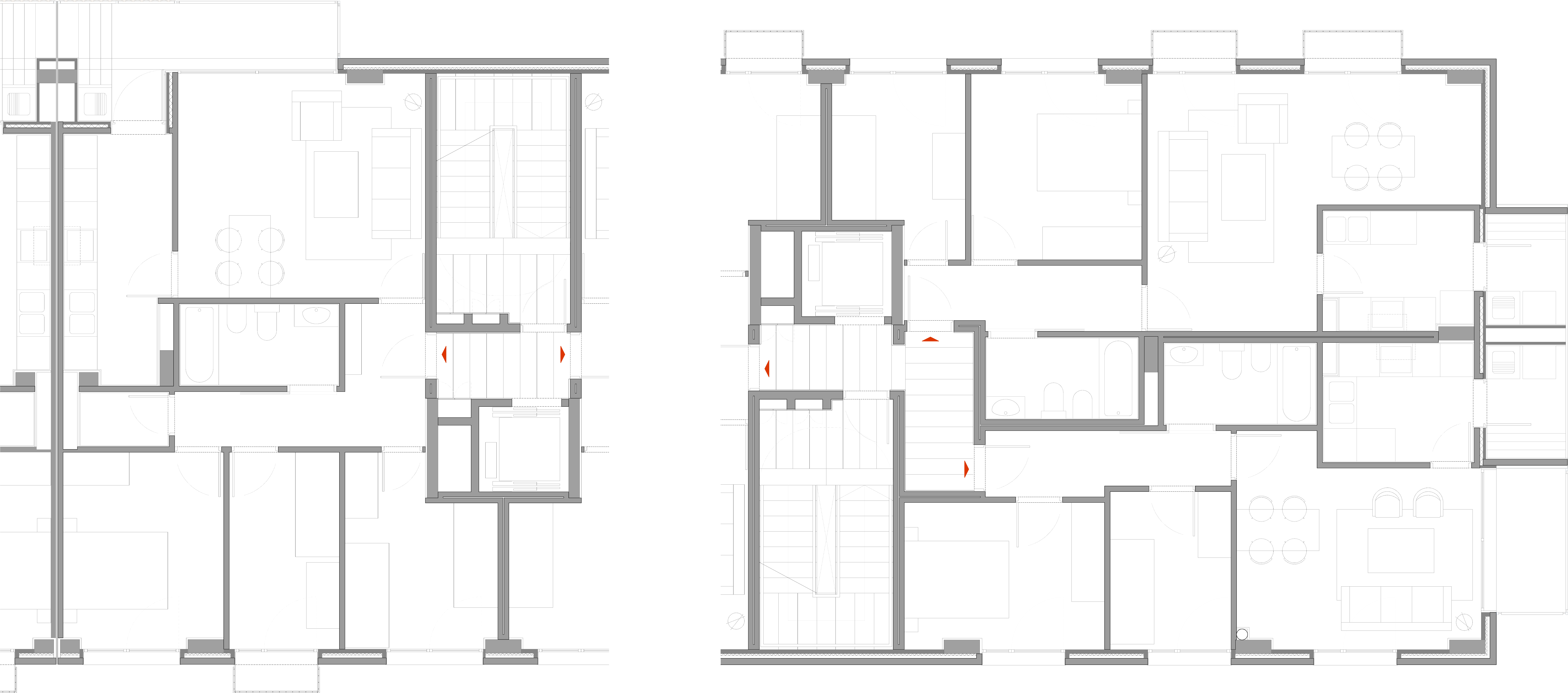 São 6 núcleos de circulação vertical, que pelo pátio interno dão acesso a um total de 14 unidades por pavimento, em grupos de 2 ou 3 unidades por núcleo. Na tipologia padrão, os quartos são voltados para a rua e as áreas de estar, cozinha e terraço para o pátio.