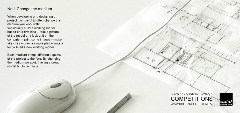 Quando estiver desenvolvendo e concebendo um projeto é importante mudar os meios e instrumentos com os quais se está trabalhando: em geral nós construímos uma maquete de estudo baseada na primeira ideia – fotografamos a maquete e analisamos a imagem no computador, imprimimos algumas imagens, fazemos croquis, desenhamos plantas esquemáticas, escrevemos textos e depois, construímos um novo modelo… Cada meio ou instrumento oferece aspectos distintos do projeto. Ao mudar o meio e a forma de olhar o projeto, evitamos criar projetos que são excelentes maquetes, porém soluções funcionais terríveis.