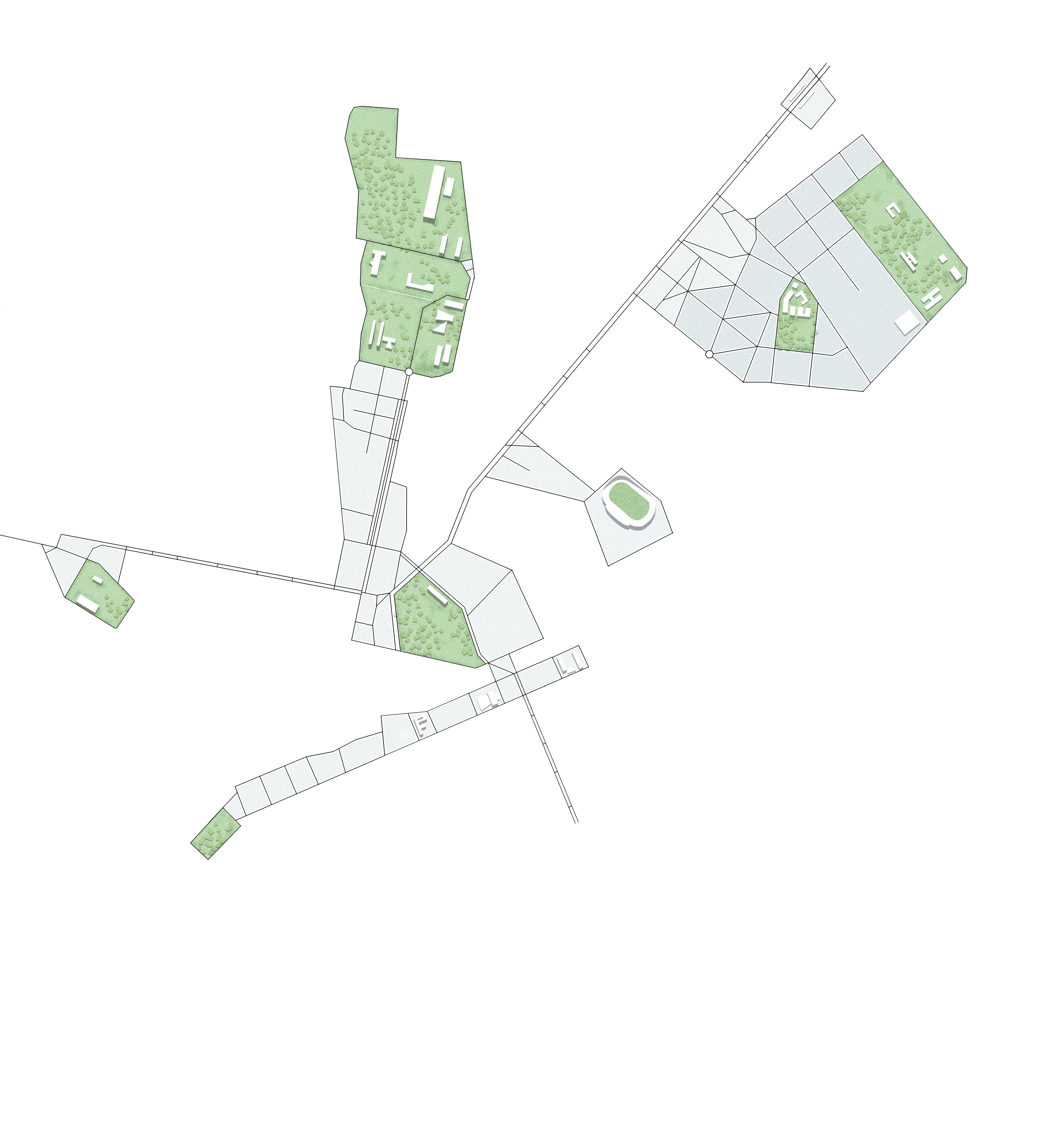Praça existente (verde) viabiliza a ideia de campus universitário (field). Por se tratar de um edifício educativo universitário foi necessário ressaltar o seu caráter cívico, a sua