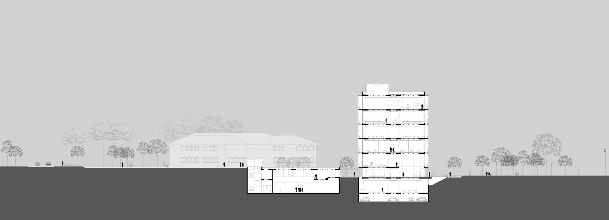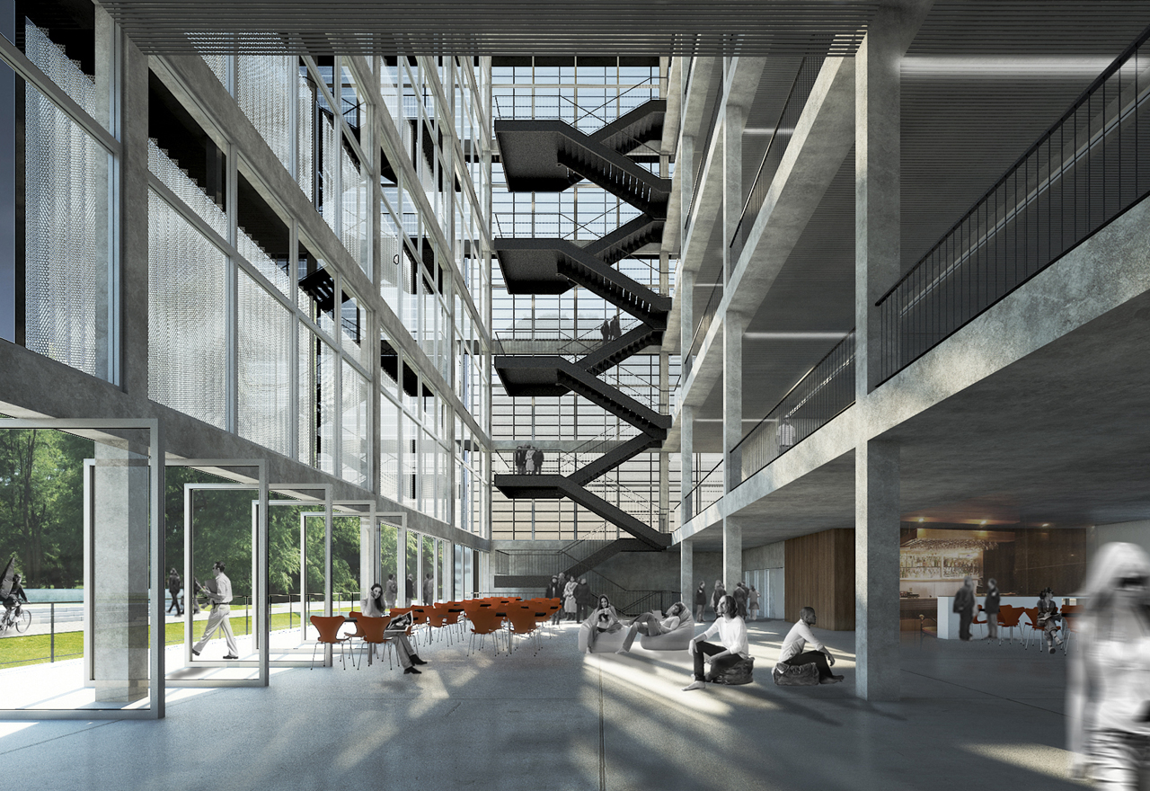 Sua superestrutura é simples, econômica, exequível e flexível. Sua solução é amplamente difundida e será realizada em concreto armado. Pilares modulados em vãos múltiplos de 0,625 m. (10×9,375 e 10×3,75) As lajes são nervuradas de 40 cm de espessura. Unicamente no auditório maior, prevemos o uso de vigas protendidas para viabilizar o seu vão livre. Os subsolos terão cortinas de concreto armado com paredes interiores para garantir a estanqueidade do complexo localizado abaixo da cota natural do terreno. Os dois núcleos de circulação vertical funcionam como peças rígidas e colaboram no contraventamento da estrutura. As estruturas serão tratadas e deixadas aparente e colaboram na imagem formal buscada.