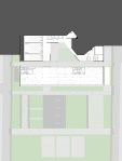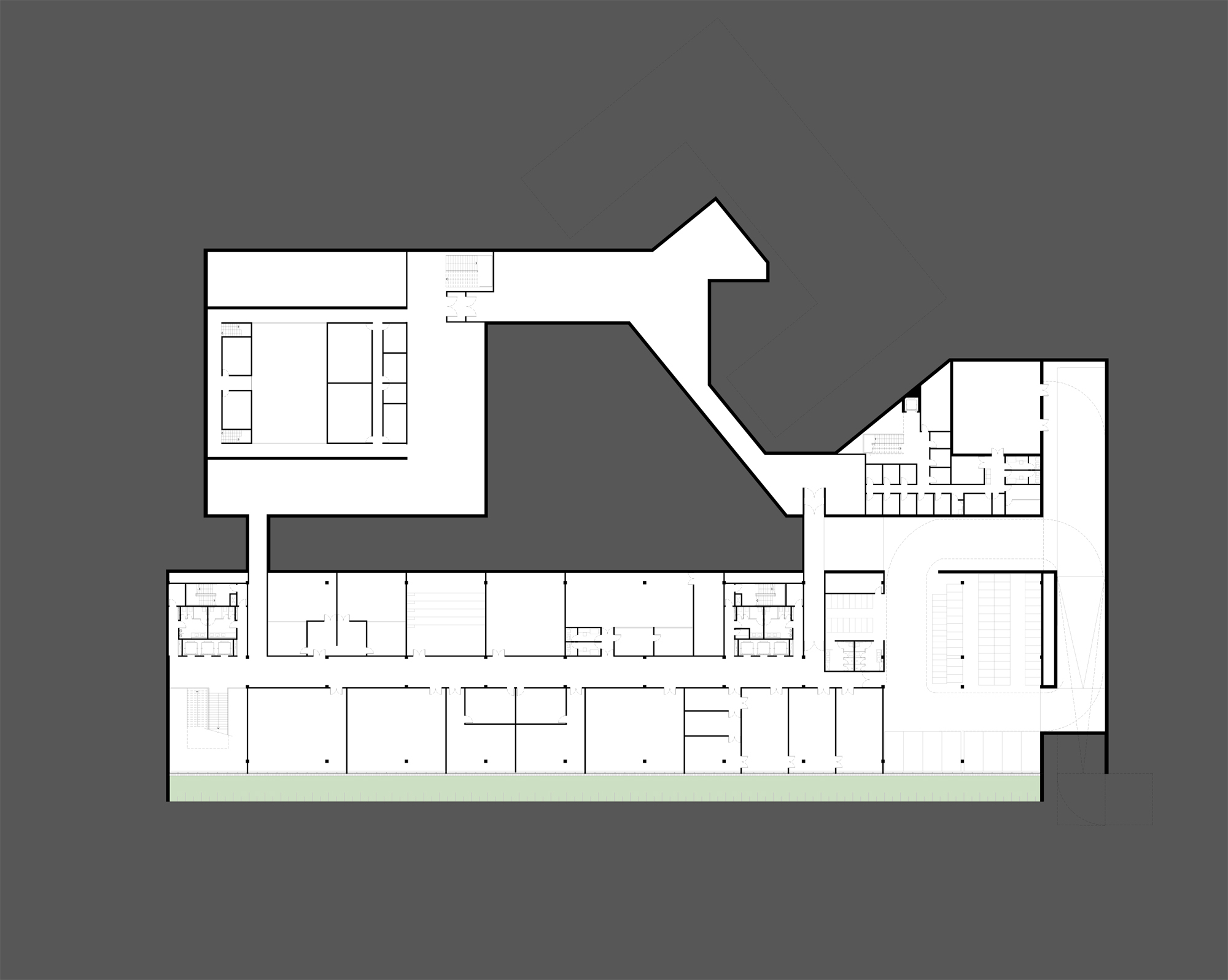 A peça de costura abdica de protagonismo, libera a edificação antiga, será percebida unicamente de dentro do pátio interno.