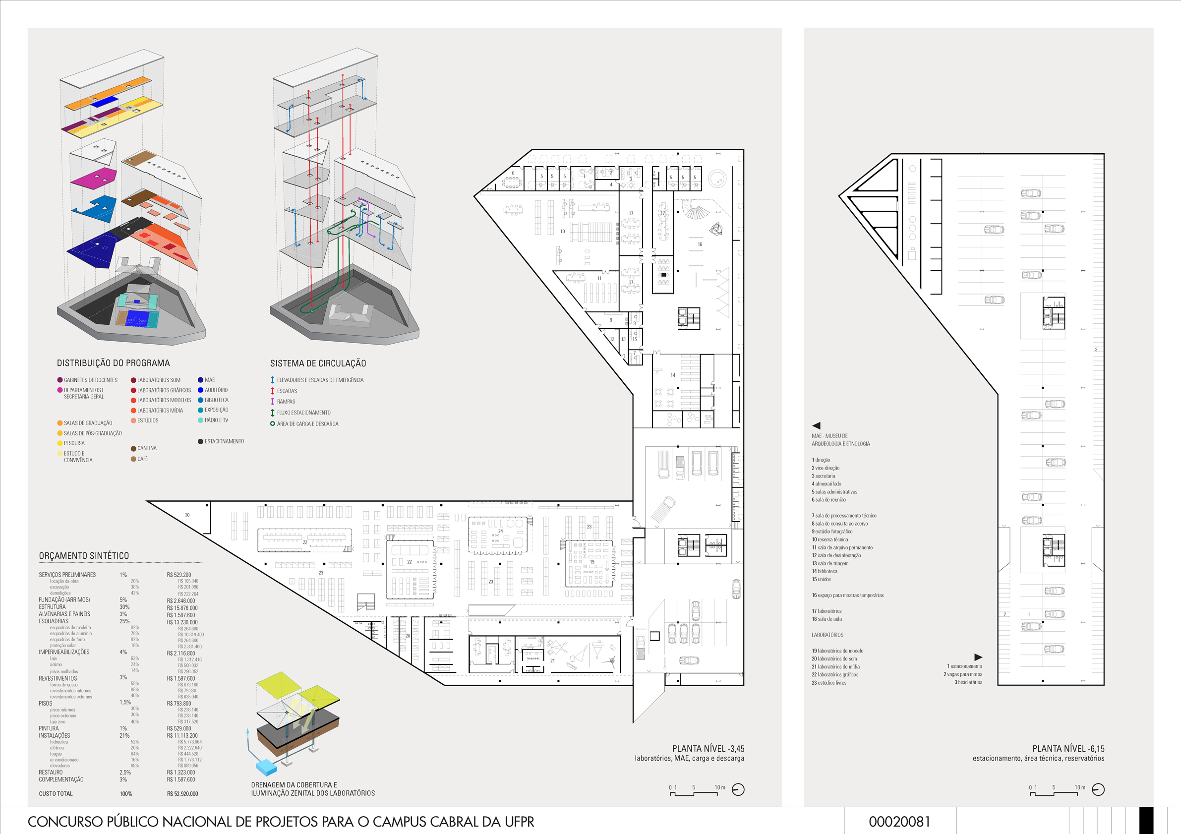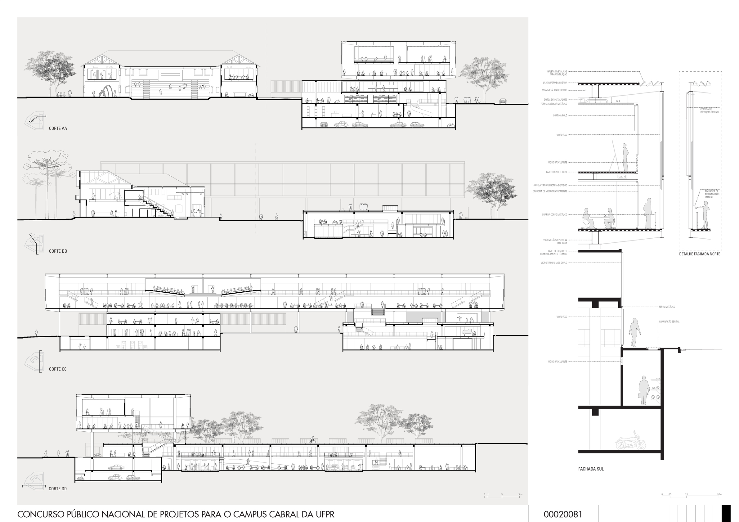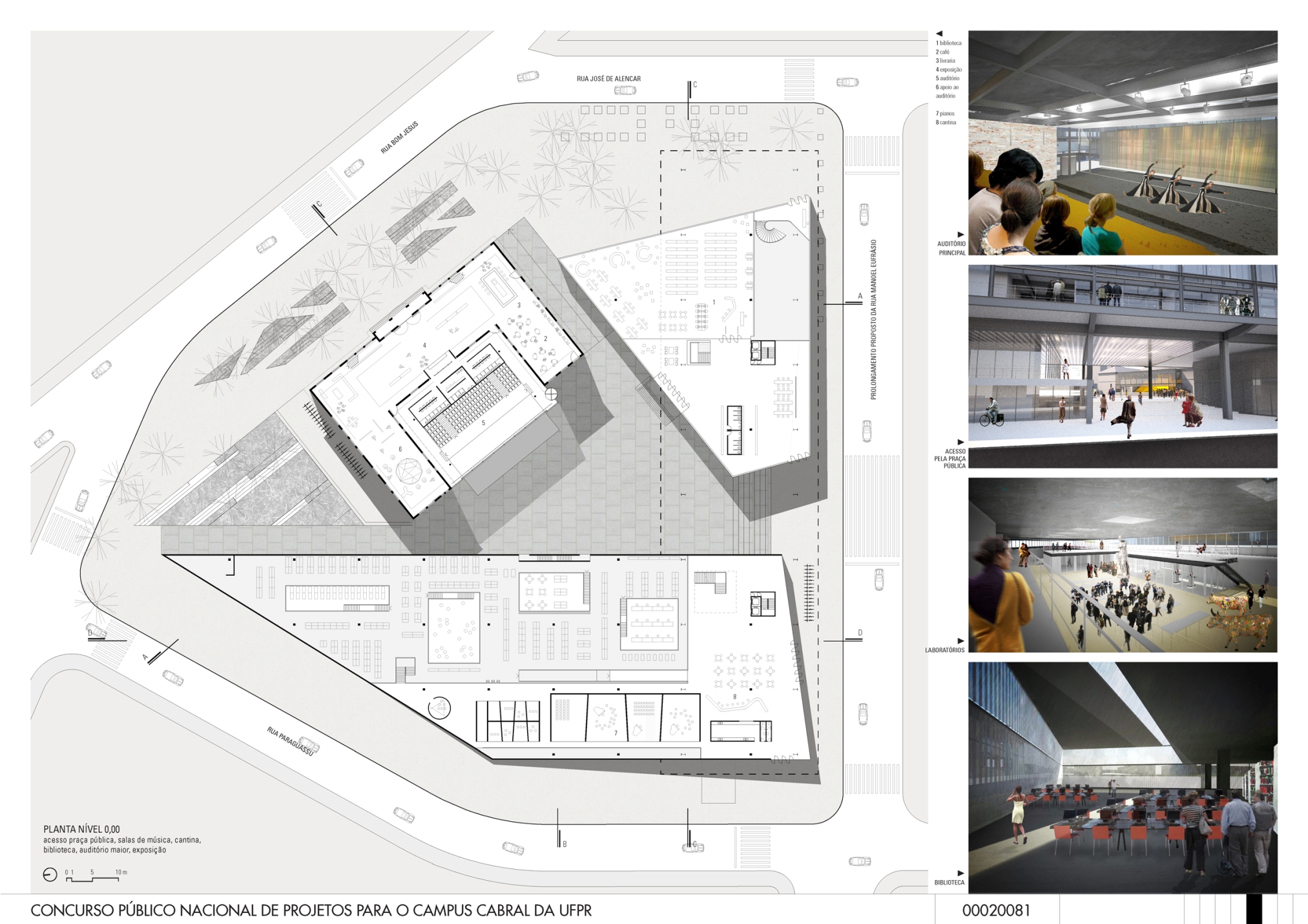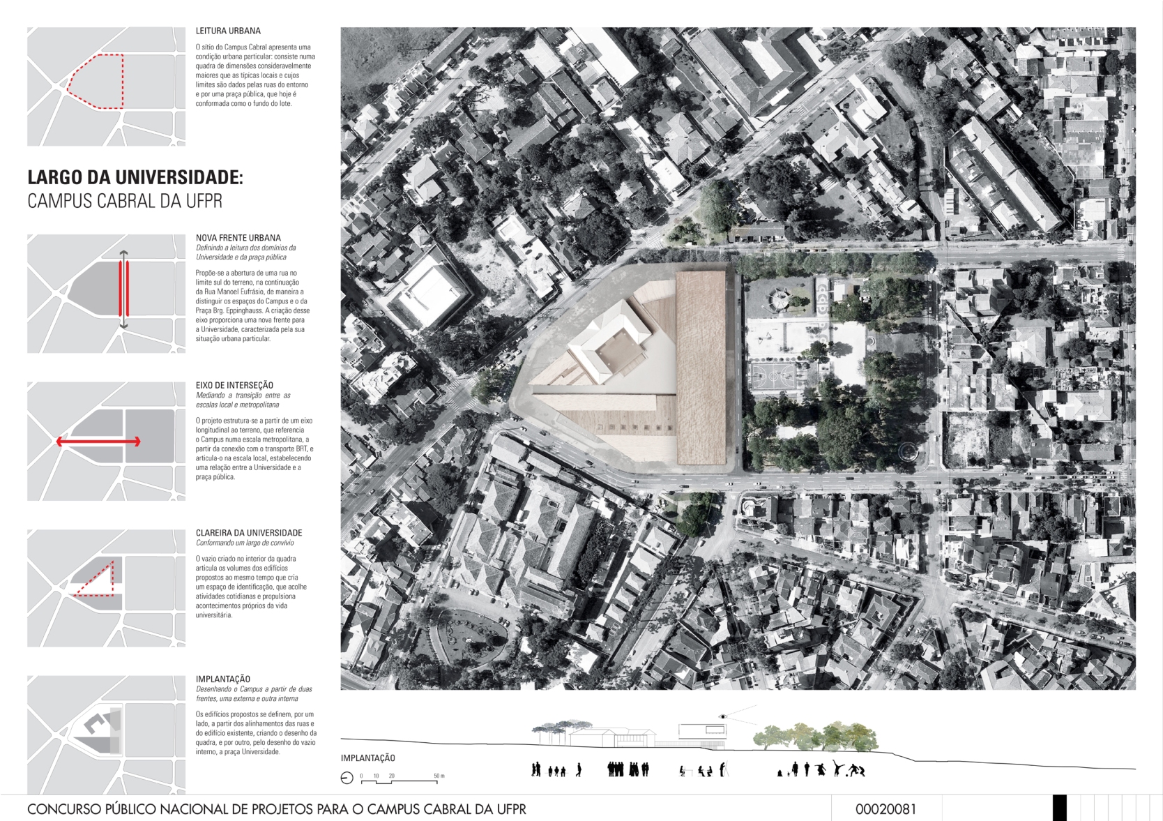 O projeto estrutura-se a partir de um eixo longitudinal ao terreno, que referencia o Campus numa escala metropolitana, a partir da conexão com o transporte BRT, e articula-o na escala local, estabelecendo uma relação entre a Universidade e a praça pública.