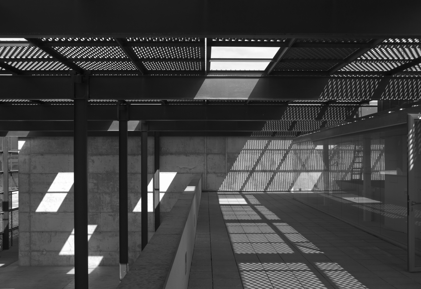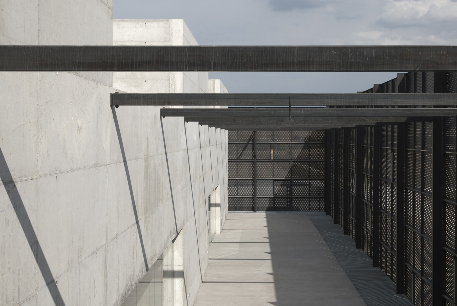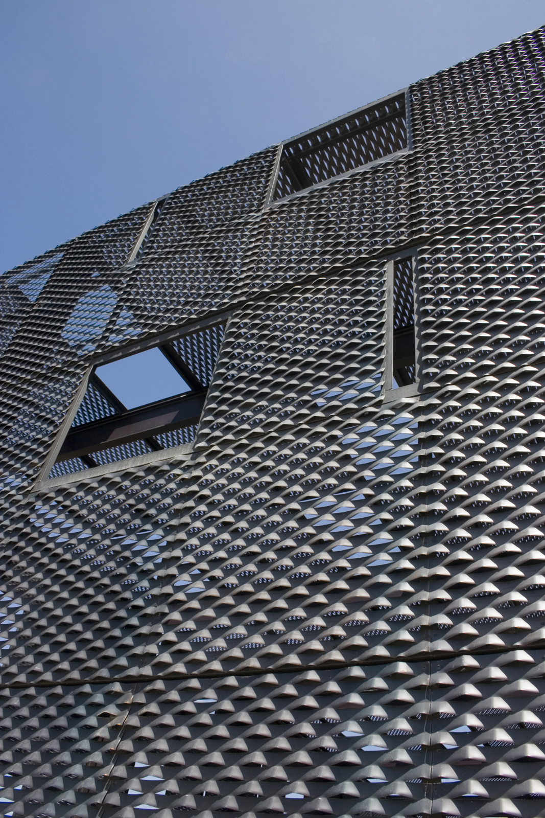 O invólucro exterior leve tem um caráter descontínuo, é perfurado ou desaparece em pontos singulares como a entrada. Essa malha gera uma diversidade espacial na área de acesso com relações muito fortes entre o espaço aberto da praça e o espaço do terraço-mirante, em contraste com a austeridade da caixa exterior.