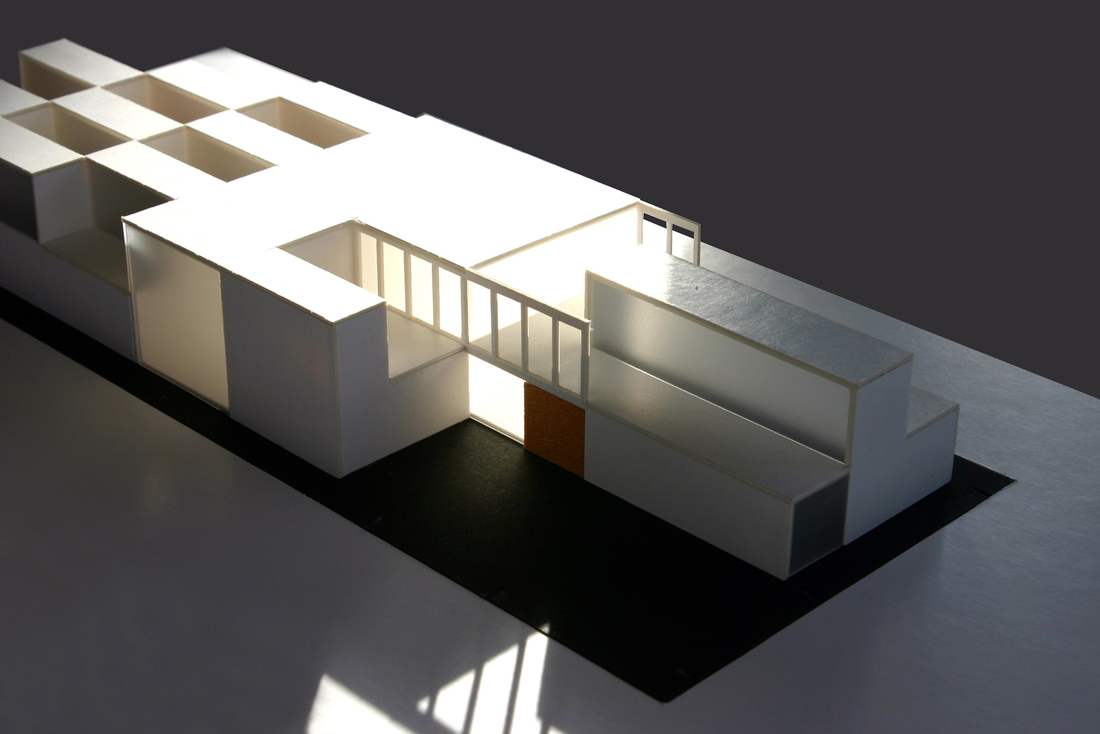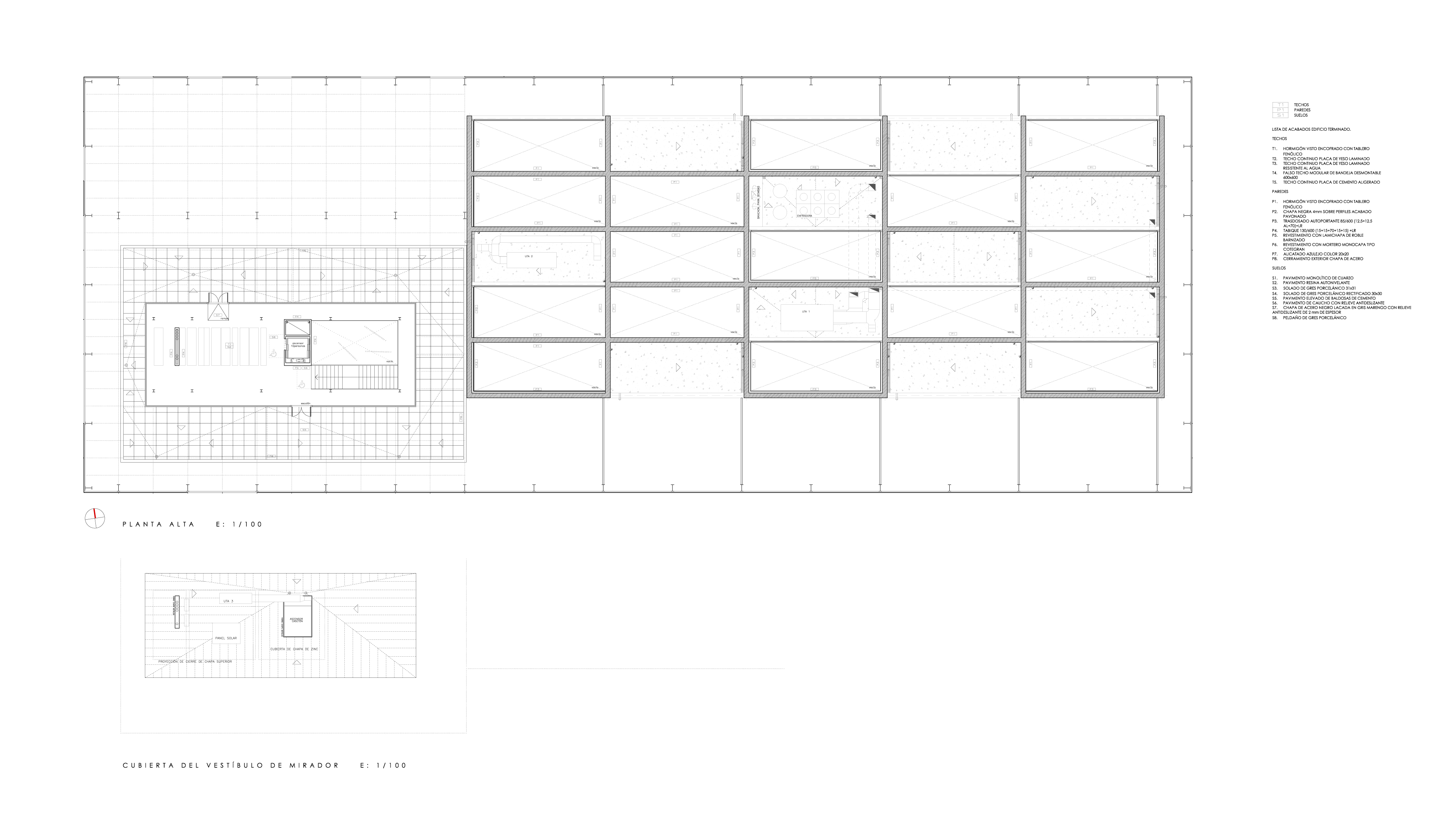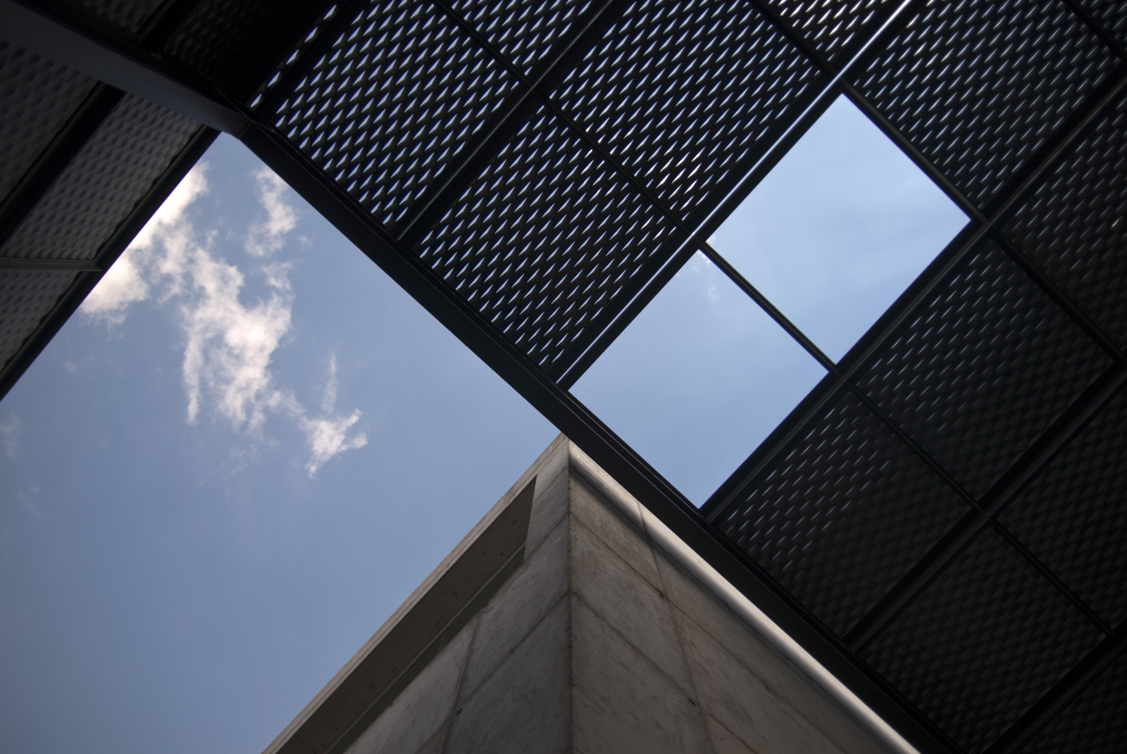 O invólucro exterior leve tem um caráter descontínuo, é perfurado ou desaparece em pontos singulares como a entrada. Essa malha gera uma diversidade espacial na área de acesso com relações muito fortes entre o espaço aberto da praça e o espaço do terraço-mirante, em contraste com a austeridade da caixa exterior.