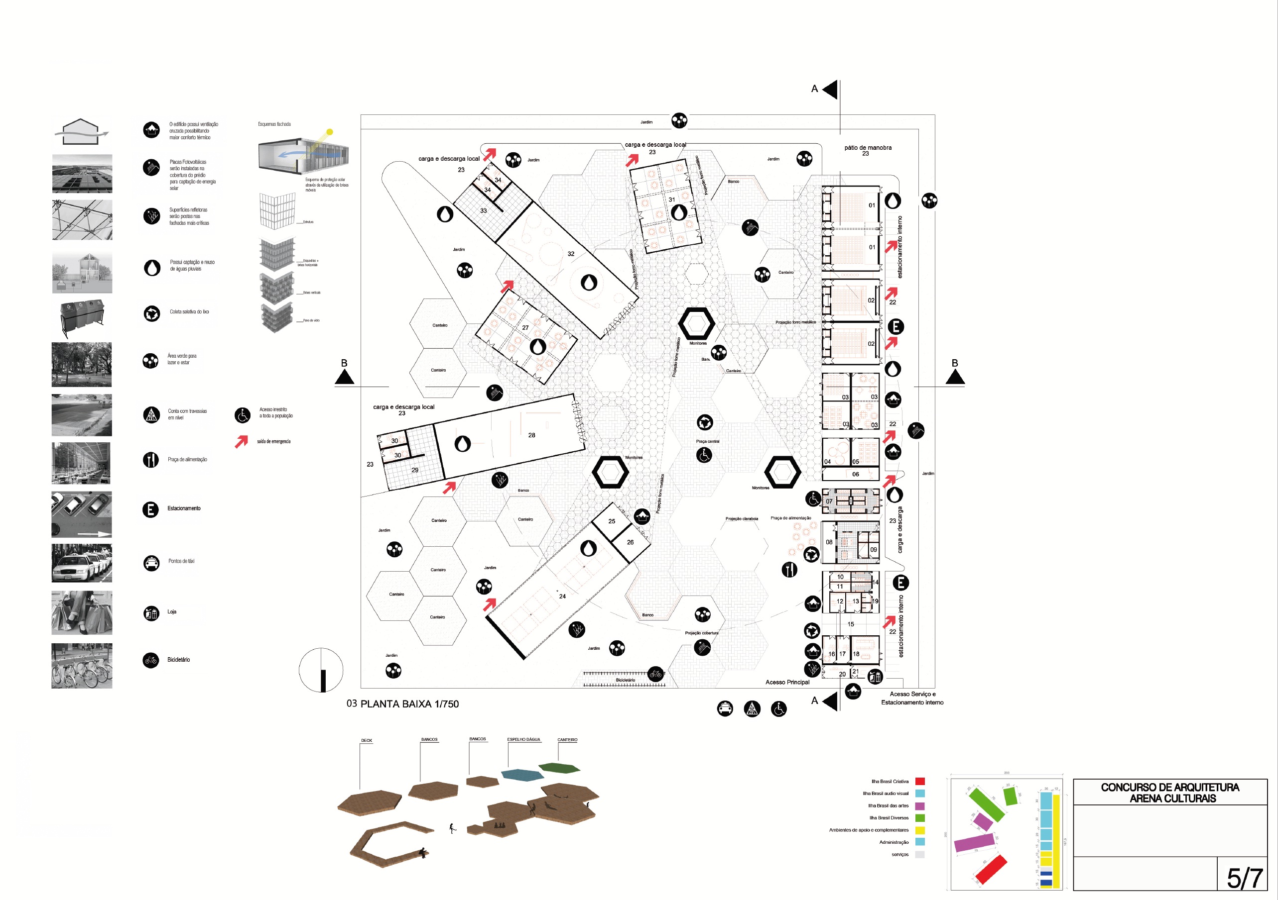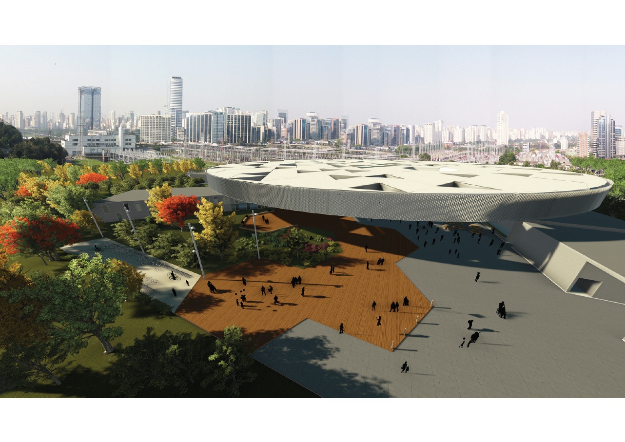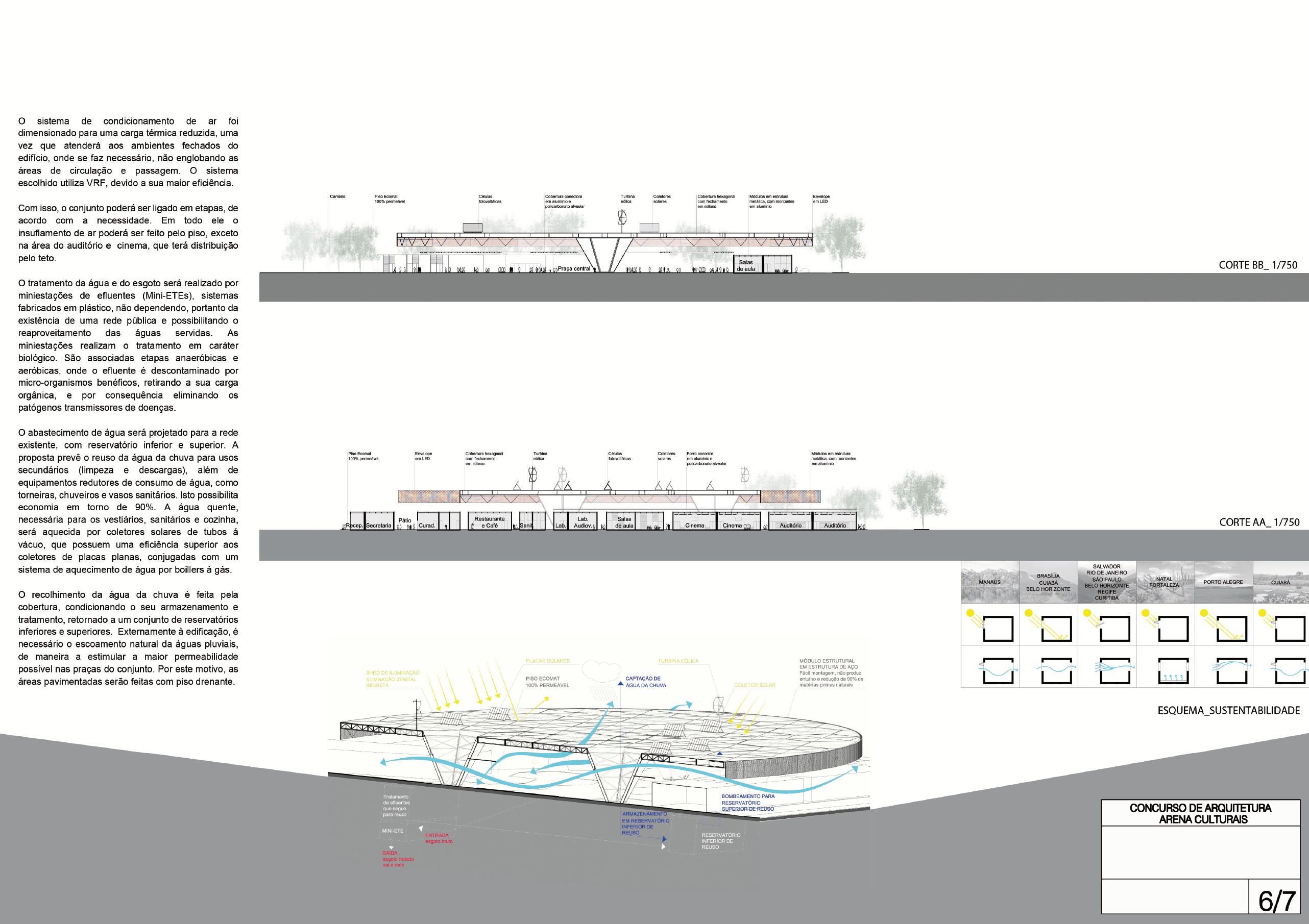 Na essência, Arena é um local de convergência do olhar e de concentração de pessoas. O espaço proposto é coberto, estabelecendo amplo abrigo aos frequentadores. Esta cobertura apresenta-se de forma circular, como um disco que paira sobre o terreno e edifícios. Este disco é composto pela mesma lógica estrutural presente na tradicional bola de futebol – a forma hexagonal de sua costura. Seu anel, formado por hexágonos de leds são controlados por computador, fazendo com que este envelope DIGITAL se apresente como o elo comunicador do evento, um “placar eletrônico” que interage com a população da região e comanda a festa.