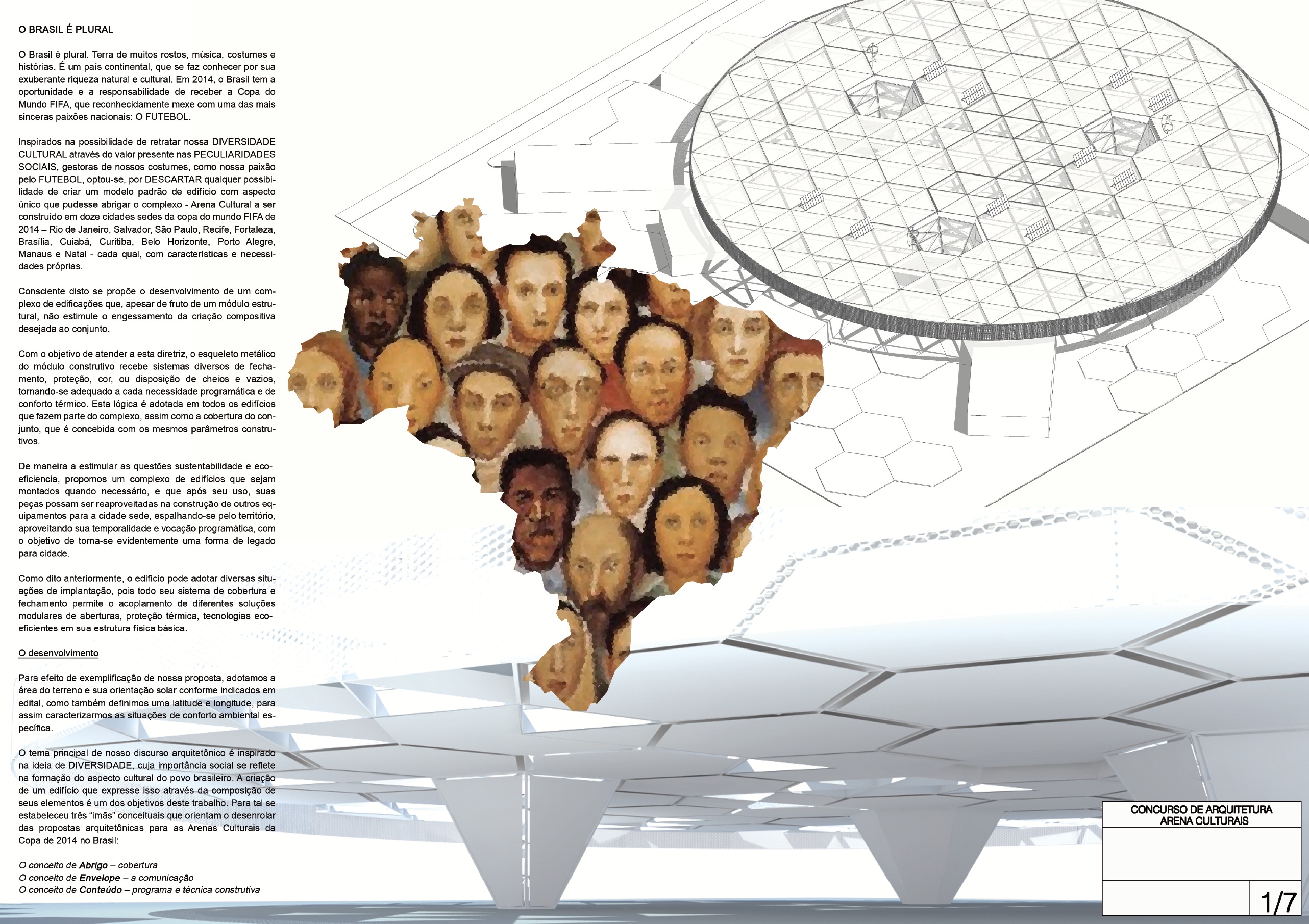 Inspirados na possibilidade de retratar a DIVERSIDADE CULTURAL do Brasil, nossa equipe propõem a construção de um edifício que, como parte da cidade, adote em sua construção a valorização de conceitos como: flexibilidade, a mutabilidade, a sustentabilidade e a adaptabilidade.