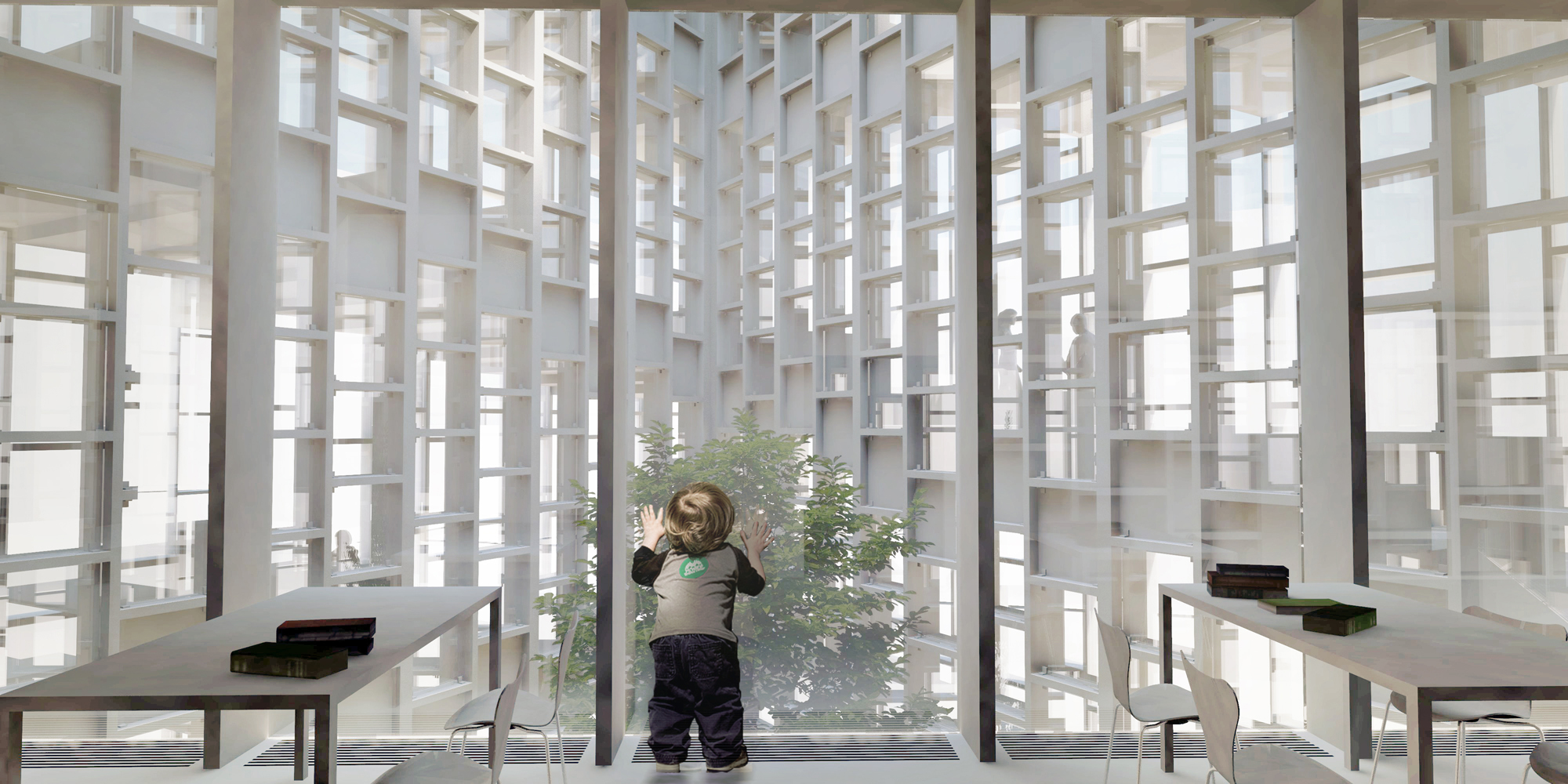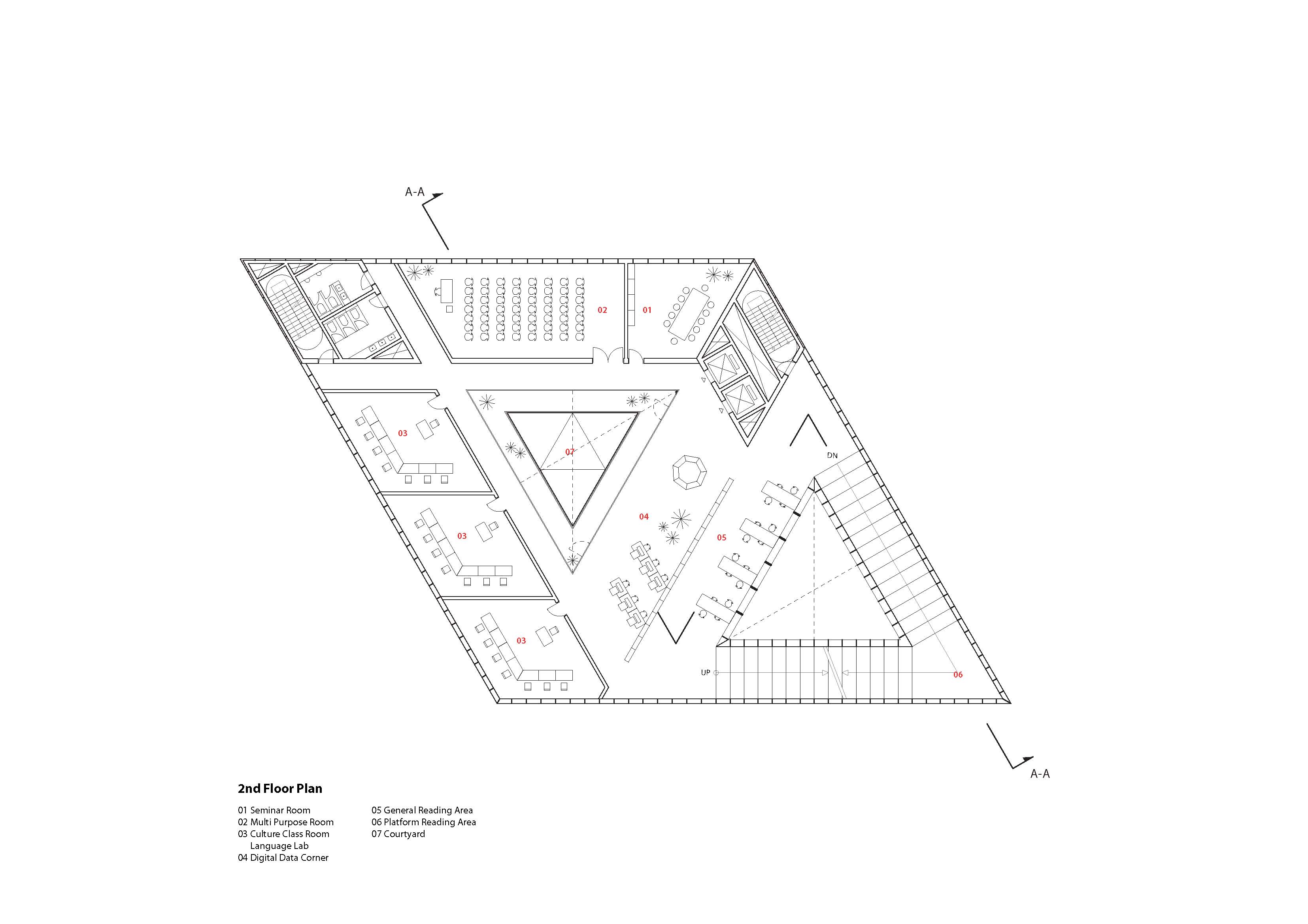 A maioria das pessoas imagina bibliotecas compostas por grandes plataformas, totalmente equipadas com fileiras de mesas e estantes empilhadas umas sobre as outras, com rígida divisão de programa no edifício. No entanto, o segundo  lugar proposto por Seung Hyun, Yuh e Se Hyeon, Kim do studio SH para a tipologia da nova biblioteca para Gosan propõe uma quebra dessa tendência hierárquica. Desafiando esse limite estrito e proporcionando flexibilidade em seu programa de biblioteca, o “White Diamond” torna-se não apenas um local para explorar o conhecimento, mas também um espaço para meditação com diversas experiências públicas e privadas.