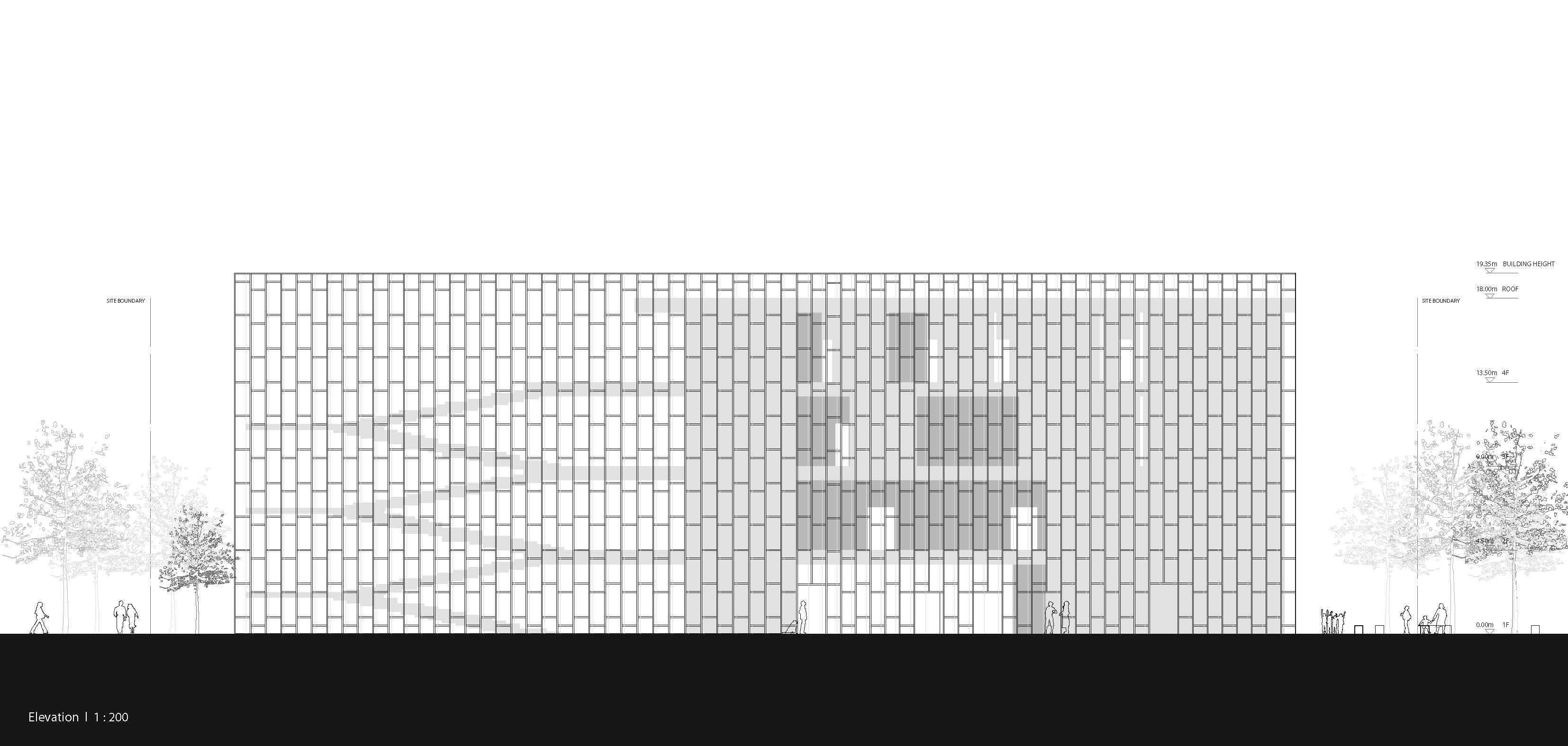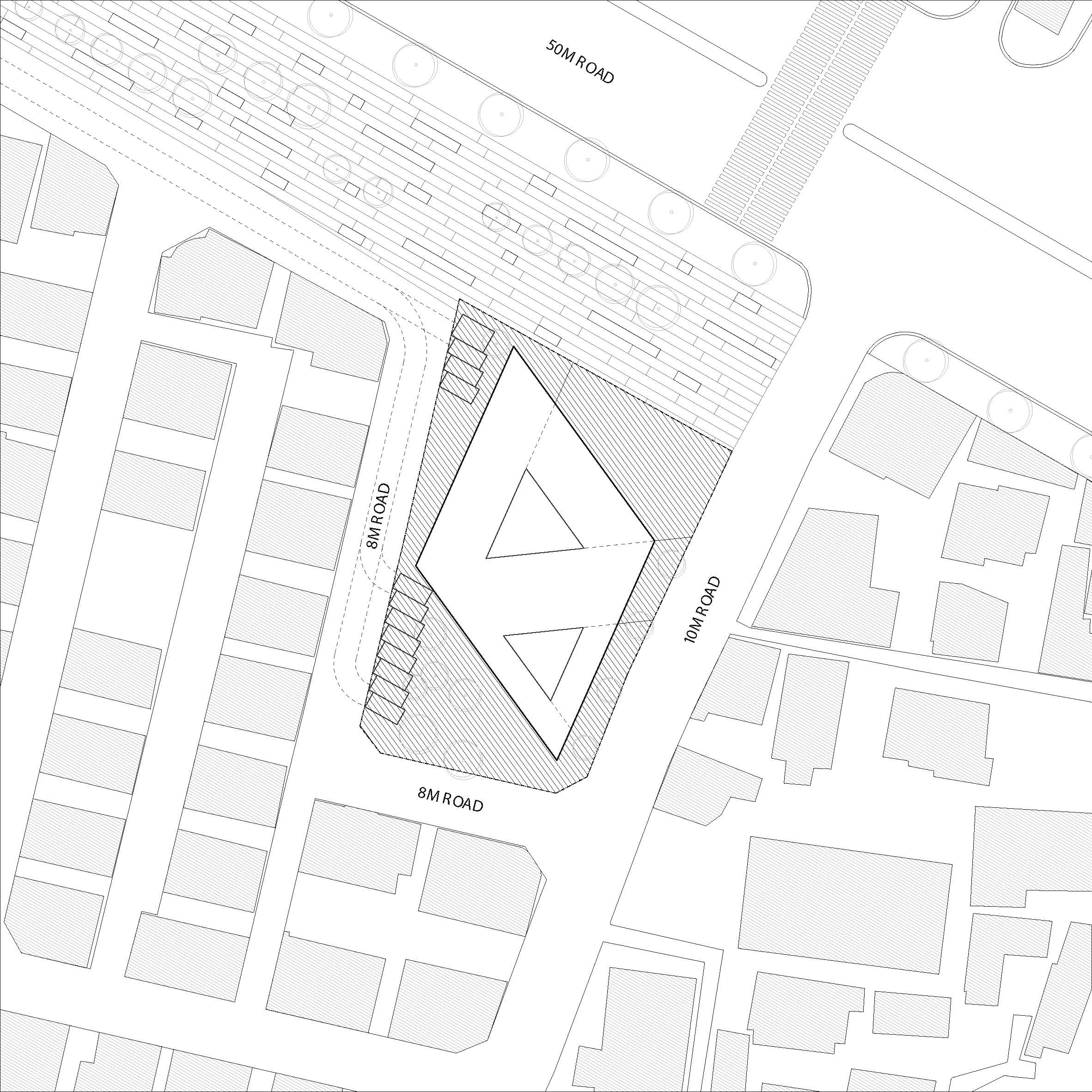 O local onde a nova Biblioteca Gosan será implantada em uma área residencial voltada diretamente para a estrada principal. Embora a porção norte do lote seja relativamente aberta, os outros três lados são tranquilos, próximos da vizinhança residencial. Assim, a inserção de uma caixa típica geraria uma atmosfera muito densa, que poderia não  ser aceita pela comunidade. Dois lados do volume, um de frente para a vista norte da estrada principal e o outro no lado sul, são cortados no sentido diagonal para criar uma atmosfera mais aberta no terreno. Além disso, esses espaços de corte seriam convertidos em praças e pequenos parques para atrair os pedestres.