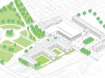 O edifício, marcado pela ortogonalidade, é paralelo às fachadas da escola de ensino médio e da Câmara Municipal. Desta forma, contribuimos para redefinir e melhorar os espaços urbanos, bem como ligar o parque à igreja por meio de um percurso urbano. O desenho desse novo espaço público, portanto, é marcado pela regularidade, que é definida pelos edifícios circundantes.