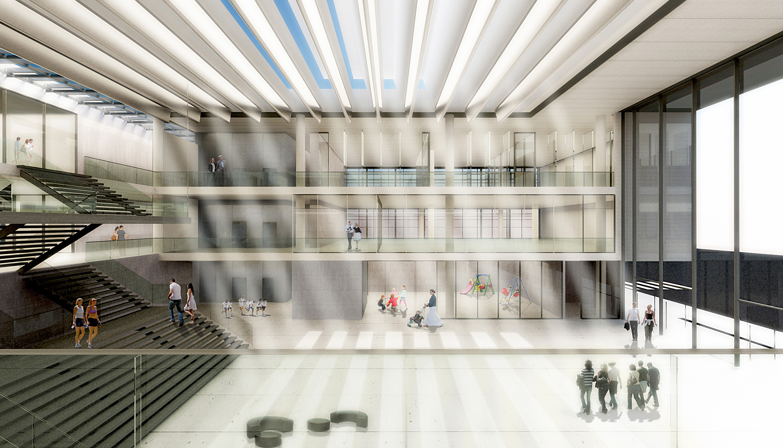 Em termos hierárquicos, assumimos a praça – convivência como a essência espacial do projeto, seja pela função estratégica como hall de acesso, estar e distribuição, seja pelo volume que mobiliza. Os três pavimentos que se voltam a ela abrigam as funções mais coletivas, nutrindo o ambiente de uma atmosfera lúdica e intensa, ao mesmo tempo em que preserva a particularidade dos espaços. A ideia é que se apresente como uma extensão da rua, ligando a calçada ao jardim ao fundo, sedimentando os pontos de convívio: estar, foyer, cafeteria etc. Na cobertura, um sistema zenital inunda o espaço com uma luz difusa e funciona como coletor de águas de chuva.
